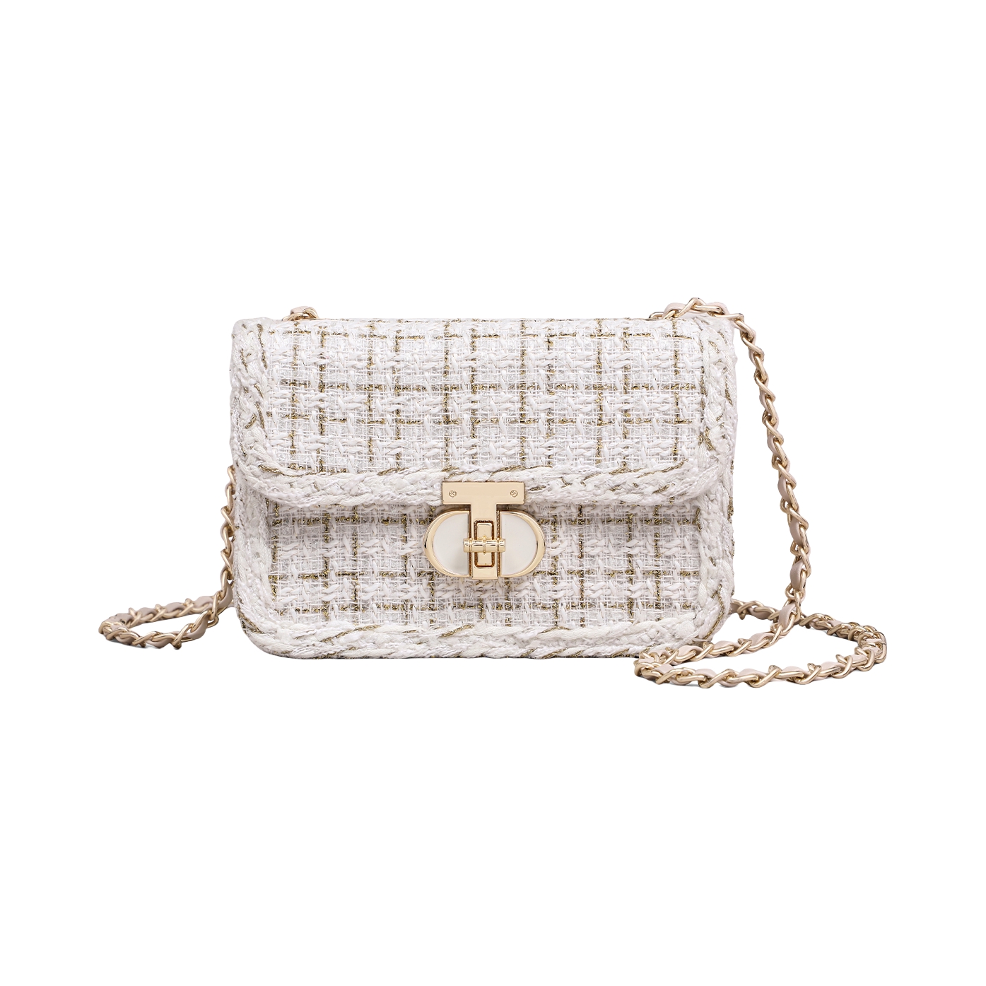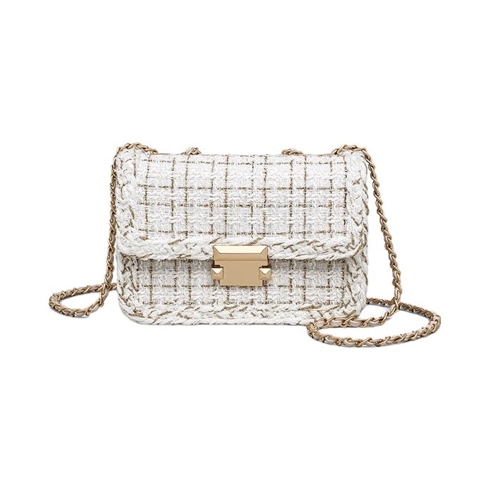 这款小香风方包,白色编织纹理混着细闪,和金色链条搭在一起超有精致感。配针织长裙出门,温柔又有气场,肩带能调节长度,单肩斜挎都很顺手。小小一只装得下手机、口红和粉饼,节日约会拎着超合适,百元价位能买到这种质感真的很惊喜。