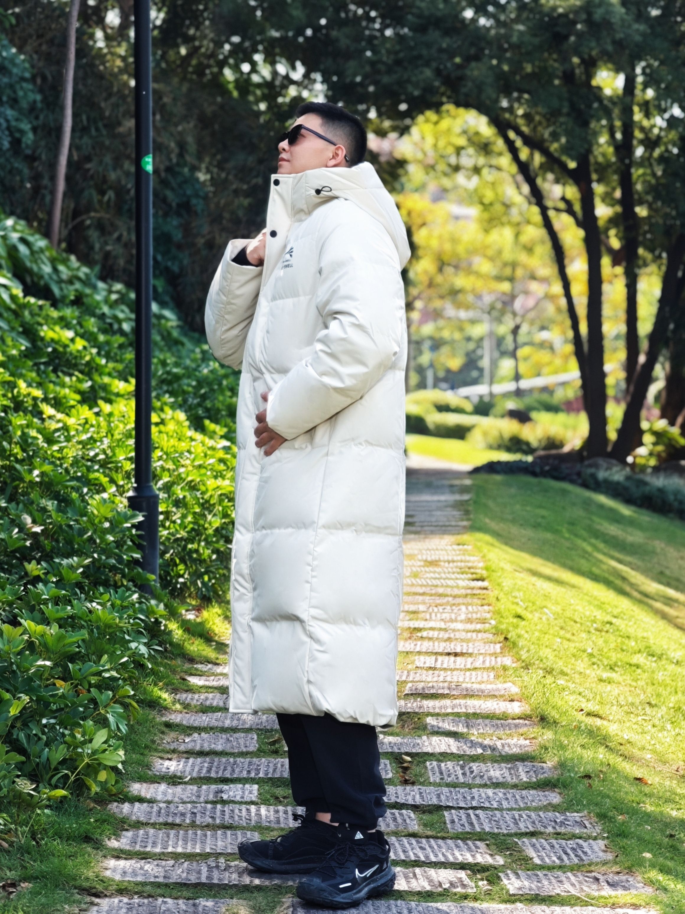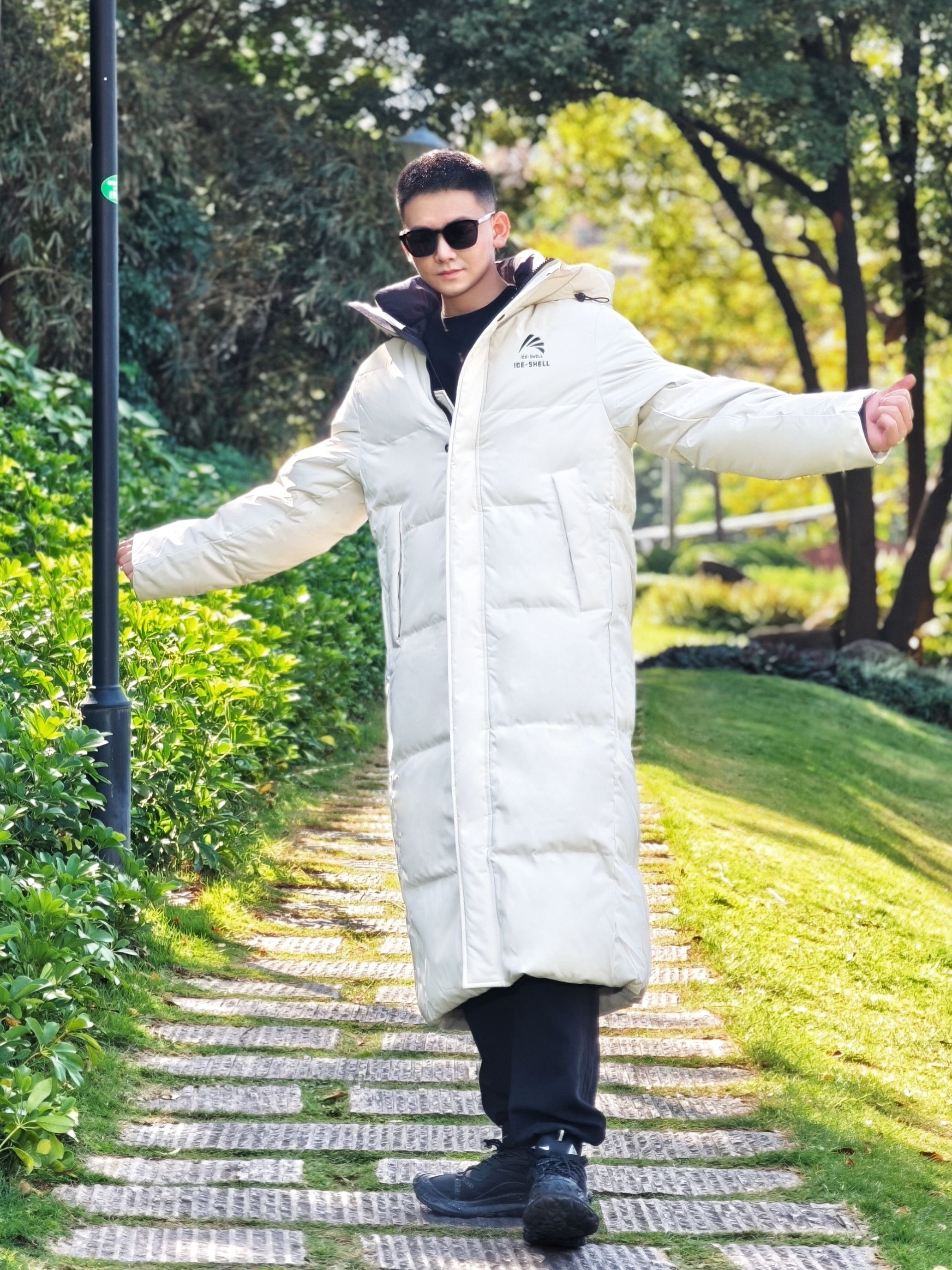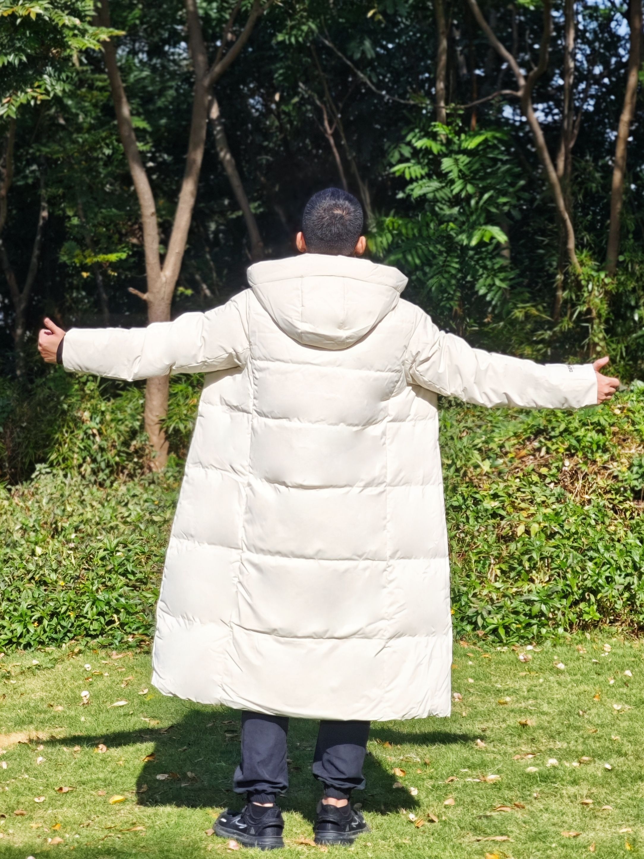 今天降温了但阳光很好,穿了这件鸭鸭冰壳系列长款羽绒服去公园散步。我身高175cm/75kg,穿L码很合身,是想要的上身效果。 米白色在阳光下看起来很舒服,中系风的版型确实不挑身材。在草地上走了半小时,石墨烯保暖材料确实有用,身体一直很暖和,也没有羽绒服常见的厚重感。 帽子足够宽大,戴上后防风效果明显。表面有防泼水处理,在枯草地上沾了露水也没渗进去。整体是干净的学院风,搭配休闲裤或者运动裤都挺协...