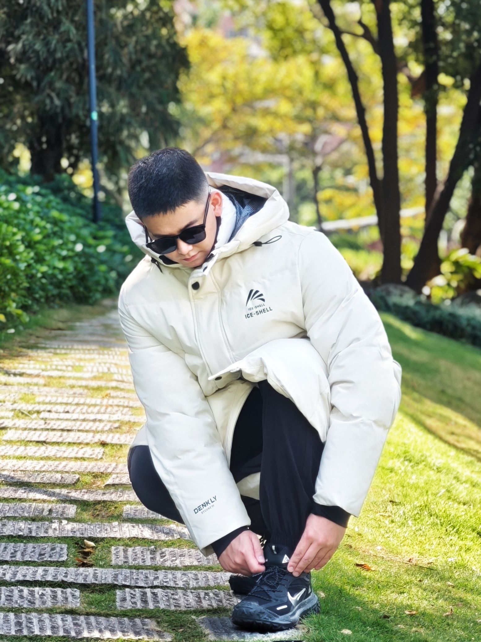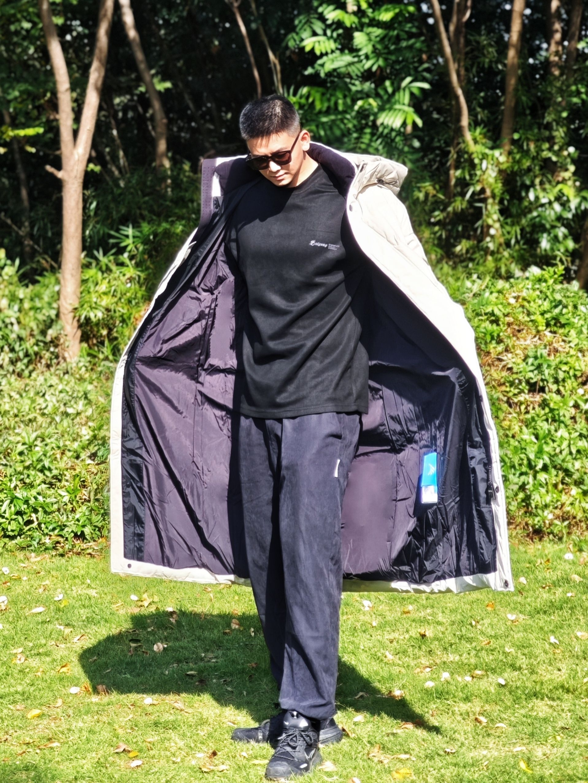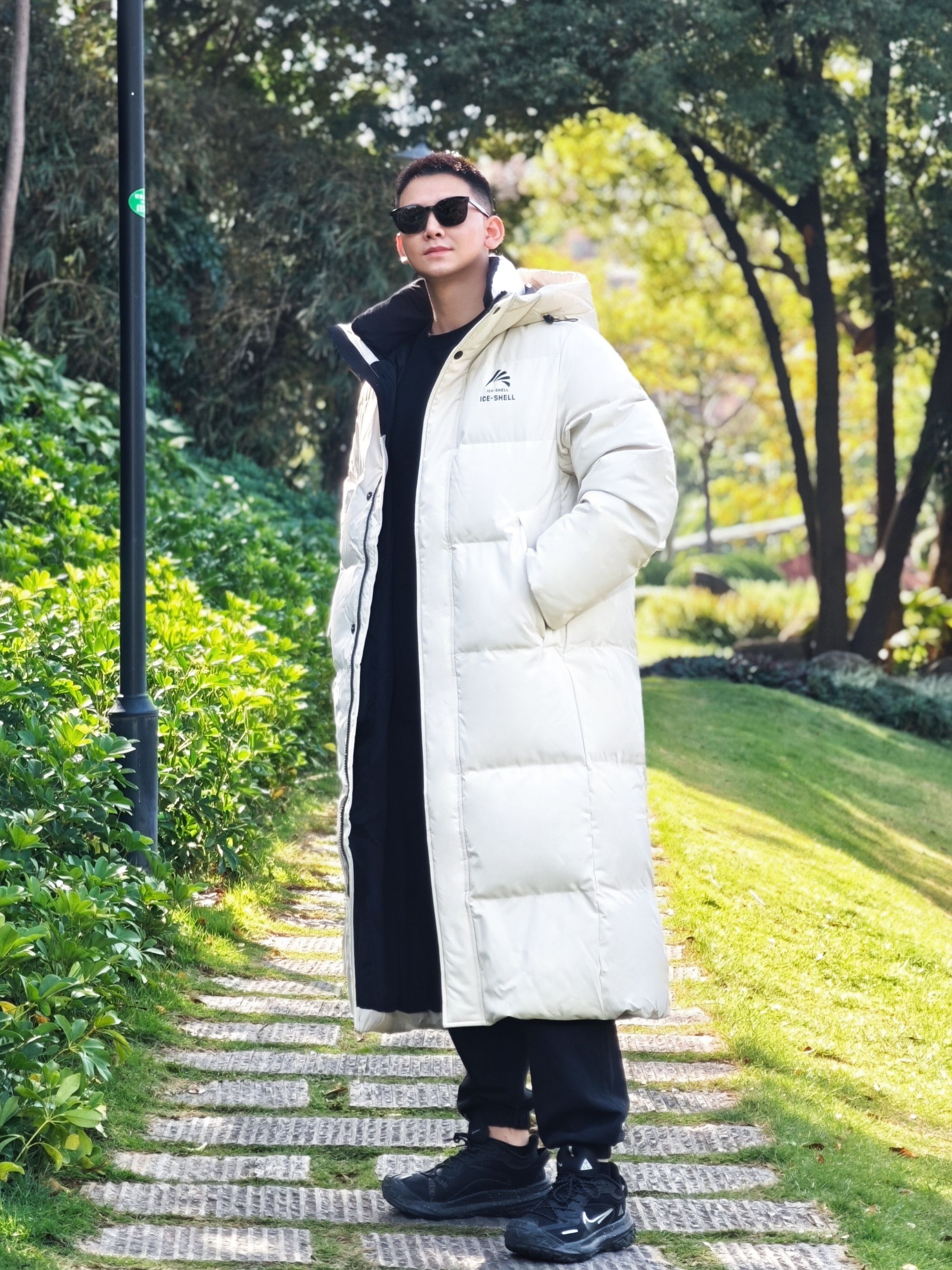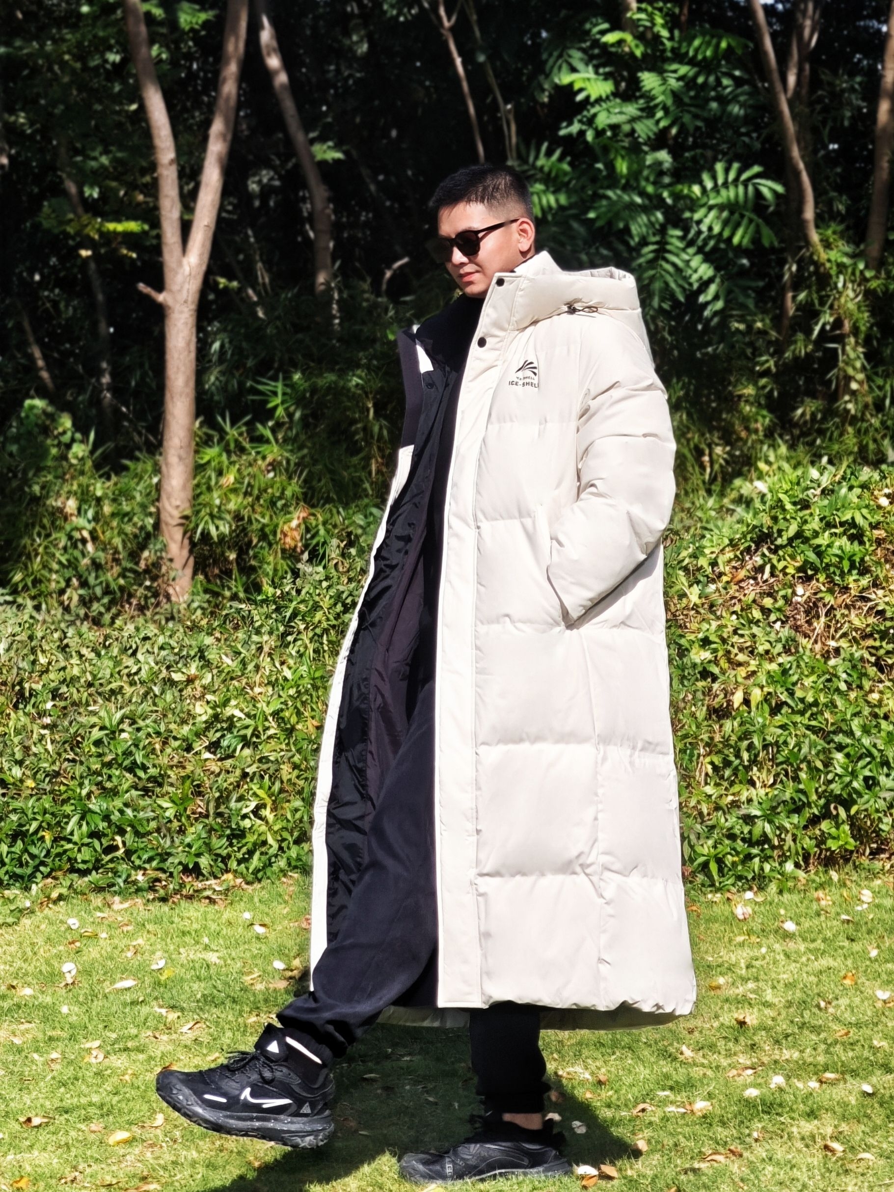 今天降温了但阳光很好,穿了这件鸭鸭冰壳系列长款羽绒服去公园散步。我身高175cm/75kg,穿L码很合身,是想要的上身效果。 米白色在阳光下看起来很舒服,中系风的版型确实不挑身材。在草地上走了半小时,石墨烯保暖材料确实有用,身体一直很暖和,也没有羽绒服常见的厚重感。 帽子足够宽大,戴上后防风效果明显。表面有防泼水处理,在枯草地上沾了露水也没渗进去。整体是干净的学院风,搭配休闲裤或者运动裤都挺协...