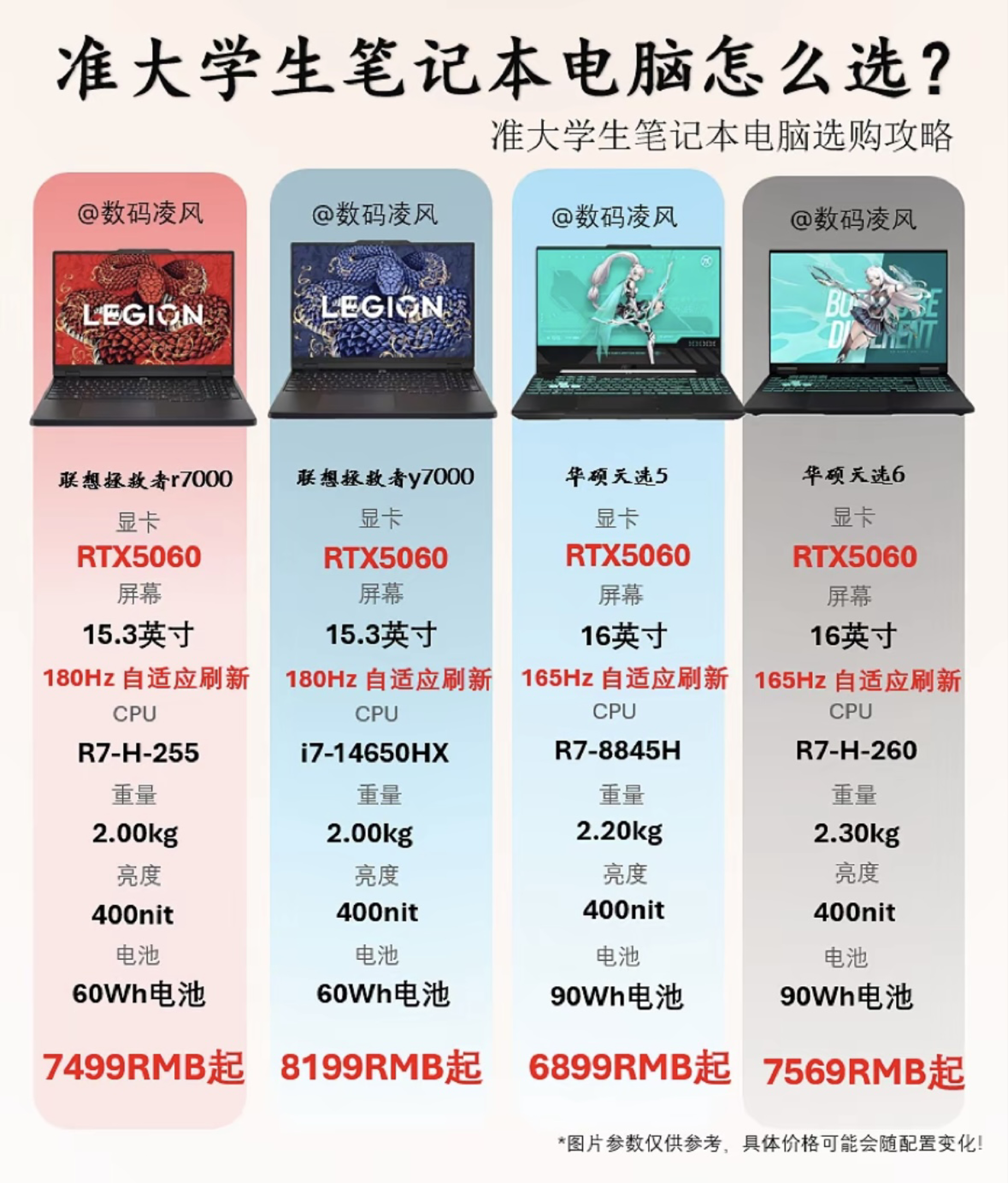 大家好我是数码凌风!RTX5060显卡的游戏本扎堆,那么今天这四款热门机型从5999到8199元覆盖不同预算,结合配置和价格给你具体购买建议🥰 🎮 5999元档:机械革命极光X 核心配置:RTX5060 + i7-13700HX + 16英寸2.5K 180Hz + 冰封散热 购买建议:预算卡在6000元内的学生党、入门游戏党直接冲!这是四款里价格最低的RTX5060机型,i7处理器应对3A大...