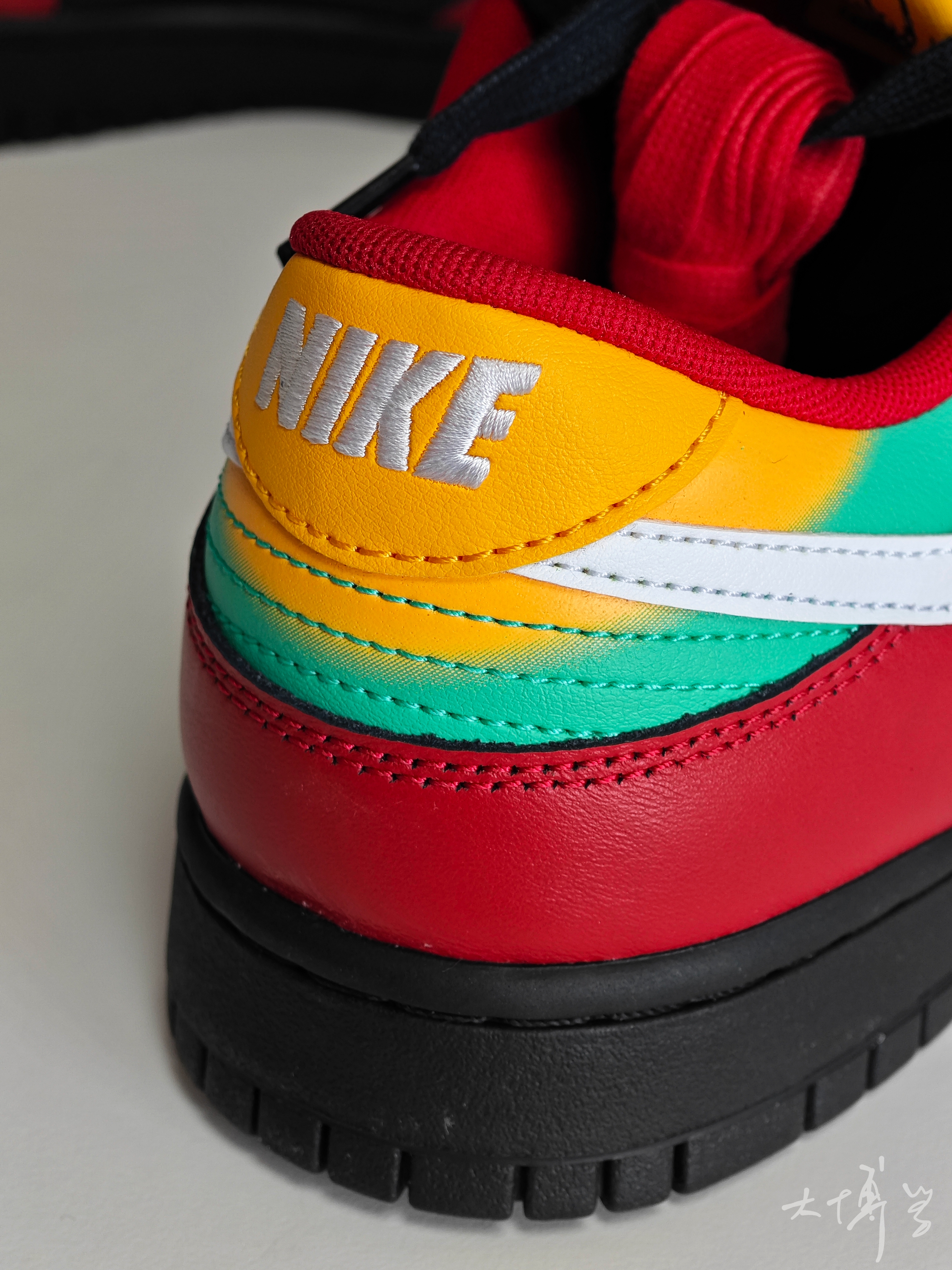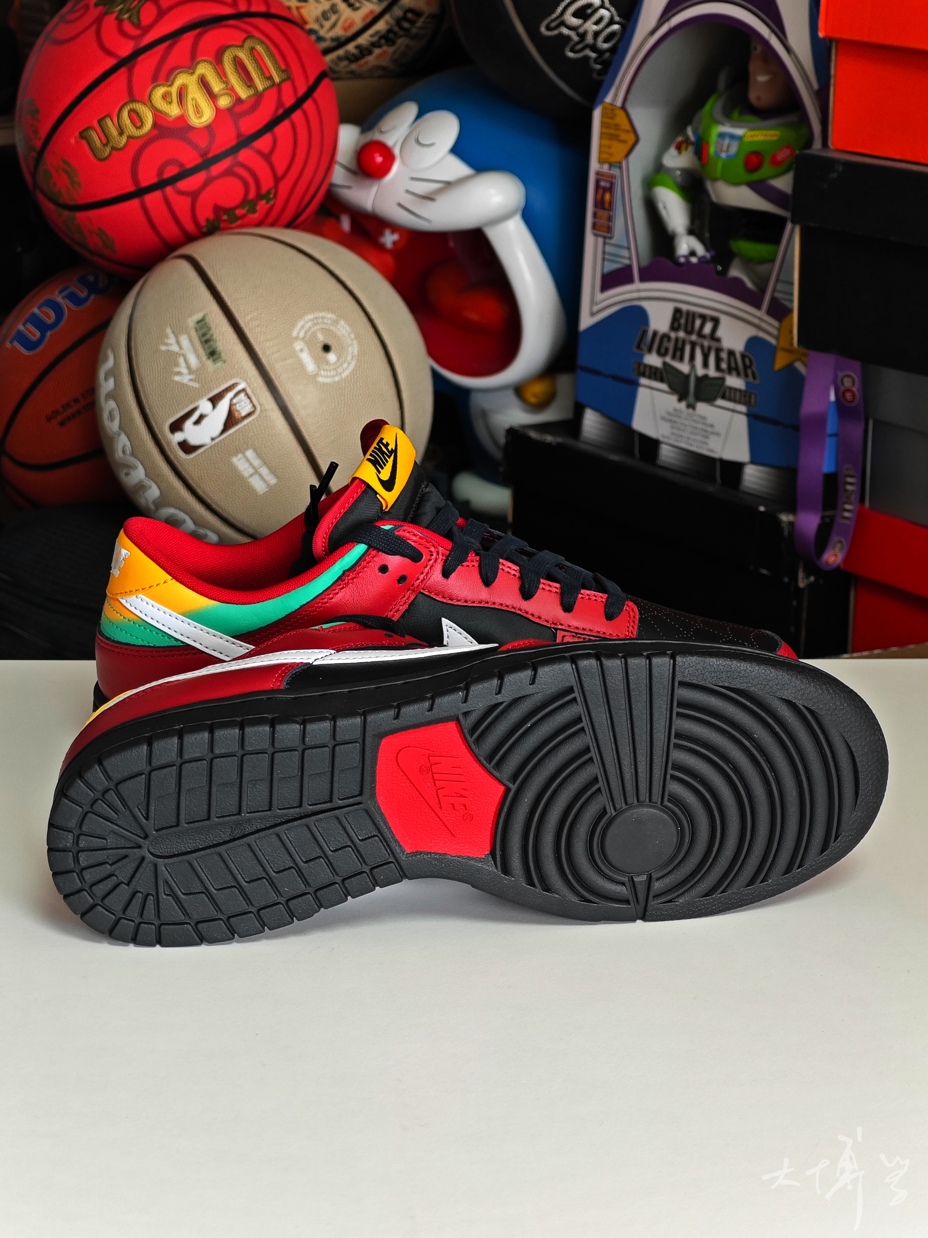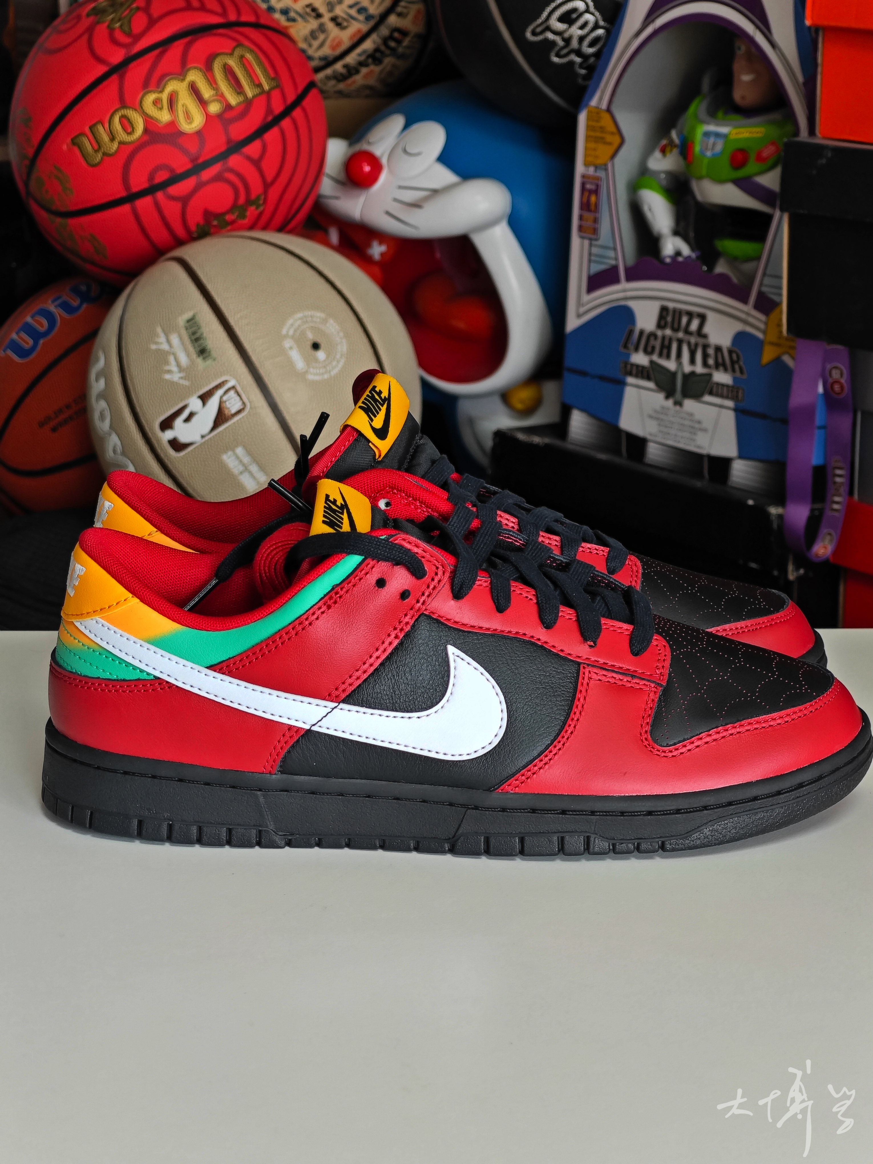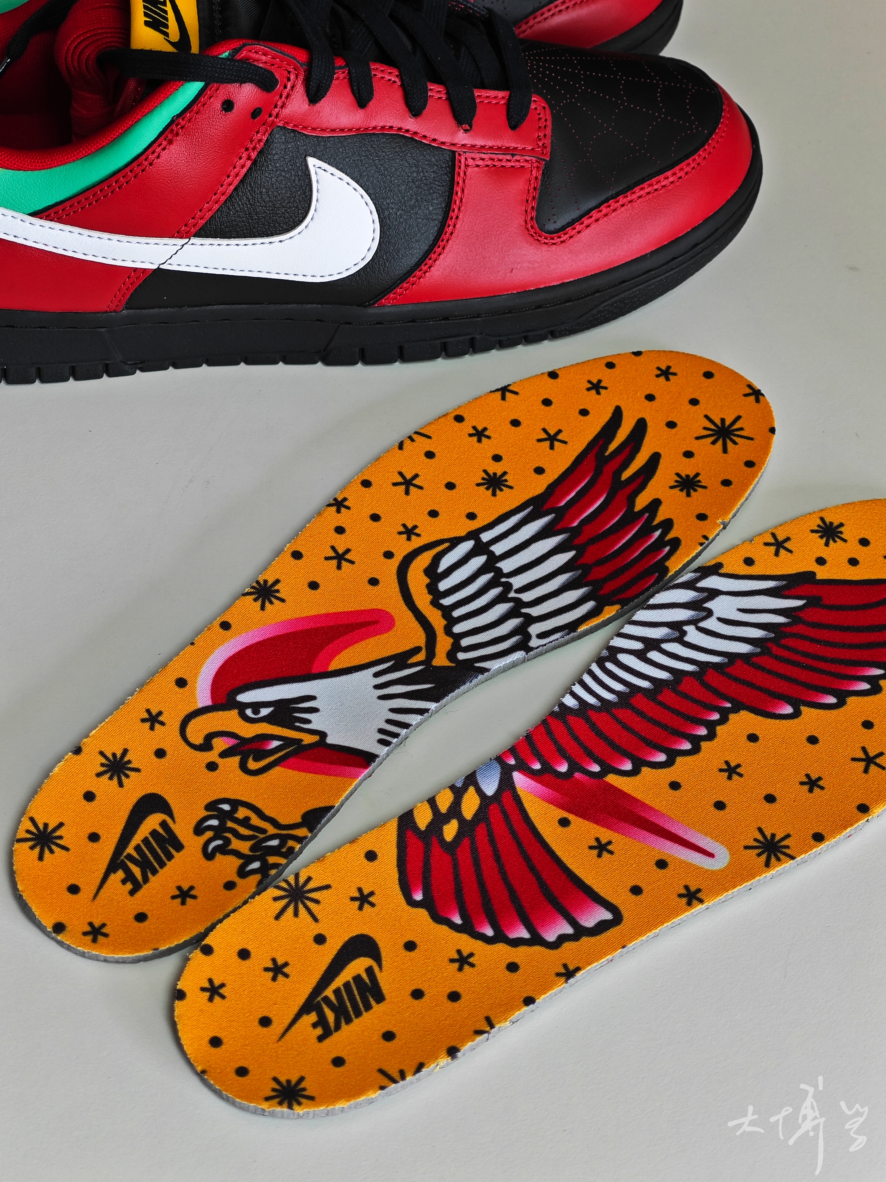 一双色彩丰富的dunk low 黑红主色,鞋跟位置颜色很多 鞋头位置的透气孔值得一提 呈现了蜘蛛网🕸️的图案 所以有朋友戏称这款是蜘蛛侠dunk 鞋舌上可圈可点的细节很多 我比较喜欢的是鞋垫上的涂鸦 两种鞋垫拼到一起 变成了老鹰🦅 很有个性的一双dunk low