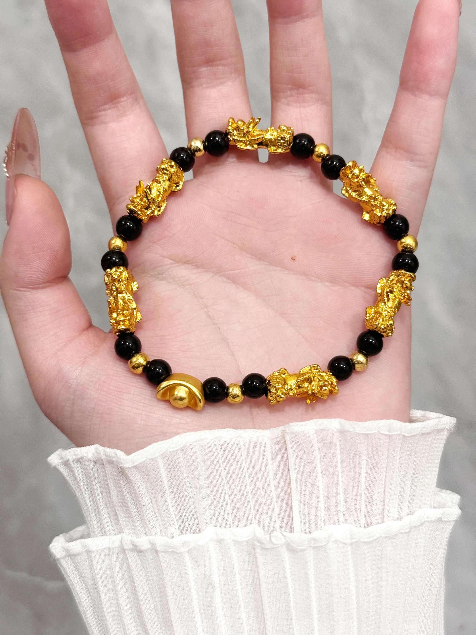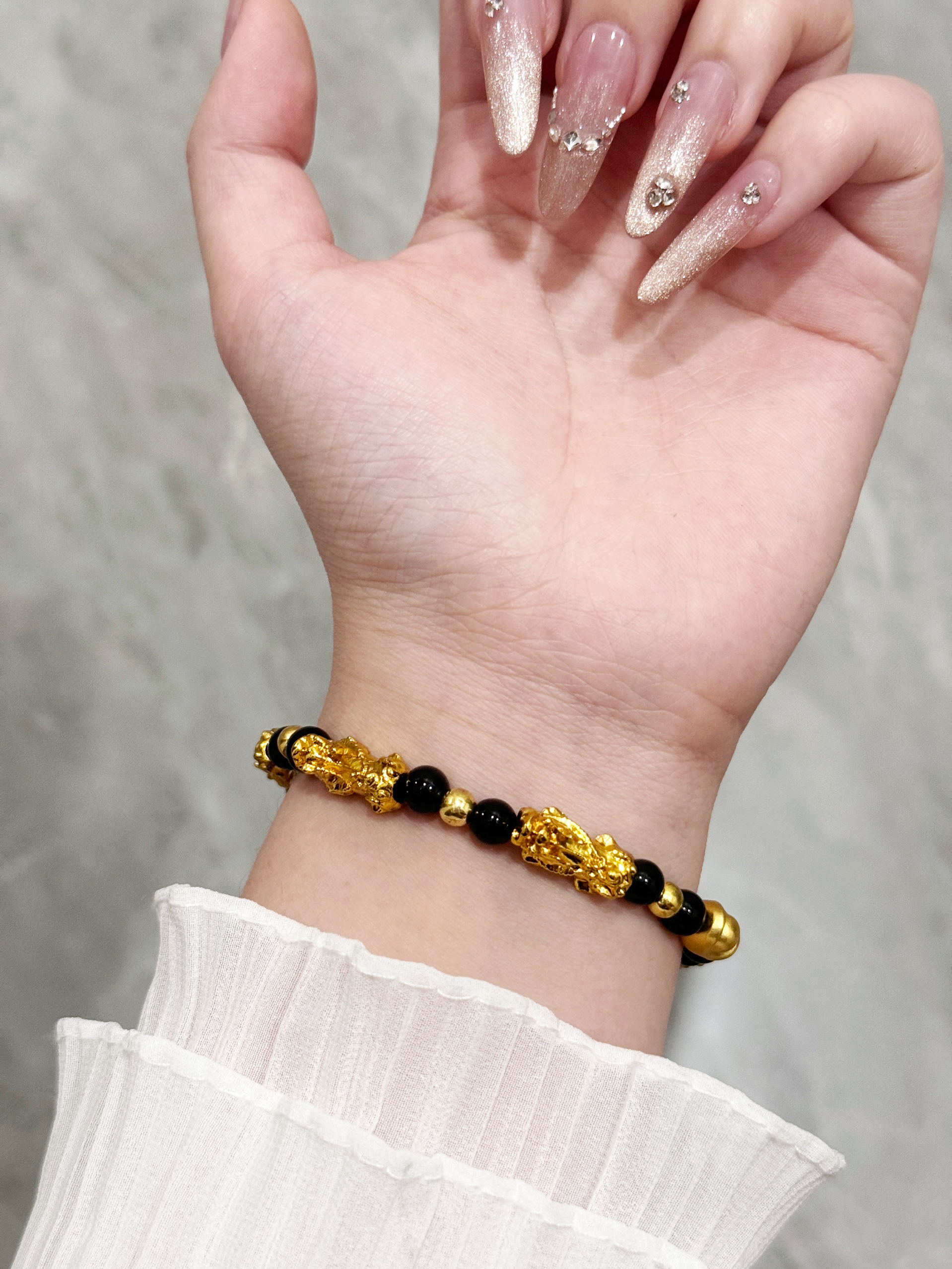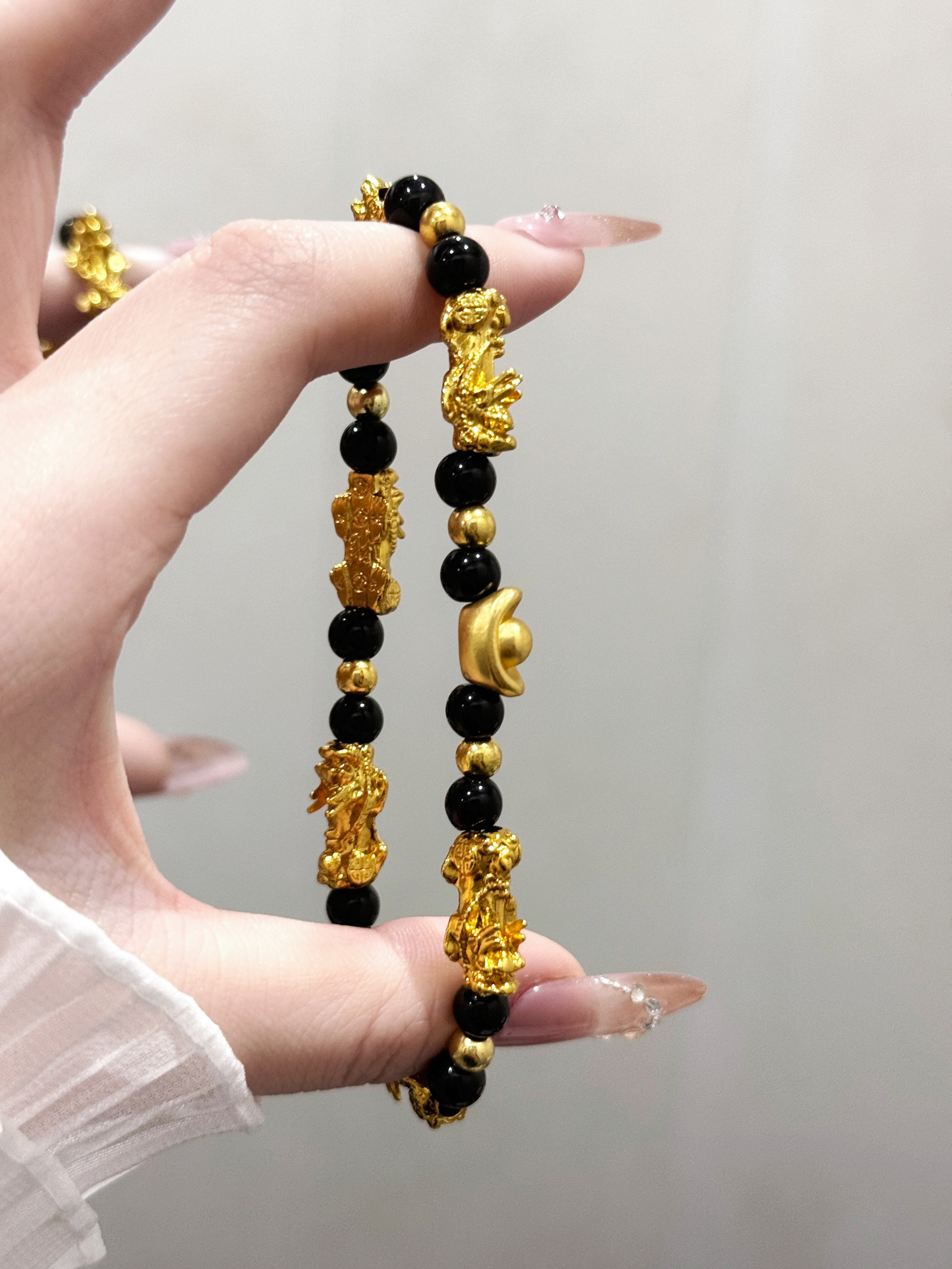 黑金配色的经典碰撞,黑玛瑙衬得金貔貅愈发亮眼✨ 颗颗貔貅雕工精致,搭配转运金珠,不仅是腕间的吸睛装饰,更藏着招福纳财的美好寓意,日常佩戴显气质,送礼自留都合适~