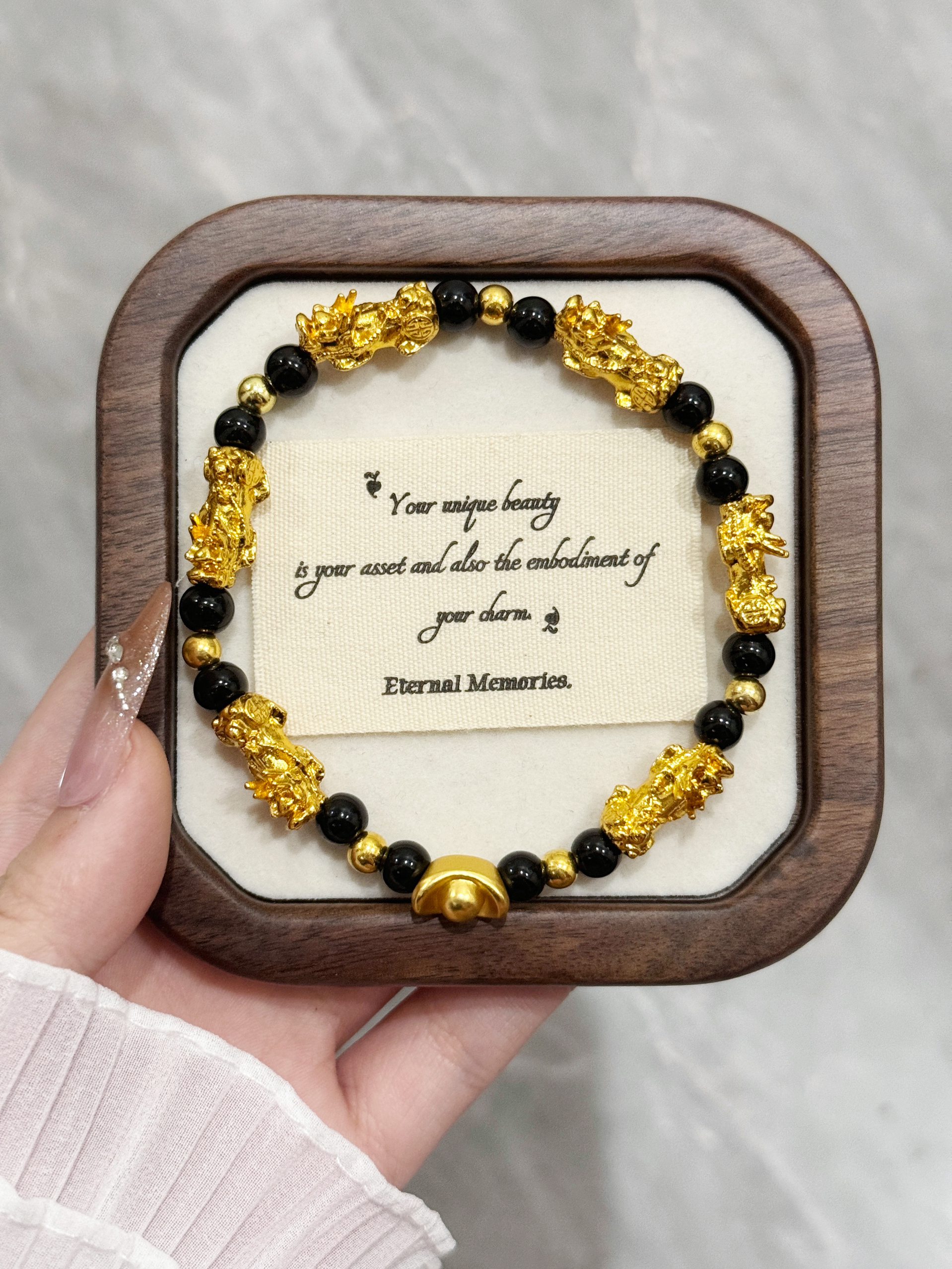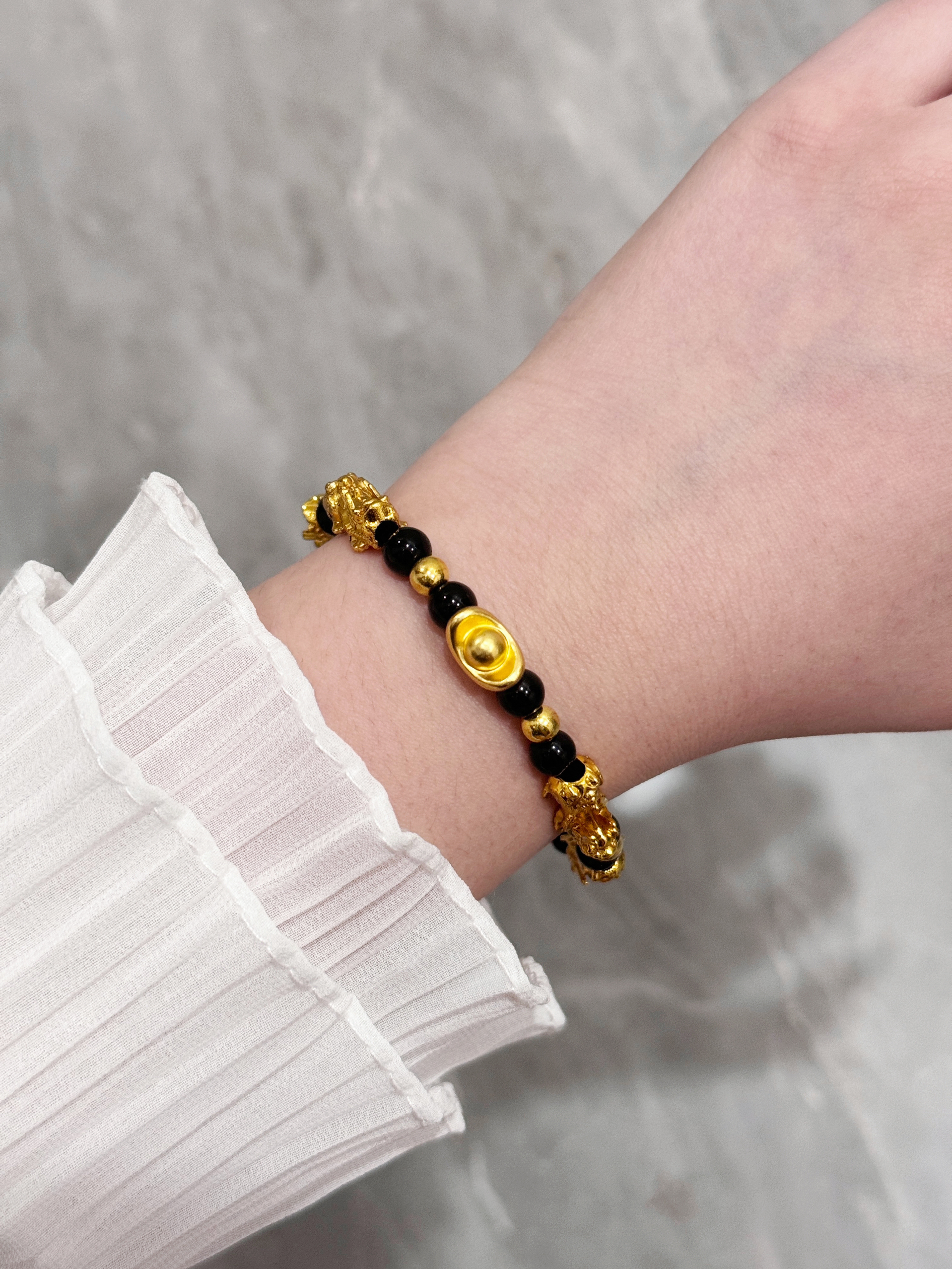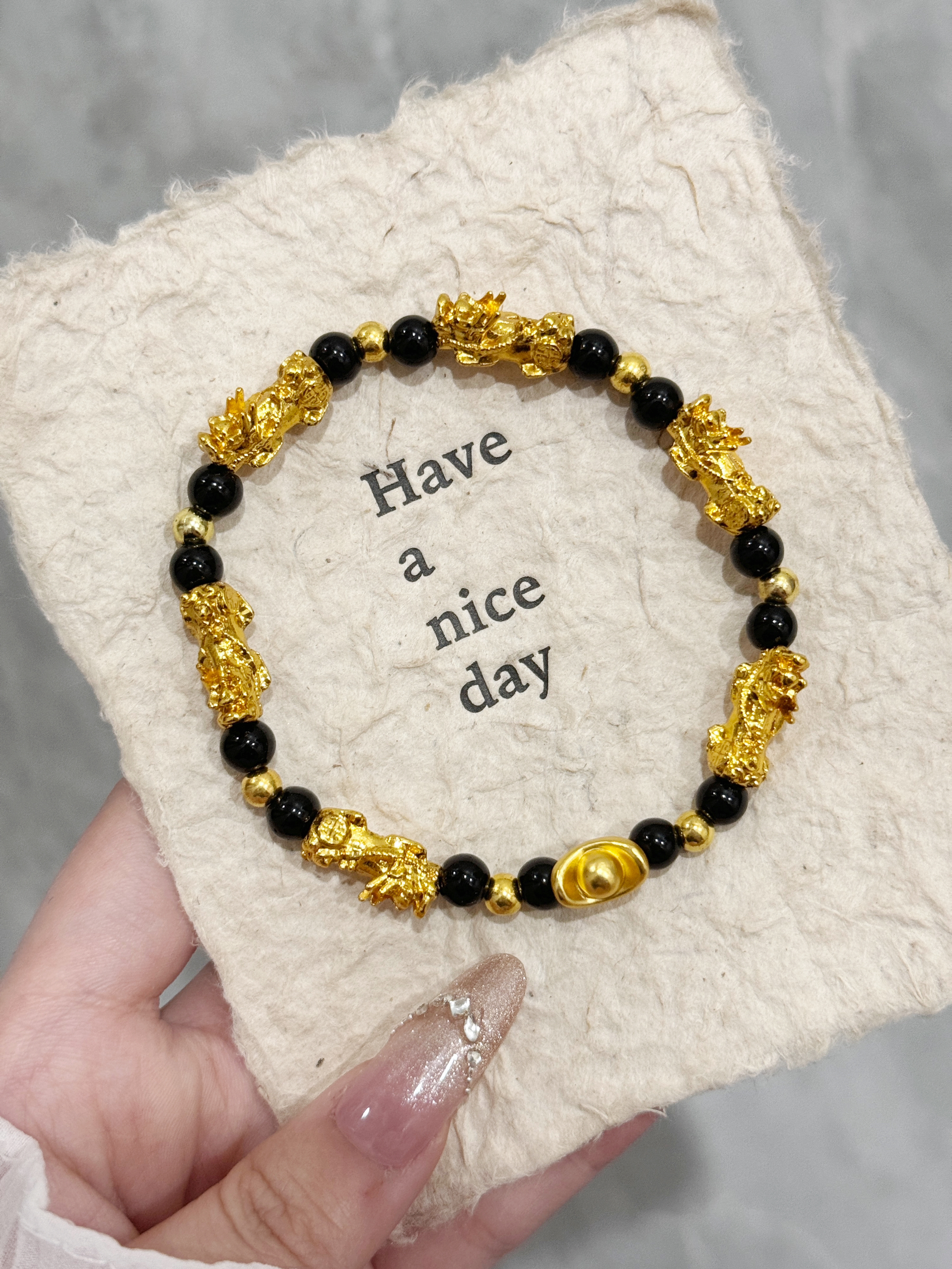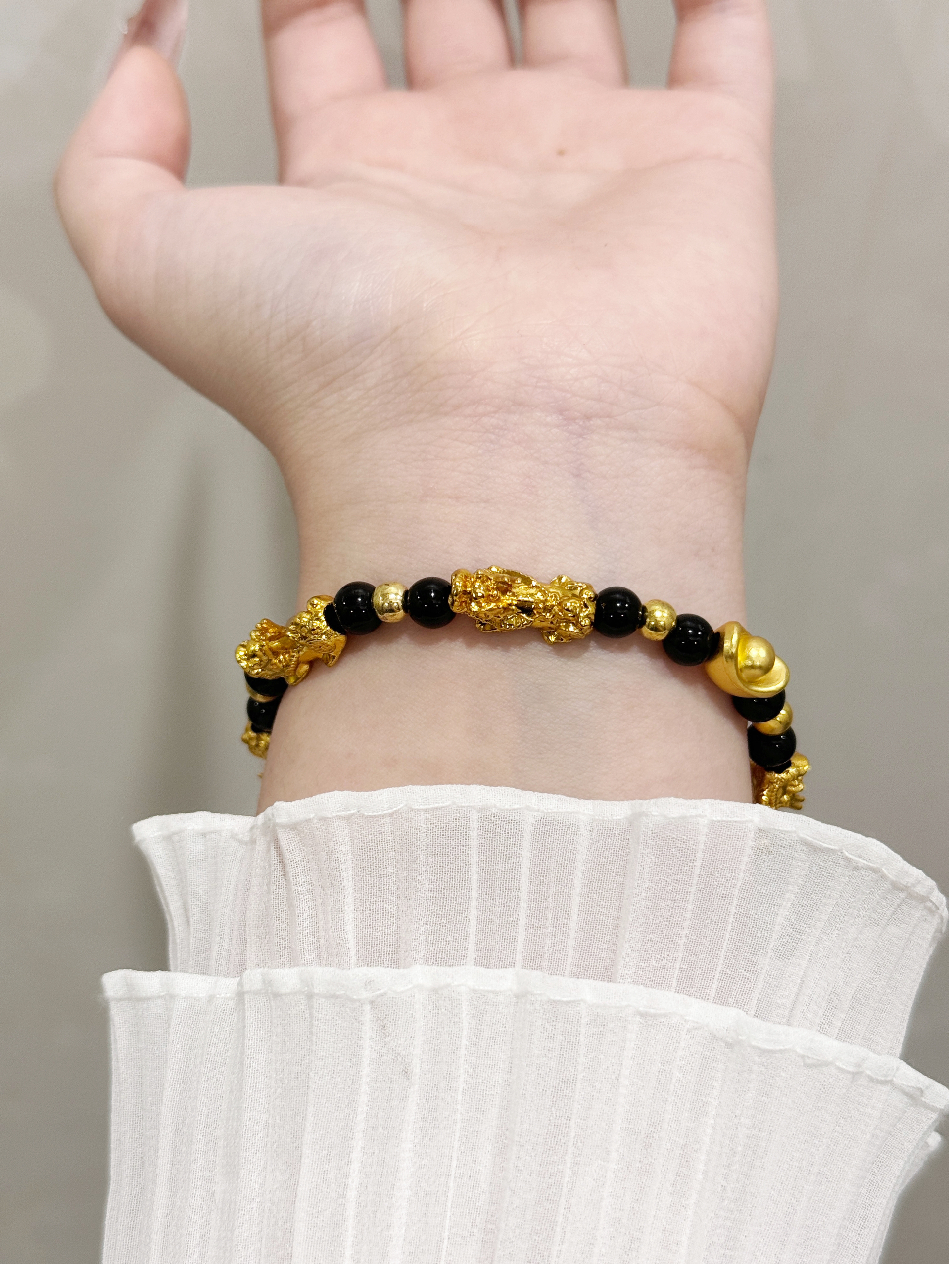 黑金配色的经典碰撞,黑玛瑙衬得金貔貅愈发亮眼✨ 颗颗貔貅雕工精致,搭配转运金珠,不仅是腕间的吸睛装饰,更藏着招福纳财的美好寓意,日常佩戴显气质,送礼自留都合适~