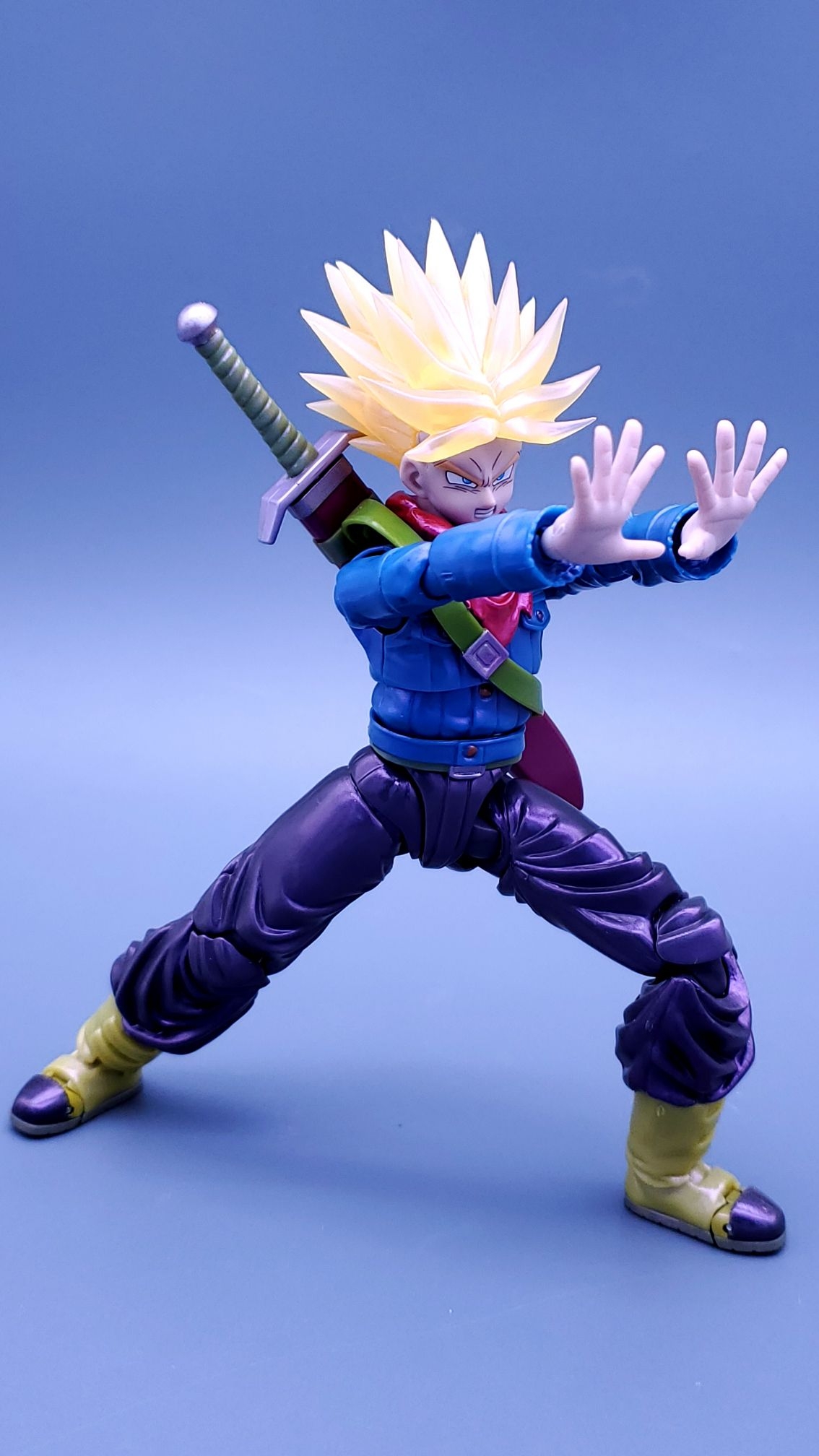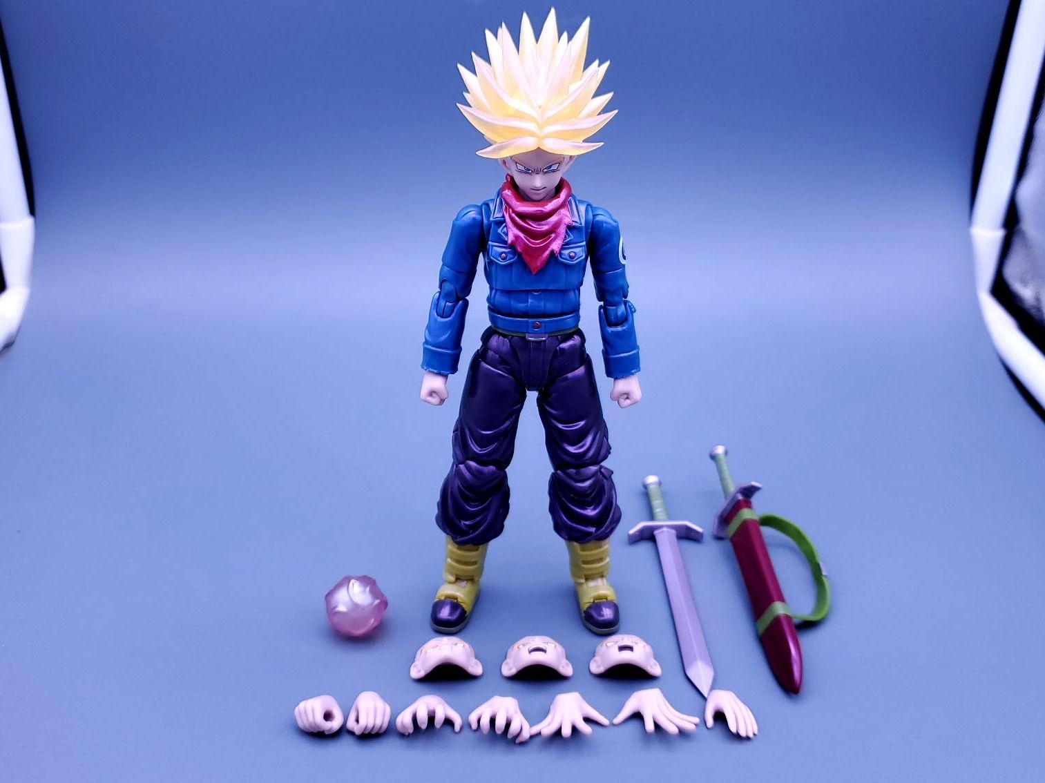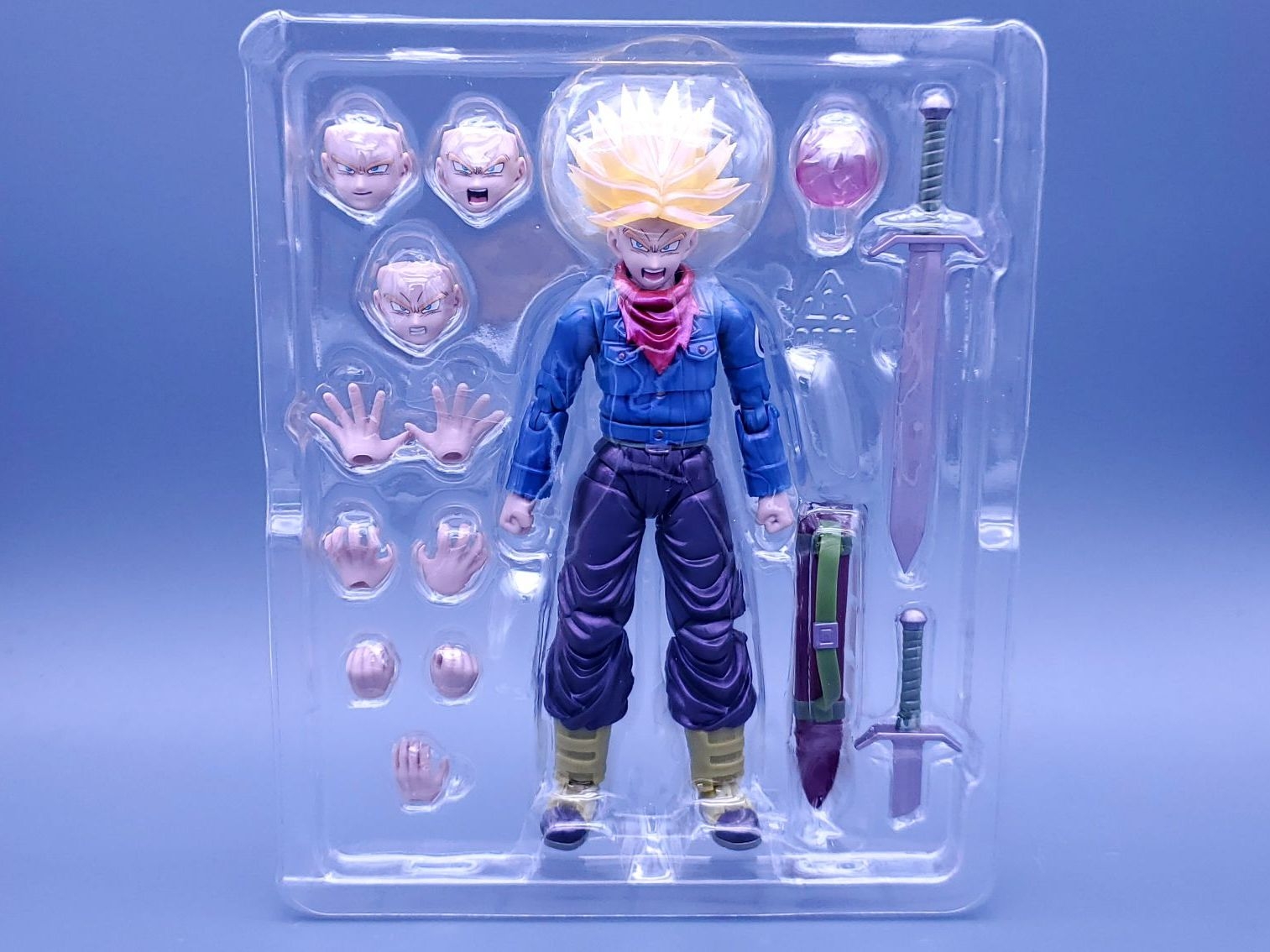 万代shf龙珠会场限定-未来特兰克斯,发售于2024年7月,面雕有平静脸,咬牙脸,呐喊脸,斜视呐喊脸4种,配件有剑和剑鞘。一个能量球特效件,因为是一款重涂产品,适合制霸党入手。