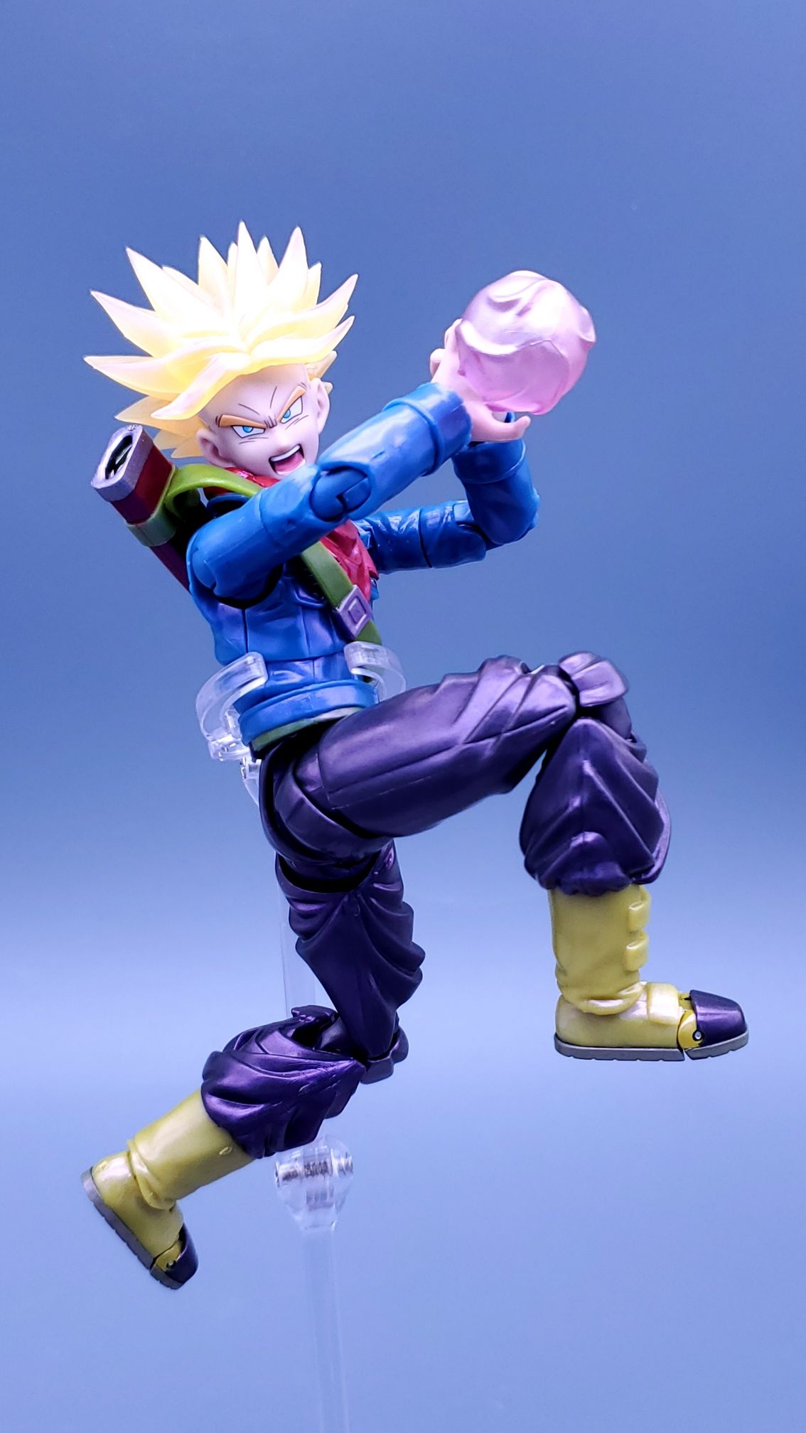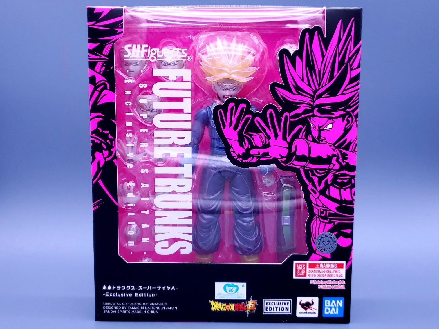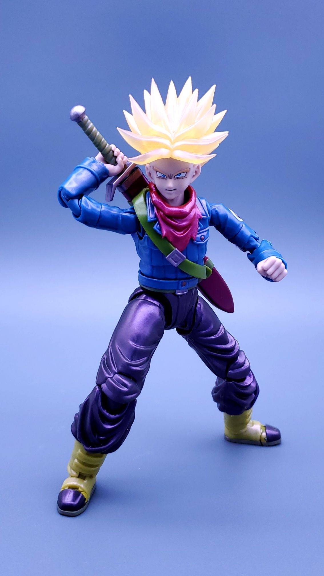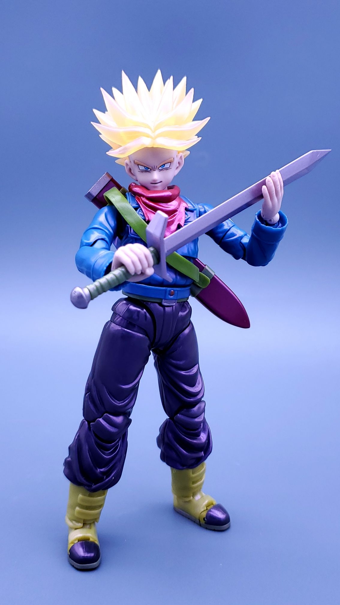 万代shf龙珠会场限定-未来特兰克斯,发售于2024年7月,面雕有平静脸,咬牙脸,呐喊脸,斜视呐喊脸4种,配件有剑和剑鞘。一个能量球特效件,因为是一款重涂产品,适合制霸党入手。