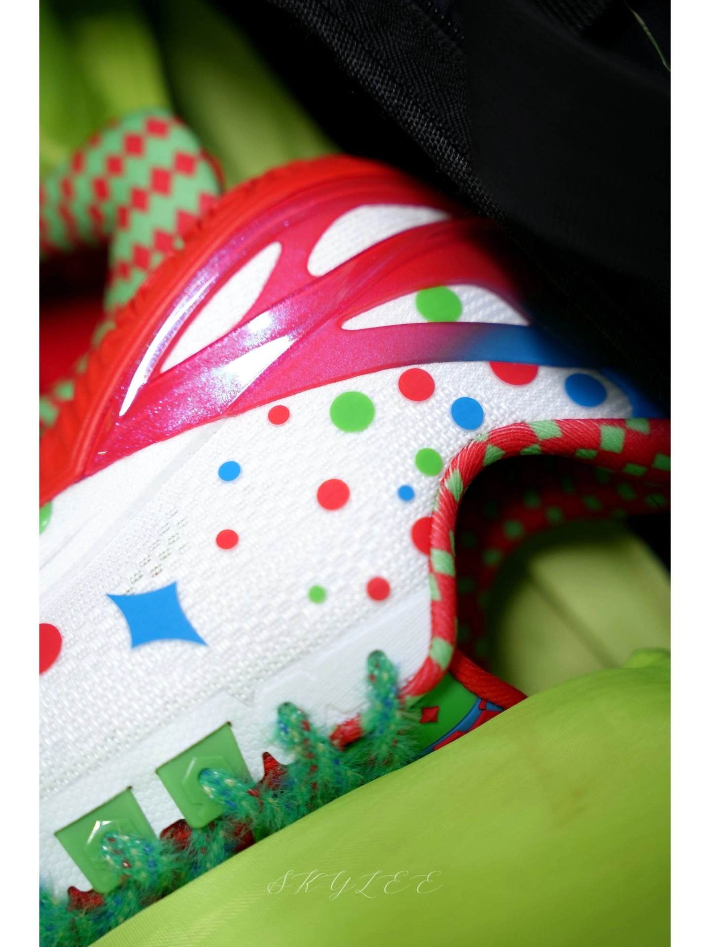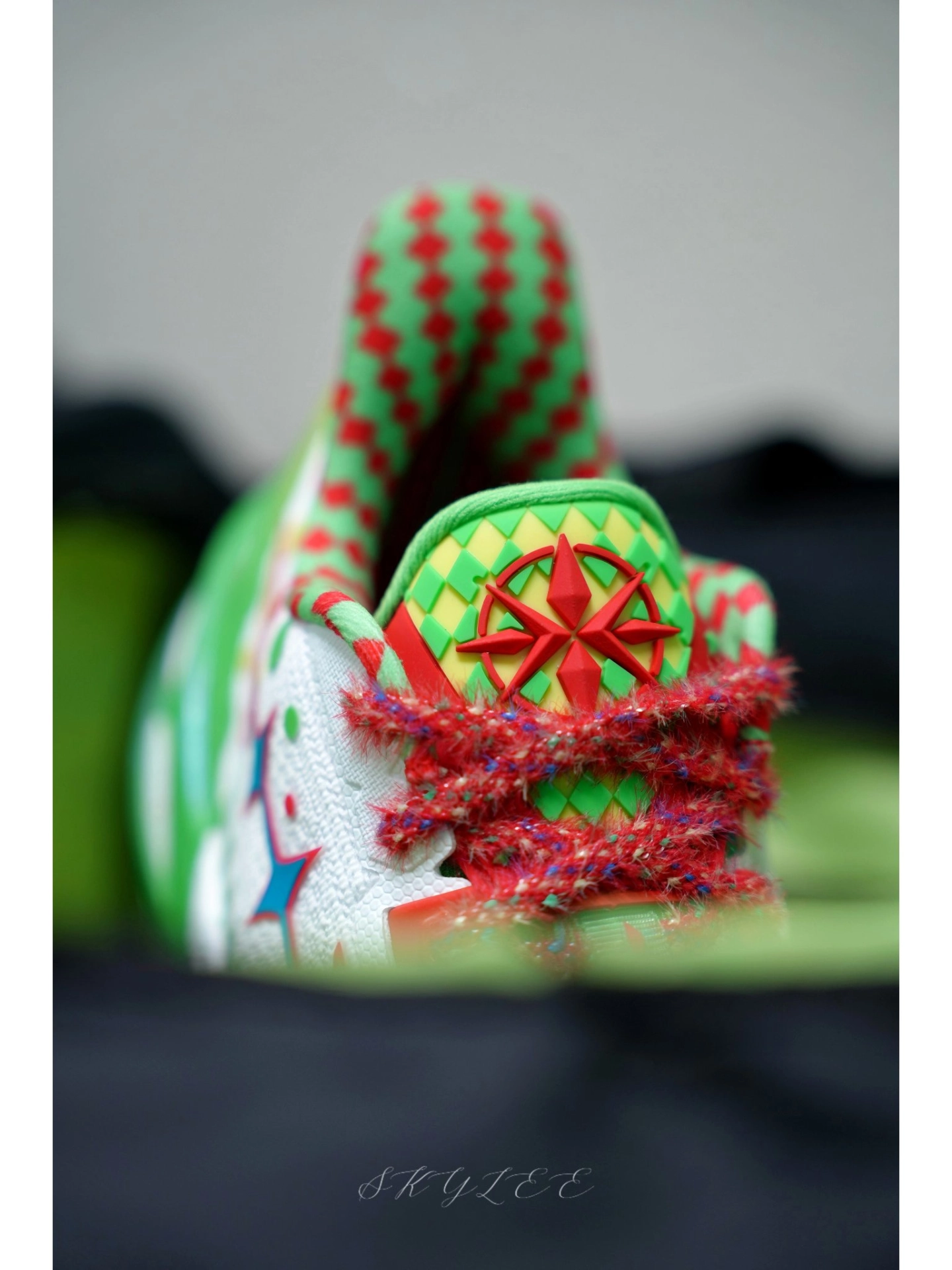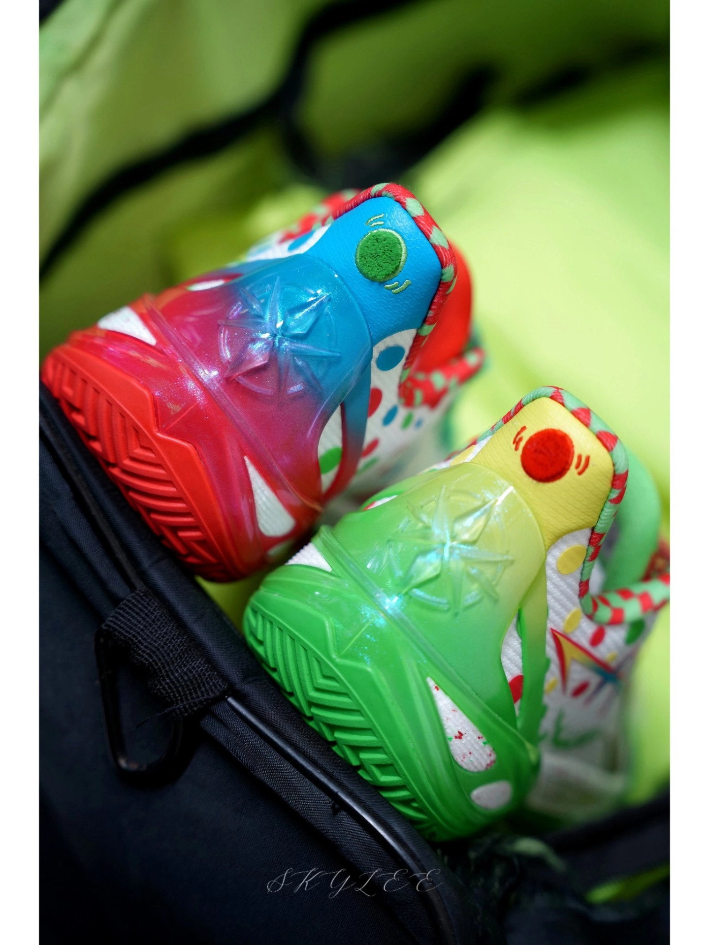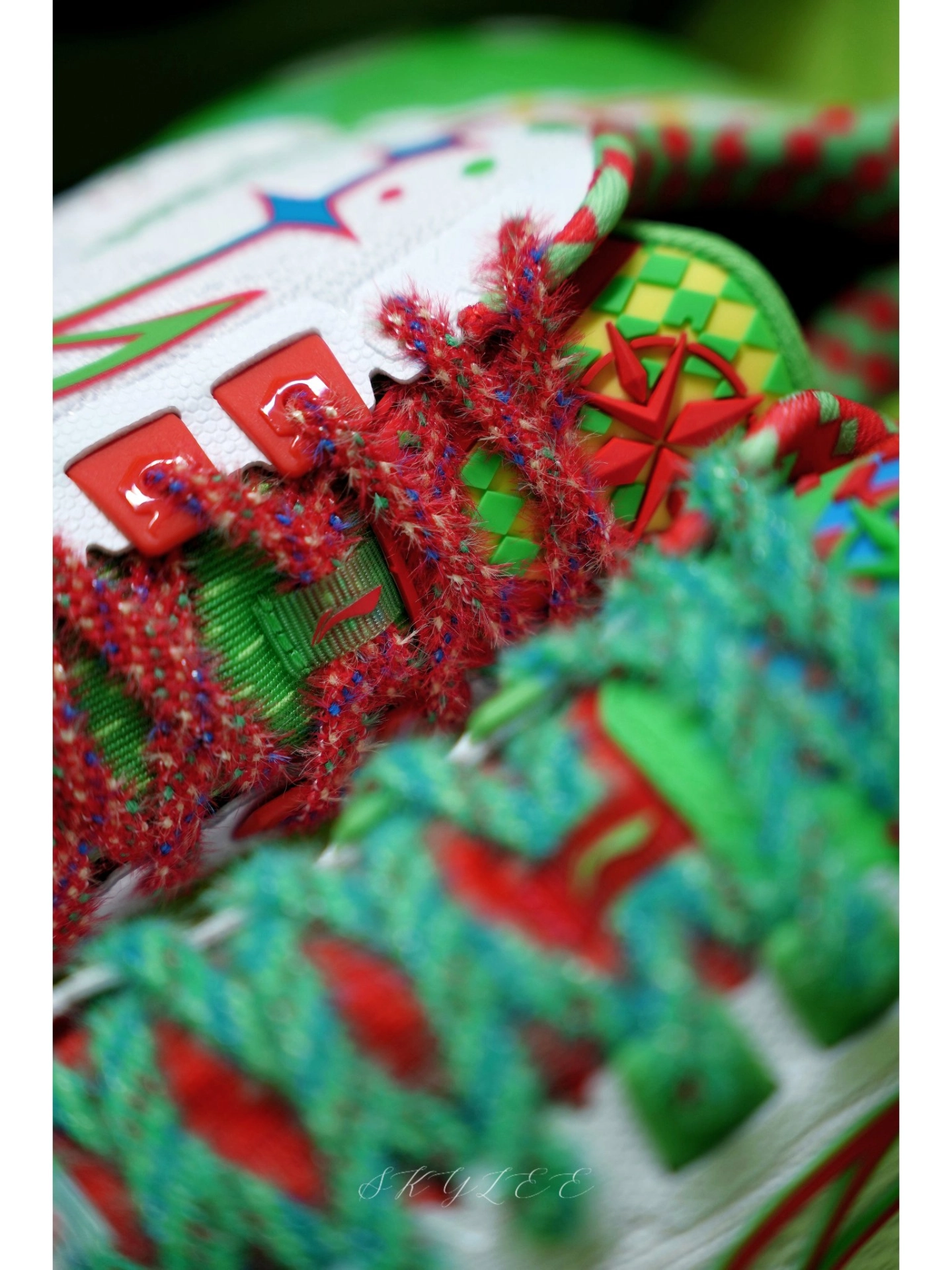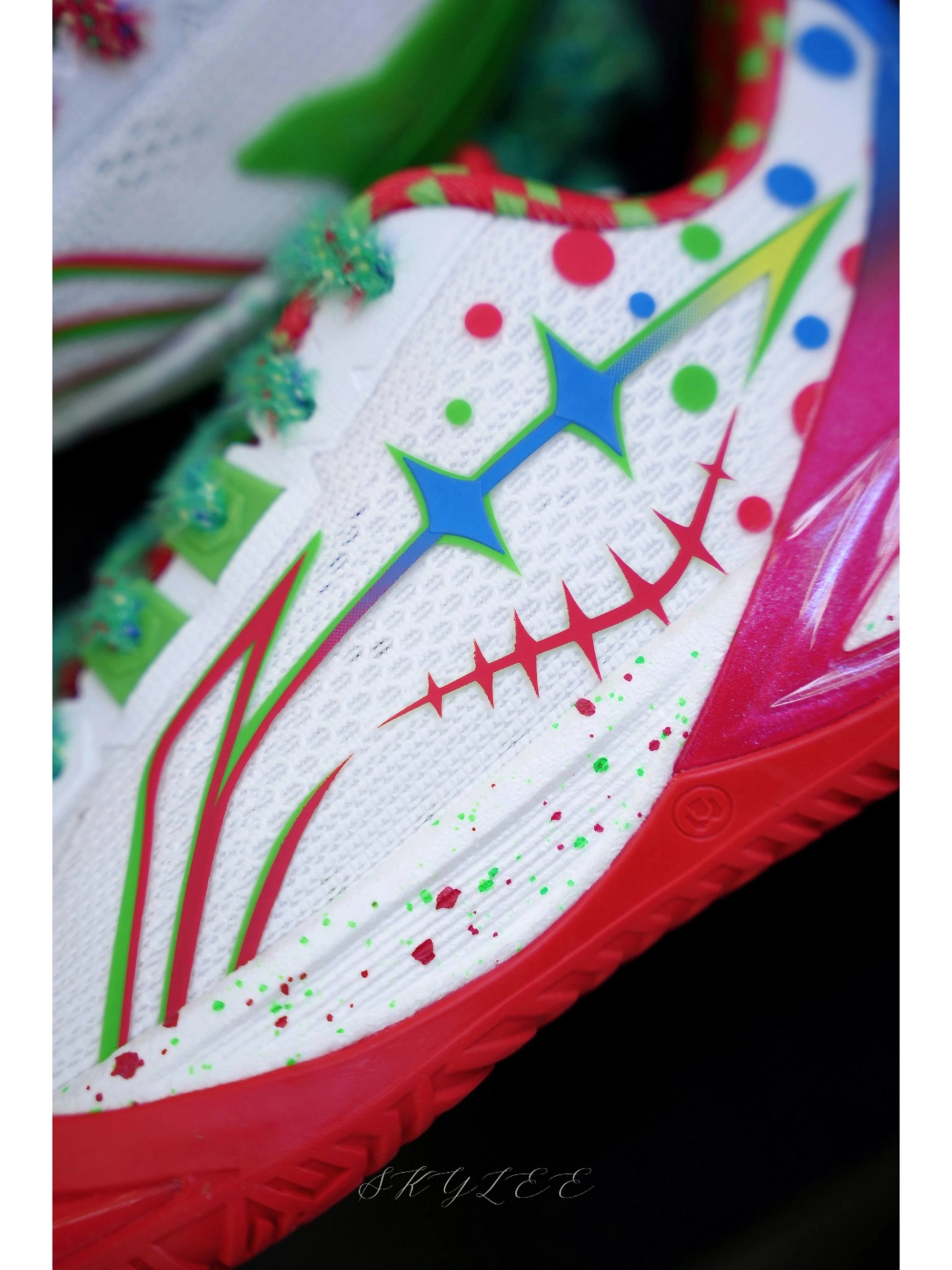 巴里布朗在比赛中上脚的配色--假面 颜值直接封神!灵感来自小丑脸上的油彩,红色和绿色的鸳鸯撞色视觉冲击力拉满! 🔹侧边李宁的Logo和内侧还有小丑的图案🤡,鞋舌有领带的小设计,后跟还带个小丑鼻头的点缀,再配上彩带鞋带,真的越看越有味道。 🔹外观上与利刃6最大的不同是后跟,这一次把标志性的利刃Logo放在了正后方,另外在鞋帮高度上也有所降低,脚踝活动起来贼灵活,变向、横移都不带束缚的。 🔹配置...