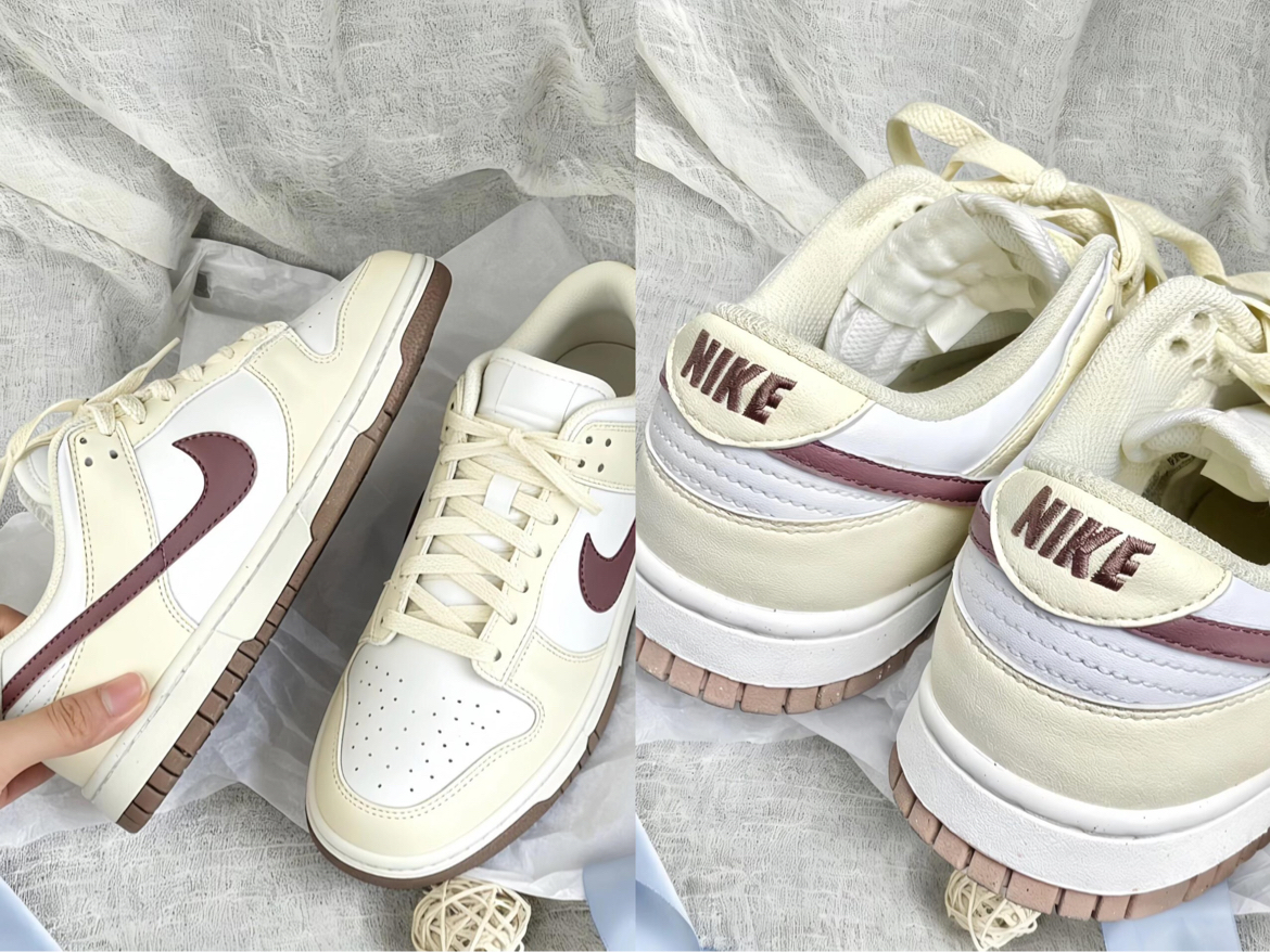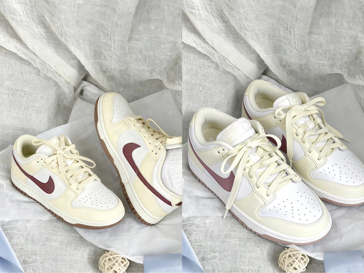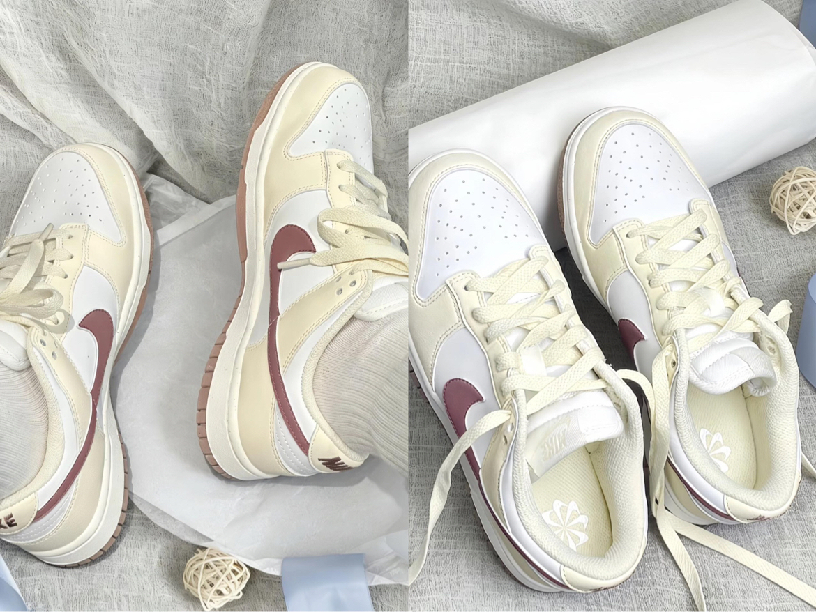 终于蹲到这双米白红勾Dunk,实物配色真的戳中我!奶fufu的米白皮质鞋面软韧有质感,酒红勾的撞色低调又显温柔,鞋舌填充得很饱满,上脚不会磨脚背~ 不过鞋型偏窄,胖脚姐妹建议选大半码,米白色鞋面也确实容易沾灰,鞋头漆皮还容易划到小痕迹,日常得小心打理。但架不住它搭配浅色系裤子、裙子都超和谐,通勤穿也轻便,性价比还是在线的✨