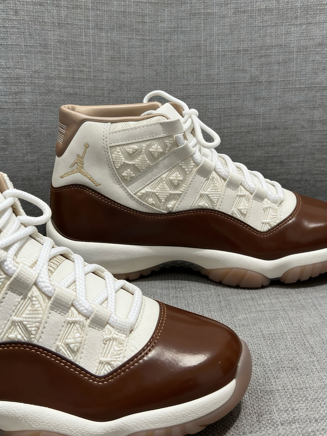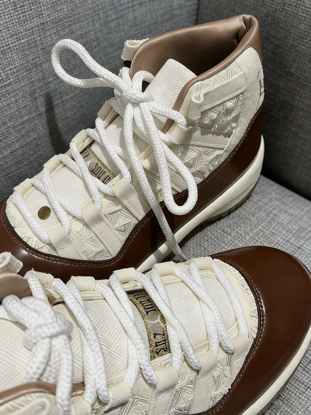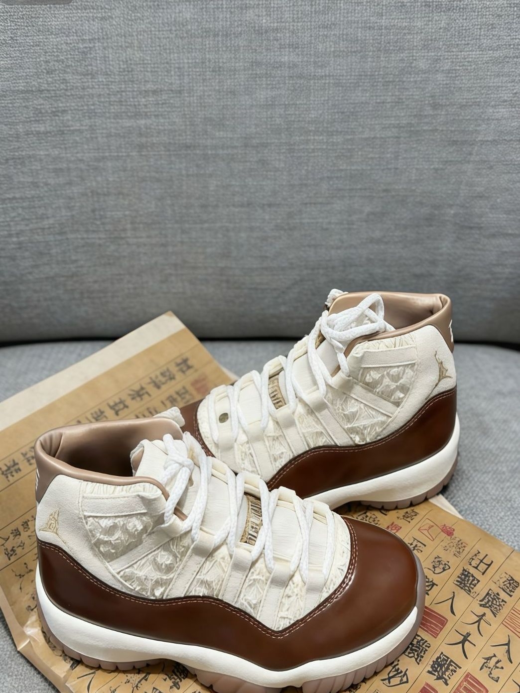 这双AJ11 China限定款真的绝了!米色翻毛皮配棕色油蜡皮,质感超棒,越穿越有味道。鞋身刺绣串珠超有中国风,鞋舌“乔丹卷十一”和后跟“二三”细节拉满,还有吉祥寓意。中底泡棉+全掌气垫,初穿硬但穿开超软弹,高帮包裹脚踝稳。橡胶外底耐磨,不过漆皮易折痕,串珠别磨铆钉衣服。收藏、穿搭、实战都合适,球鞋爱好者必冲!🎉