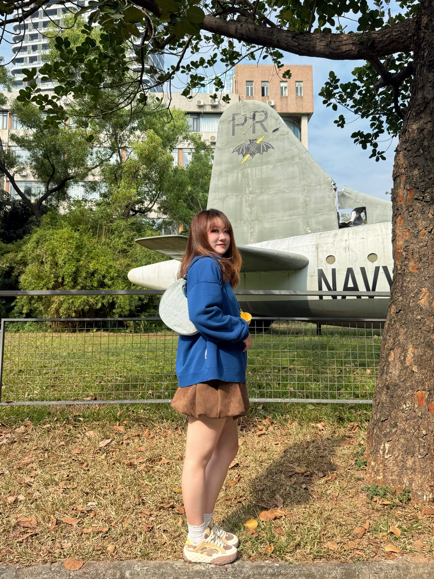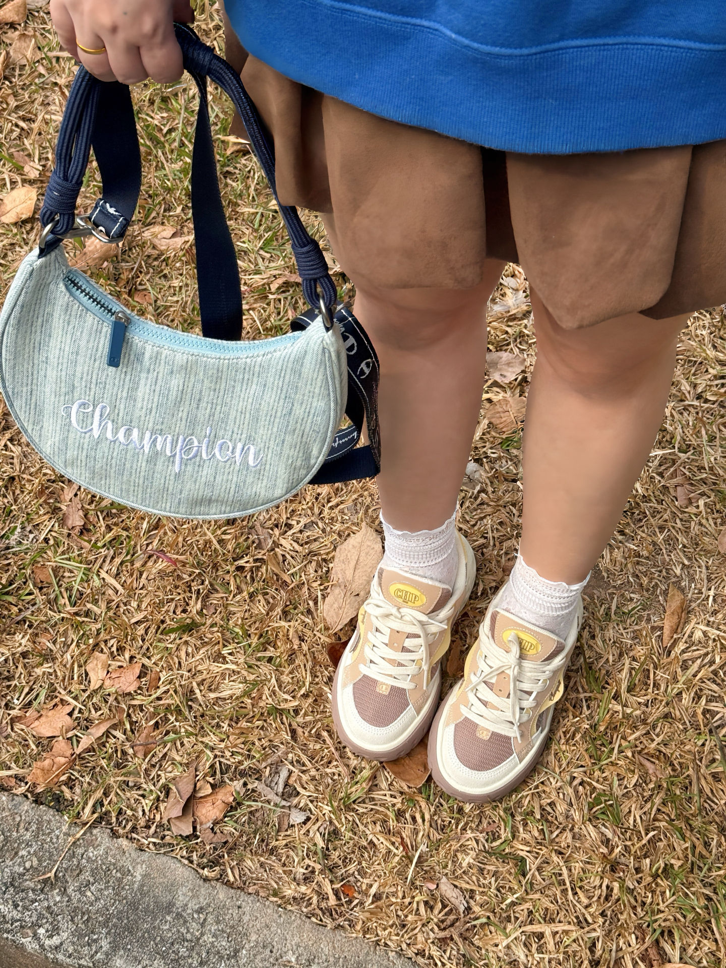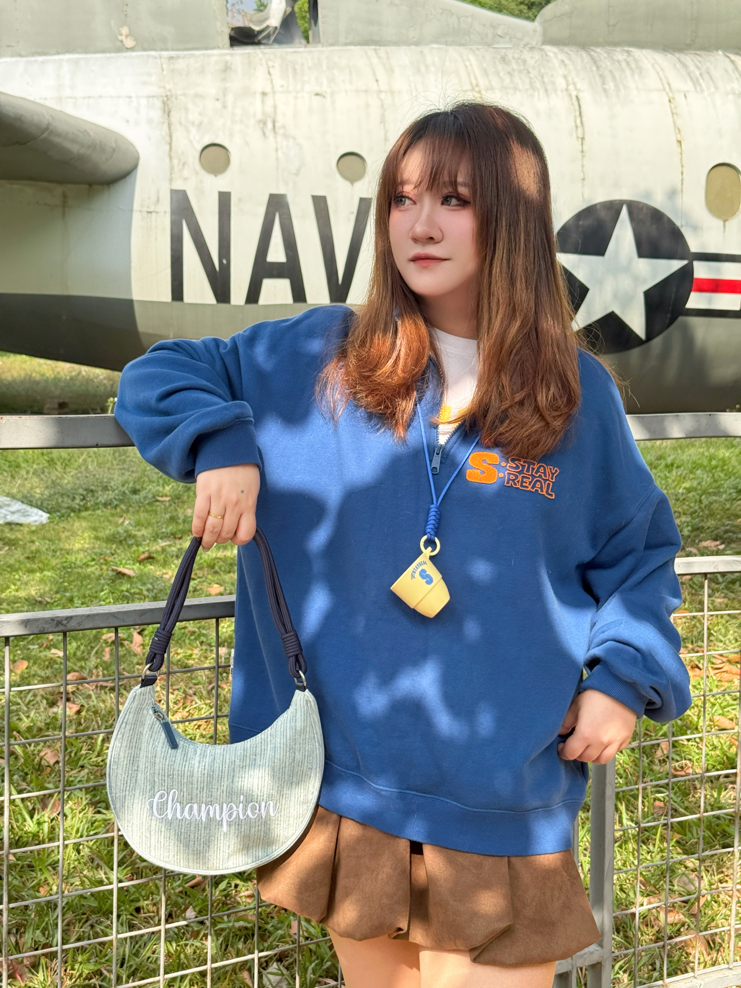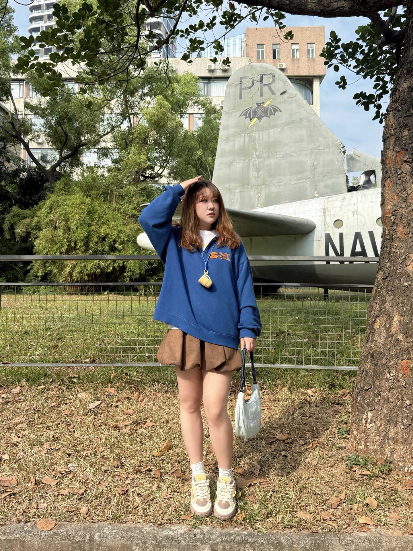 ▪️ 蓝棕调色盘,撞碎冬日的沉默 奶油白T恤从立领卫衣里探出头 像给天空蓝镶了道边☁️ 个人很爱这种“软配硬”的叠穿 领口袖口那点留白恰好 海军蓝的利落 被内搭的柔软悄悄化解了👌 下半身的焦糖棕短裙是意料之外的甜 厚底德训鞋踩在枯叶上沙沙响 和裙摆组成了大地色系二重奏🥾🍂 ▪️ 那只包是整套搭配的“呼吸感”担当 月牙型的弧度 刚好卡在身侧不显臃肿🌙 葱线刺绣的logo是暗纹,要凑近才能看清的精致...