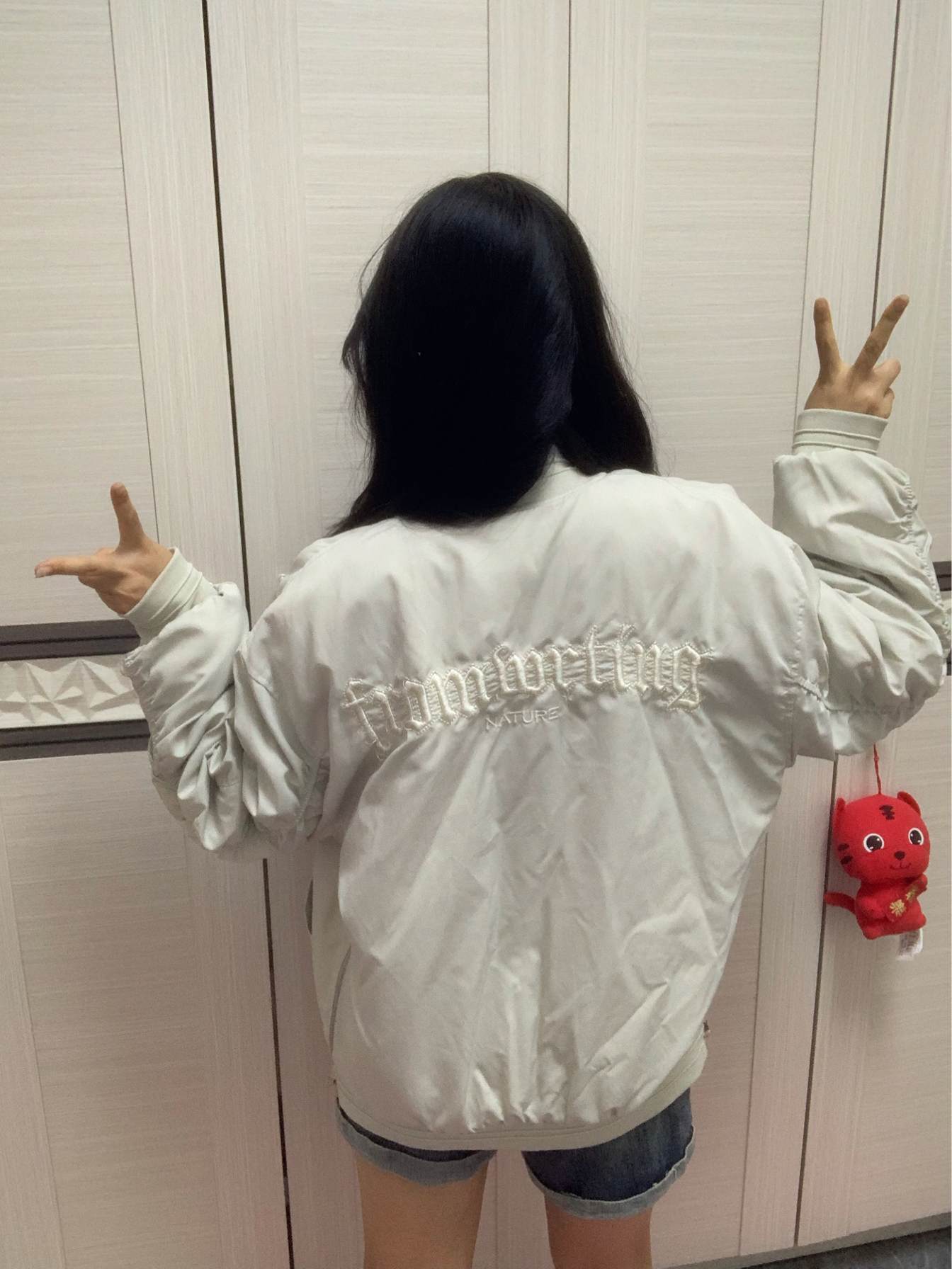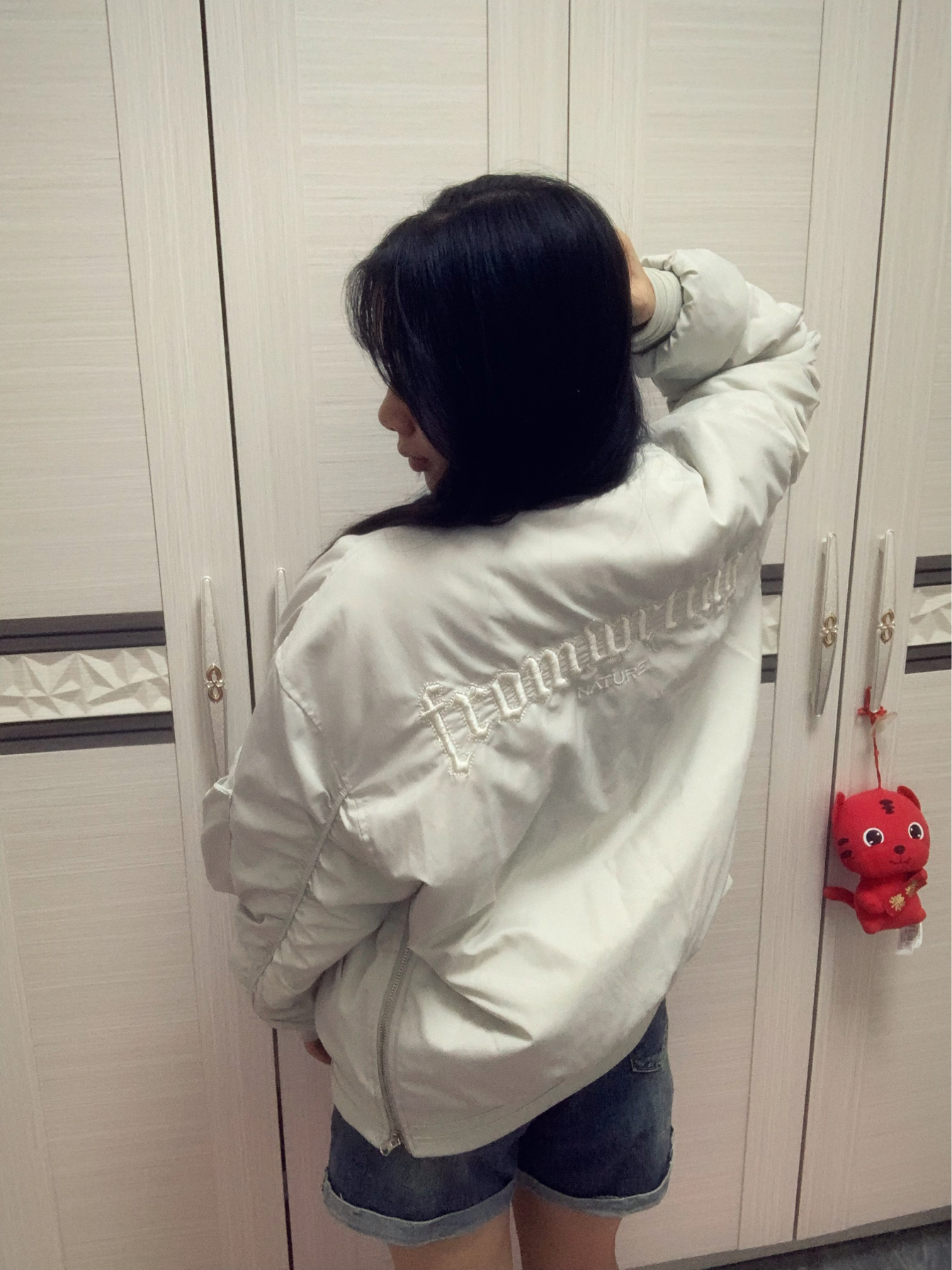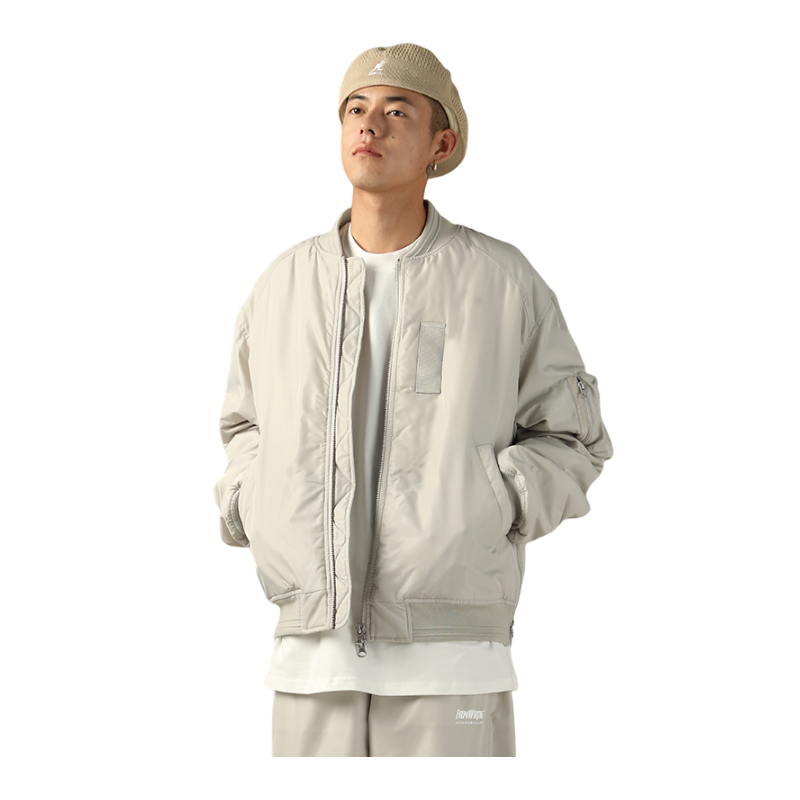 这件白灰色的夹克棒球服,颜色很百搭~ 内里夹棉,秋冬加一件卫衣就很保暖😇 衣服两侧的下摆都做了拉链,可以把它拉上去,漏出里面衣服的颜色,增加层次感,酷酷的!😍 其次在左边的袖子上,做了一个自带金属拉链的小口袋,不仅是装饰还可以放一些耳机之类的小东西,实用又帅气的设计❤️🔥 衣服后面刺绣的设计更是一绝 整件衣服完全就是帅气的美式风🤩