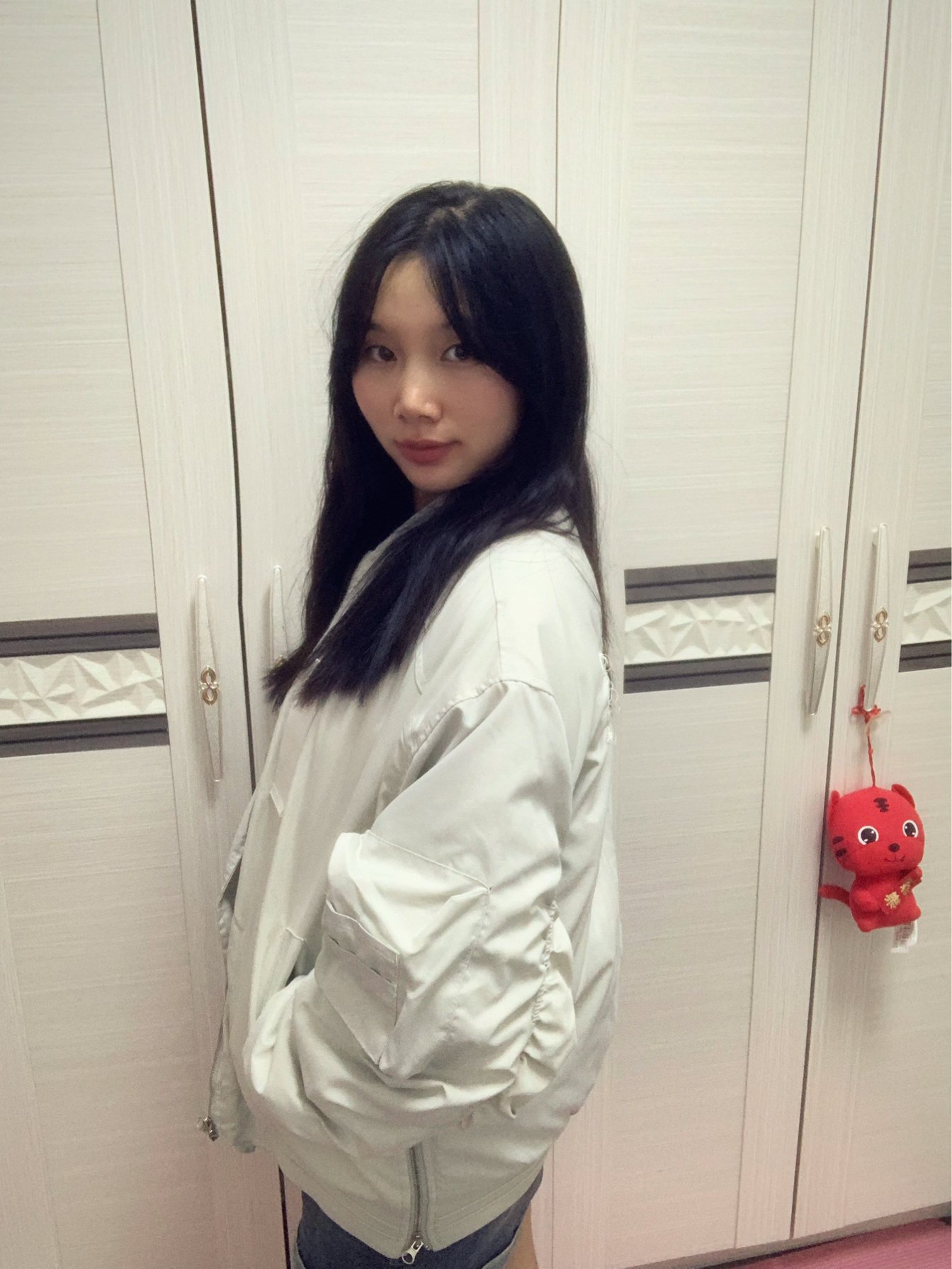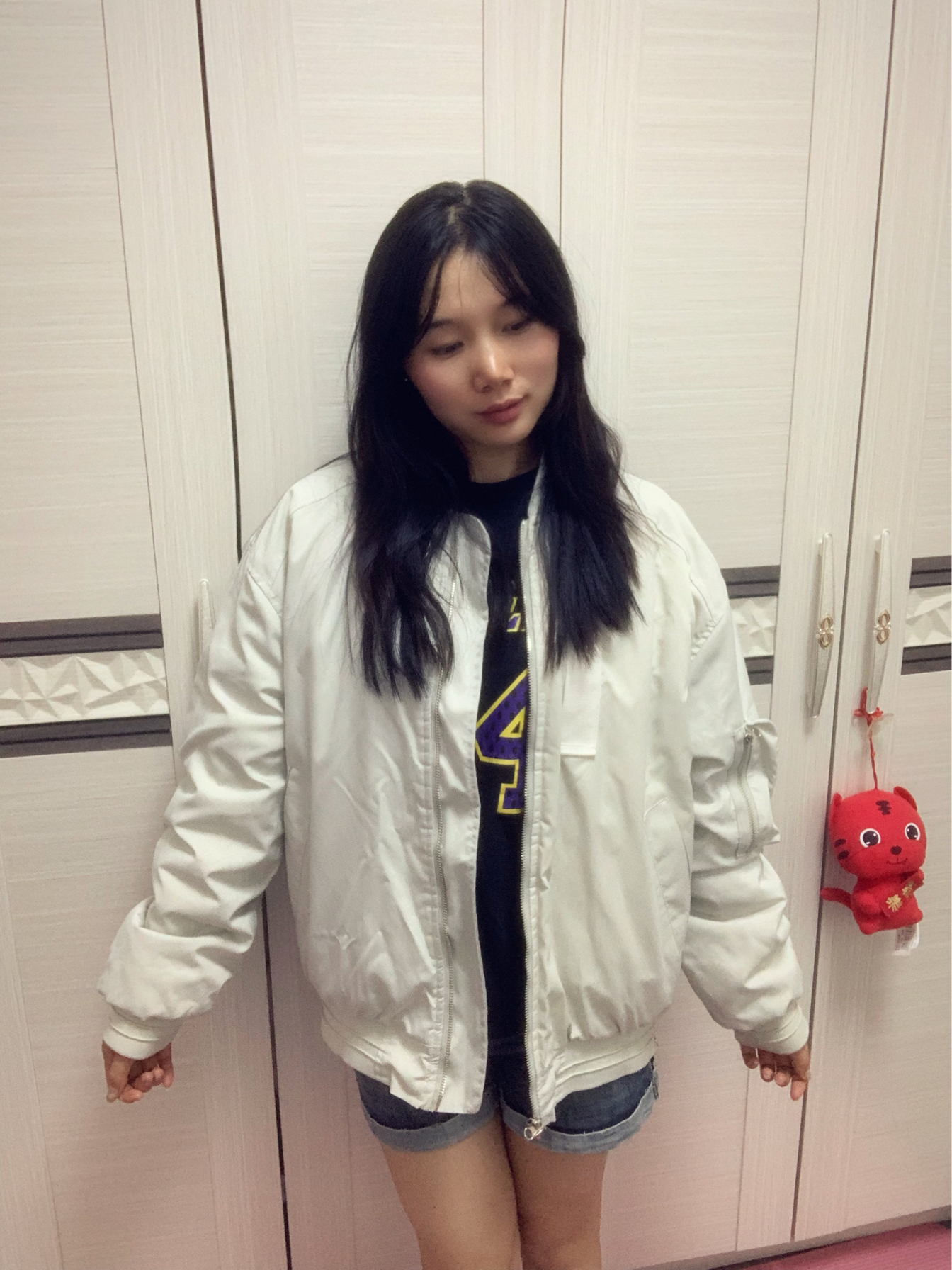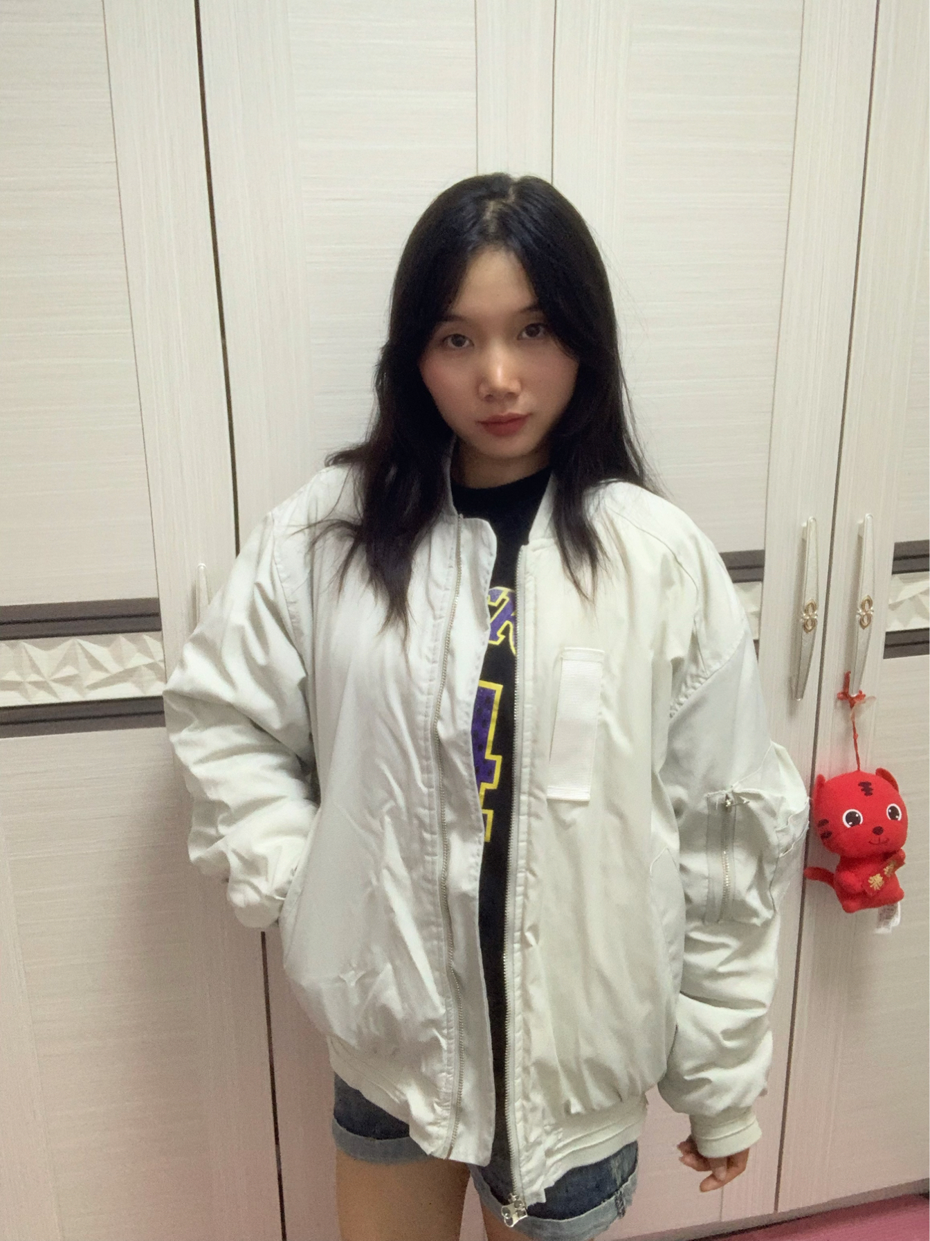 这件白灰色的夹克棒球服,颜色很百搭~ 内里夹棉,秋冬加一件卫衣就很保暖😇 衣服两侧的下摆都做了拉链,可以把它拉上去,漏出里面衣服的颜色,增加层次感,酷酷的!😍 其次在左边的袖子上,做了一个自带金属拉链的小口袋,不仅是装饰还可以放一些耳机之类的小东西,实用又帅气的设计❤️🔥 衣服后面刺绣的设计更是一绝 整件衣服完全就是帅气的美式风🤩