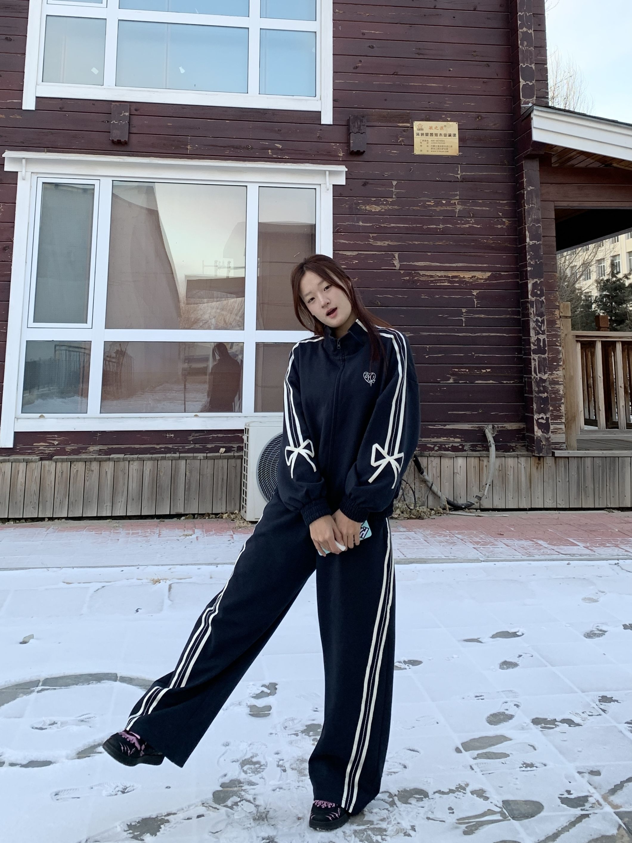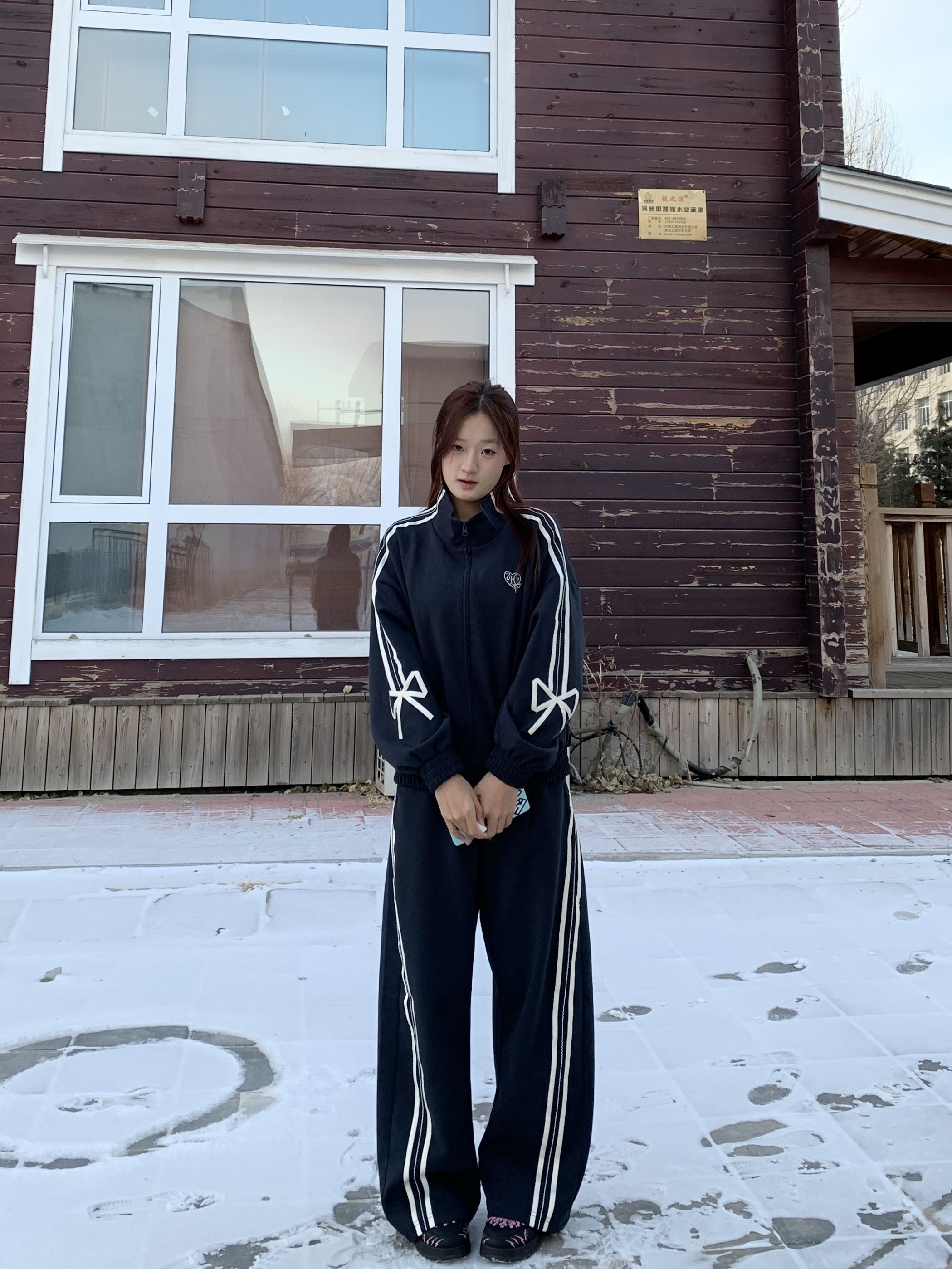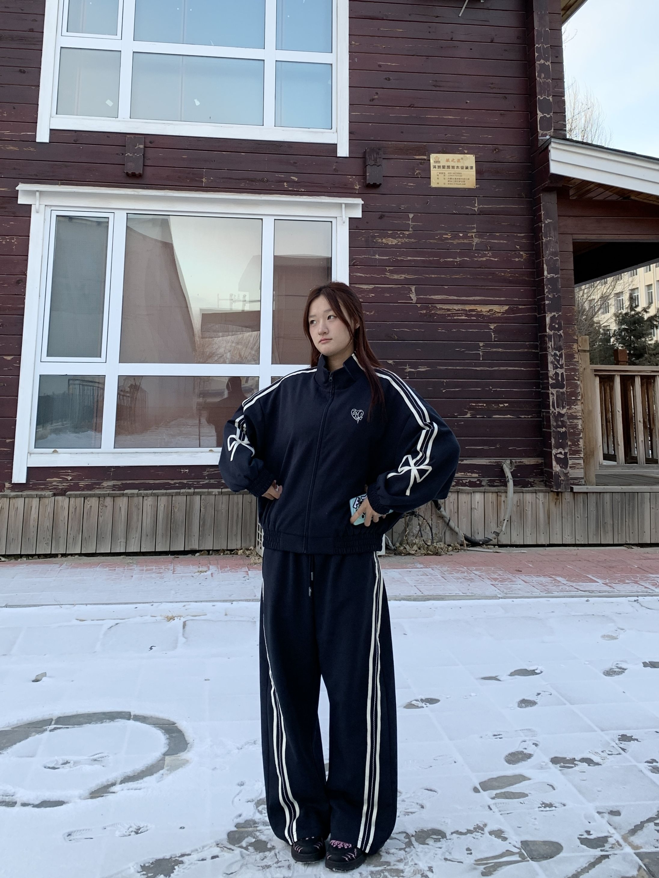 今天这套太舒服啦~ 慵懒感十足哦 面料滑滑的 一点不粘毛 还不容易脏 出门裤脚踩脏了 回去拍拍就干净了 藏青色显白界一把好手 袖口蝴蝶结设计🎀敲可爱 开春穿这个太吸睛啦 而且套装也不用费心去搭配 日常通勤都很合适