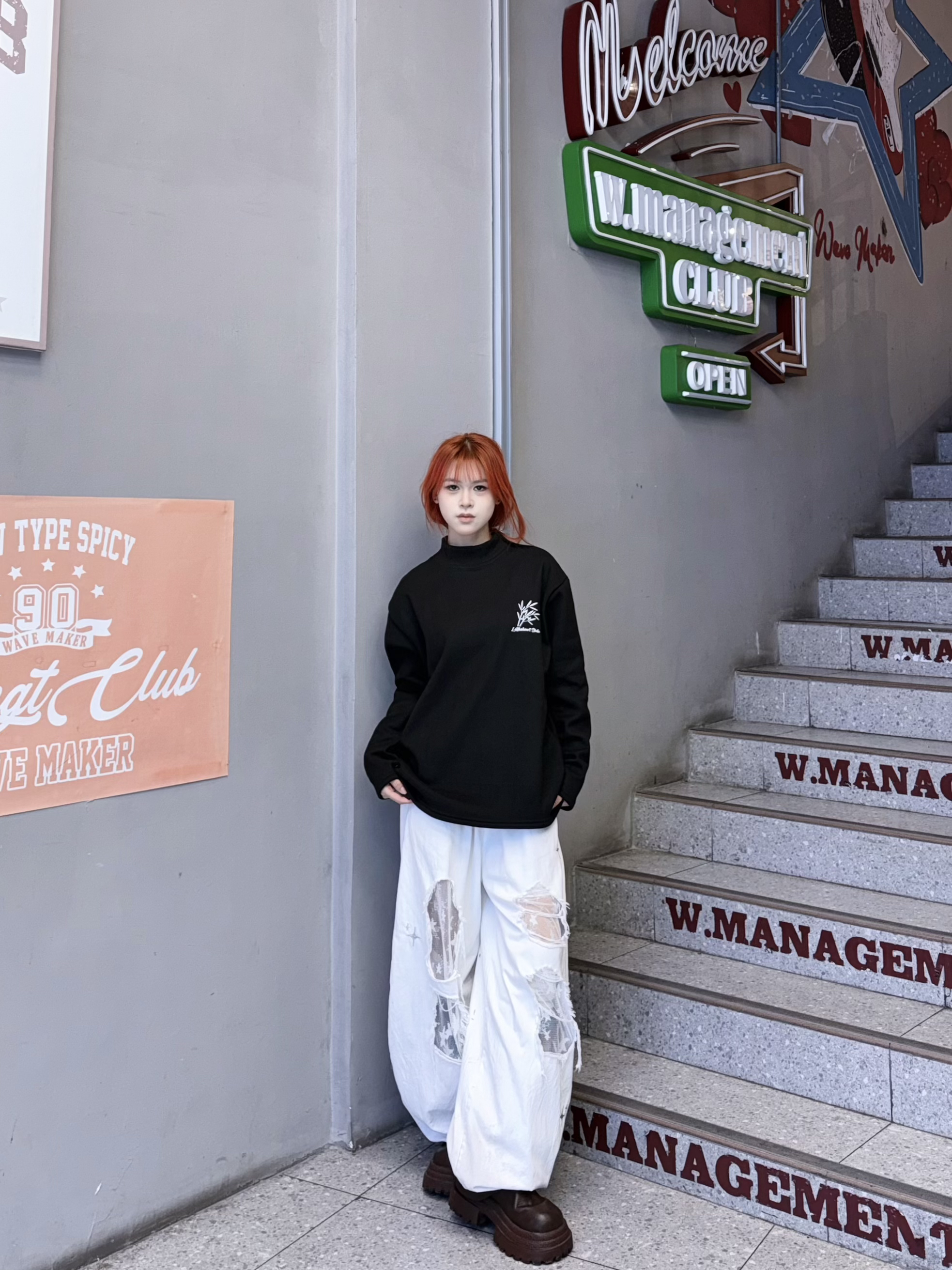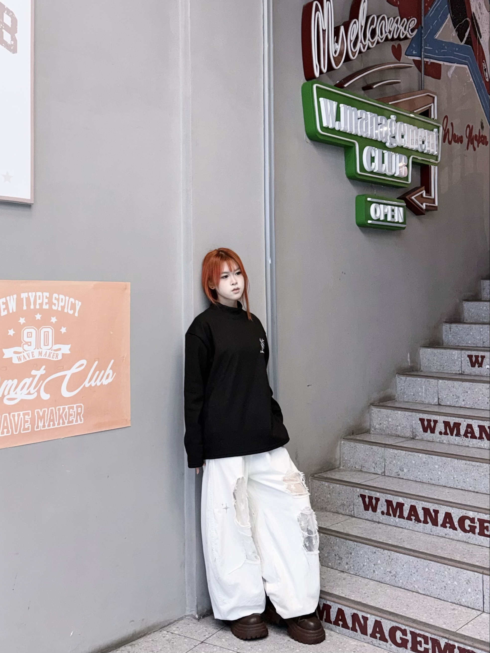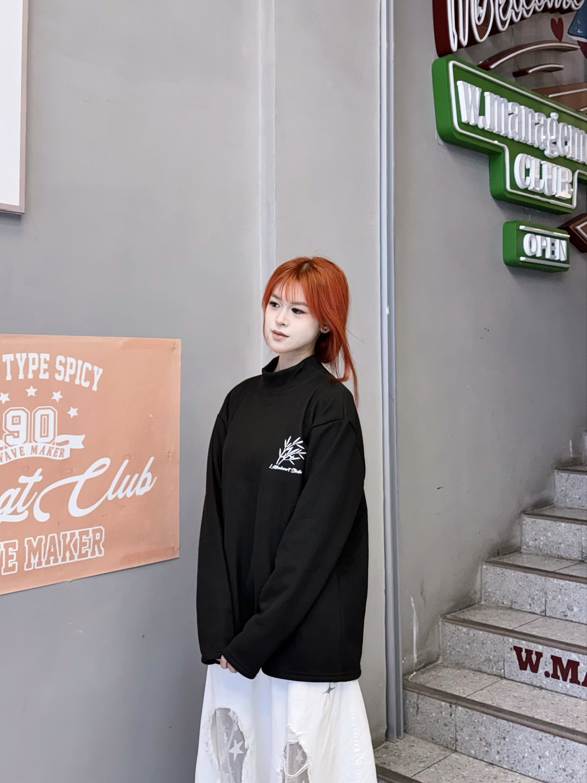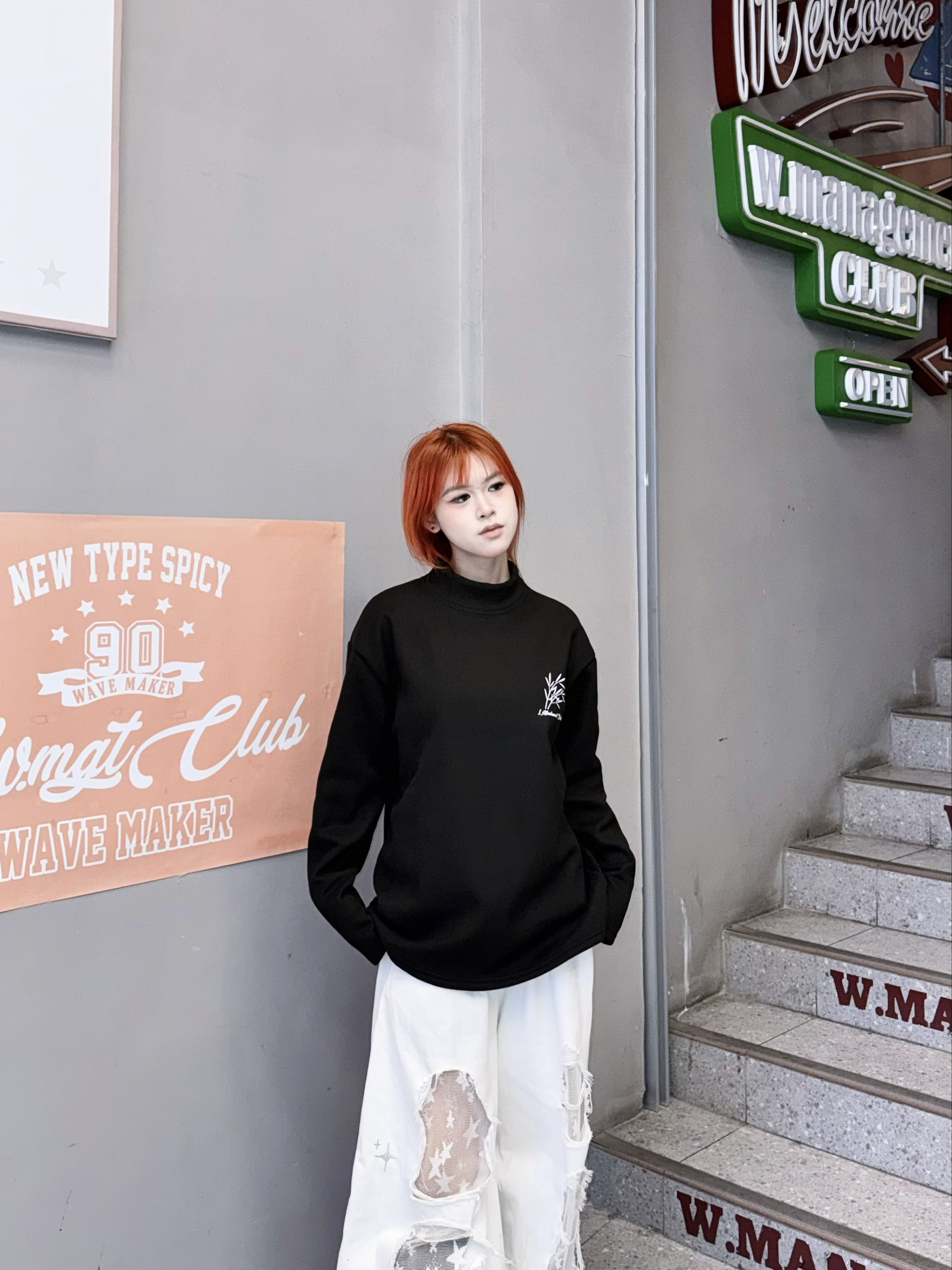这款黑色小高领长袖是经典的小高领版型超贴合颈部,不会勒脖子还能修饰脖颈线条,单穿内搭都超合适。面料是软糯的棉质混纺,摸起来手感巨舒服,贴身穿亲肤不扎肉,而且做了微宽松的剪裁,对各种身材都超友好,藏肉效果一绝!左胸口还有个简约的白色小刺绣图案,低调又有辨识度,瞬间让基础款摆脱单调感。 搭配白色大破洞阔腿牛仔裤,黑白撞色视觉冲击力拉满,再踩一双厚底马丁靴,秒变酷女孩,出门炸街回头率超高;搭配灰色运动...