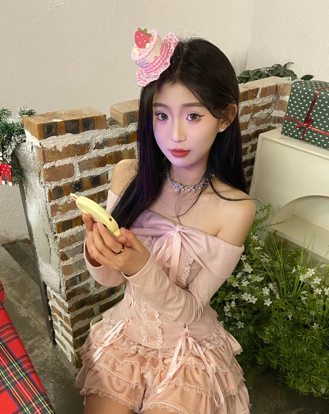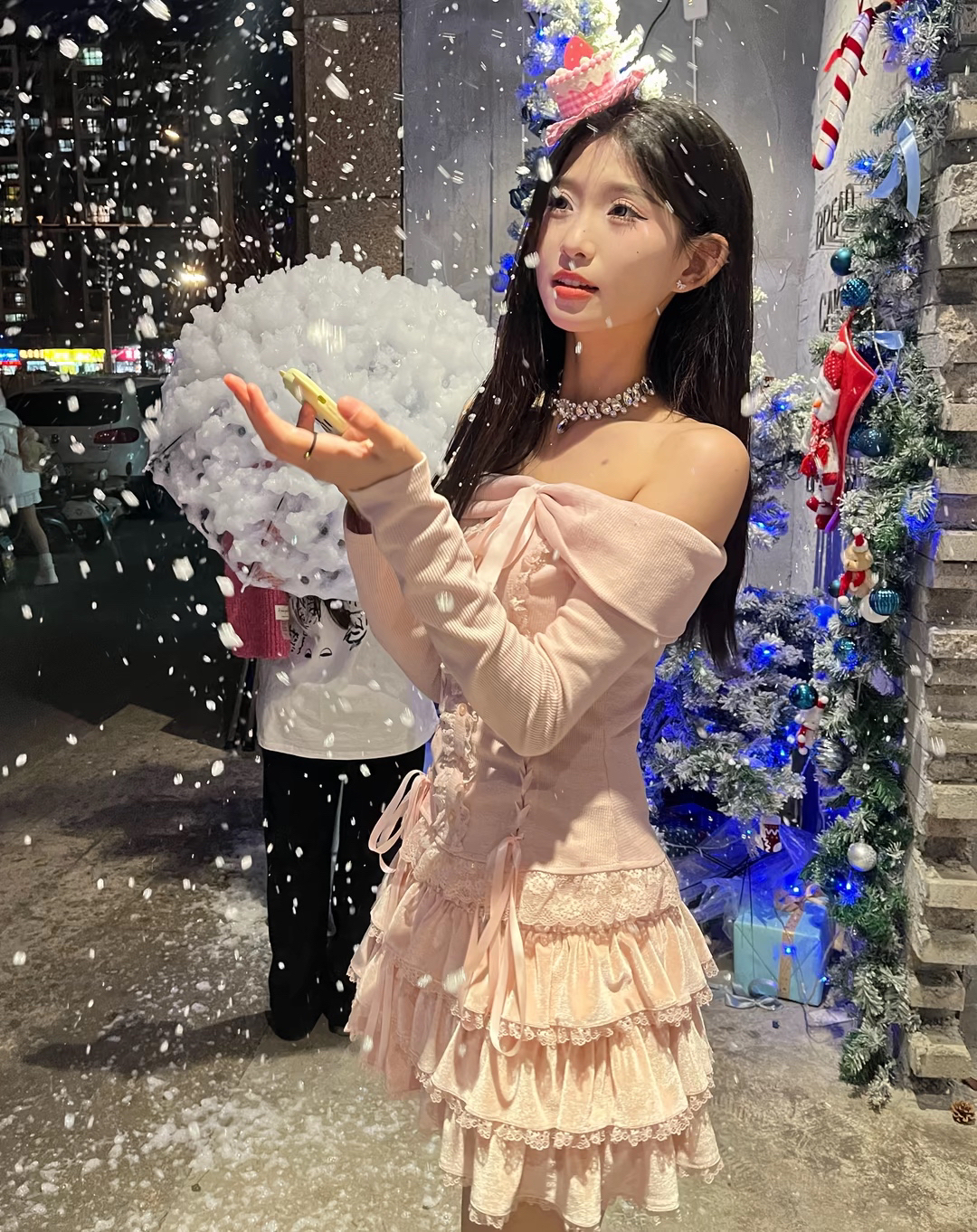我就这样粉粉的过圣诞节🎄 今天头顶粉色小蛋糕 🧁 搭配同色系蛋糕蓬蓬裙 绑带设计像一个芭蕾舞者💃