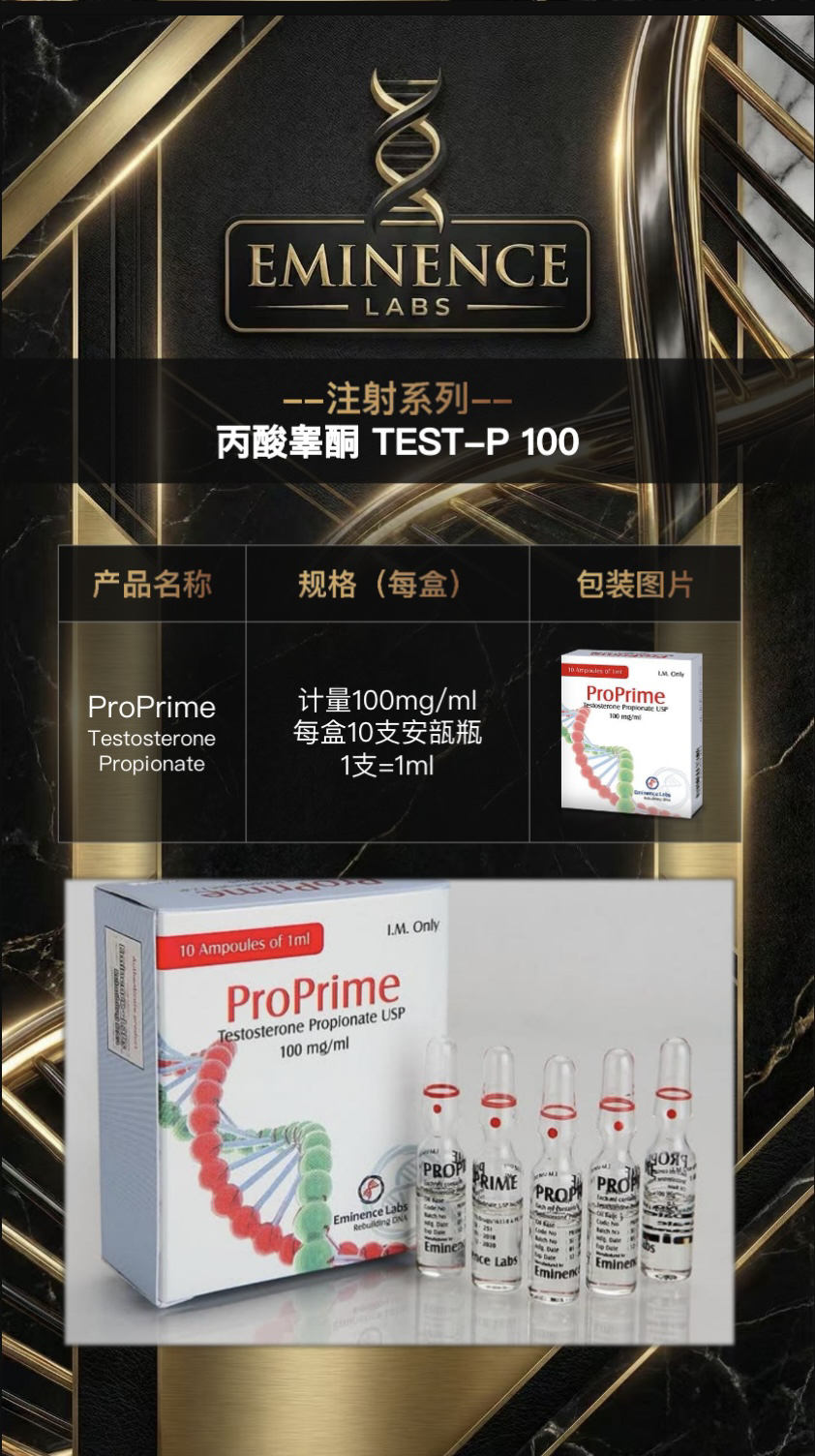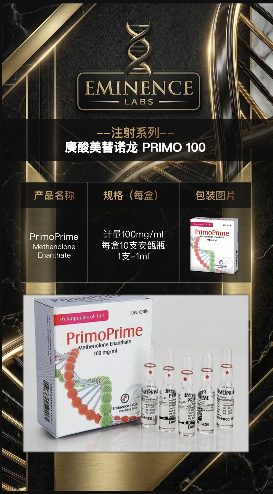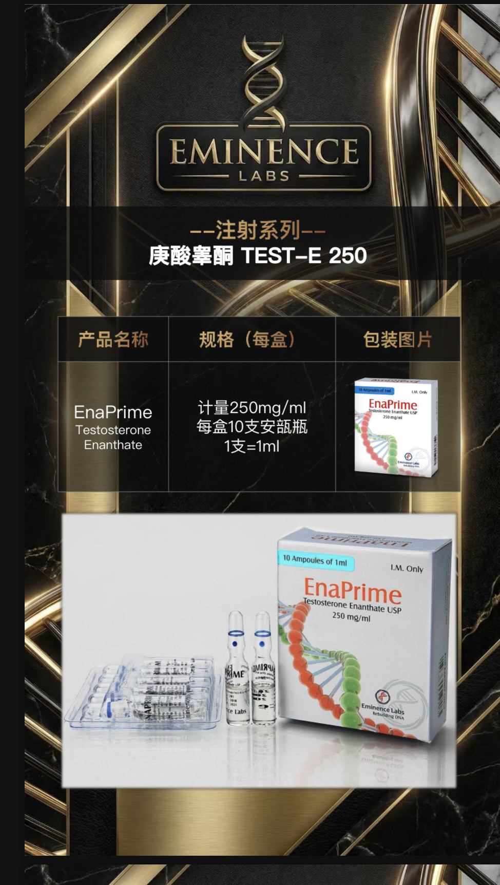 Eminence Labs 卓越门次是全球领先的 制药公司,提供符合药品标准的优质产品, 业务覆盖多个国家 Eminence Labs 卓越门次的注射系列只提供 医药规格的安瓿瓶包装。覆盖各大医药公司 生产过的合成代谢产品,包括睾酮、群勃龙、 诺龙等系列。 Eminence Labs 卓越门次的口服系列只提供 医药规格的PTP铝塑包装。覆盖各大医药公司 生产过的合成代谢产品,包括克伦、氧雄...