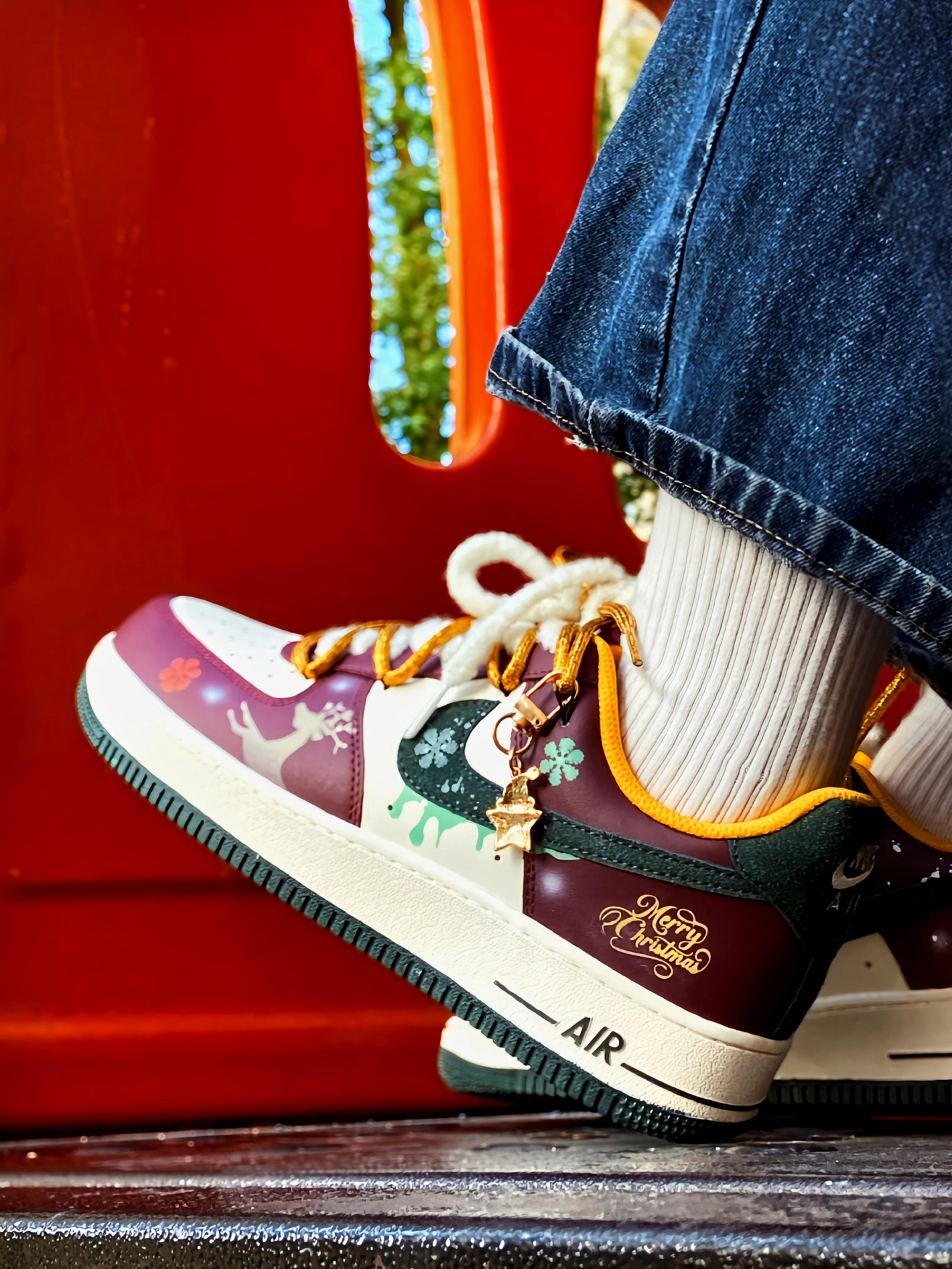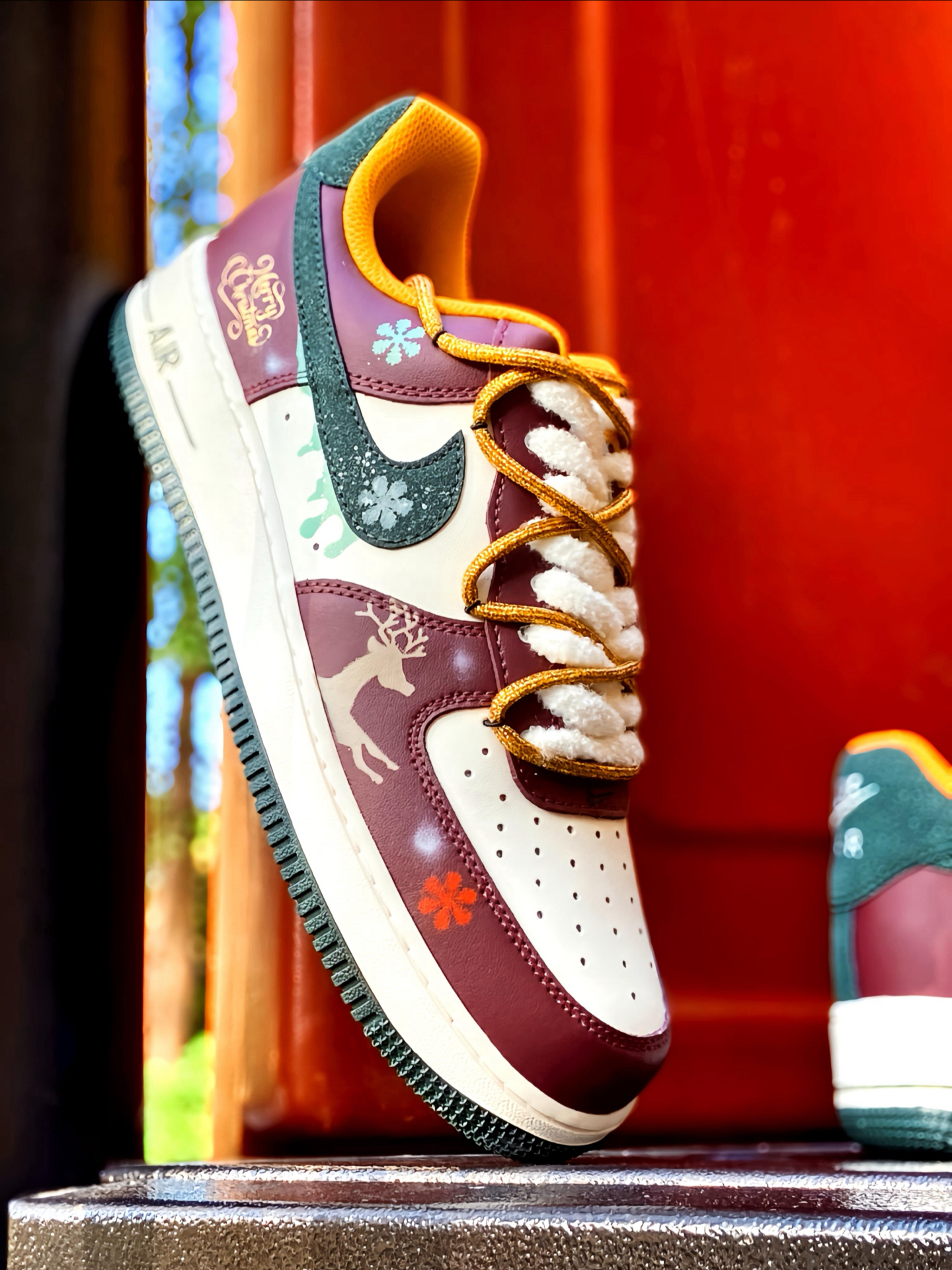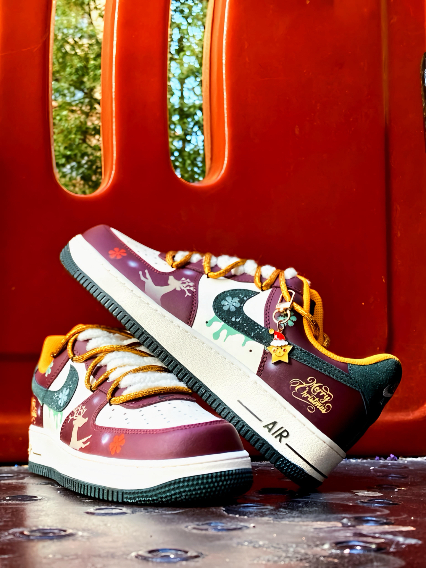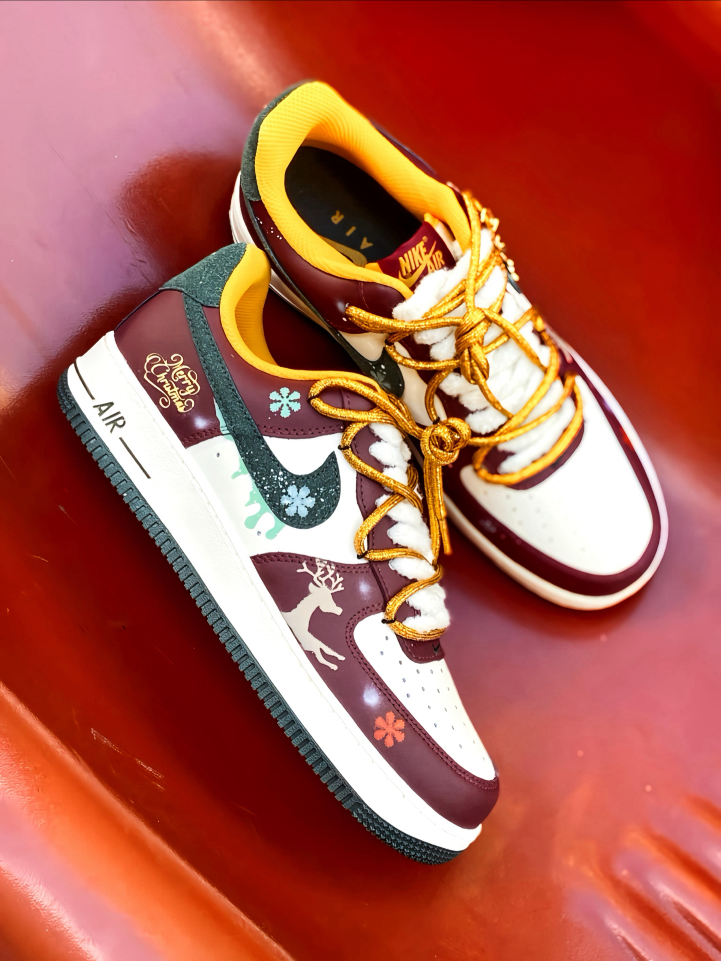 🎄 被这双 AF1 帅到了! 酒红搭配白色,再点缀墨绿和金色细节 一上脚圣诞氛围感直接拉满 特别是鞋面上的麋鹿和雪花图案这些小细节 还有🎅小吊饰,我是真的喜欢 而且还是双鞋带的设计 解构风满满 圣诞穿这双回头率都高了 鞋头有透气孔 久穿也不闷脚 平常配牛仔裤、工装裤啥的都好看 脚感就是正常 AF1 的脚感 自穿或者送礼 🎁 都是蛮不错的 码数正常选就行 ! #运动达人的送礼清单 #双旦礼物礼物...
