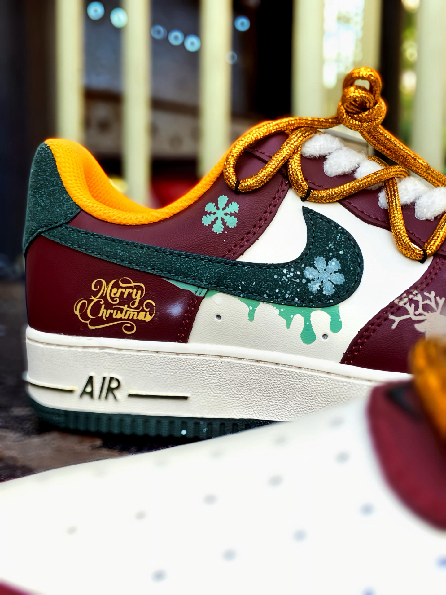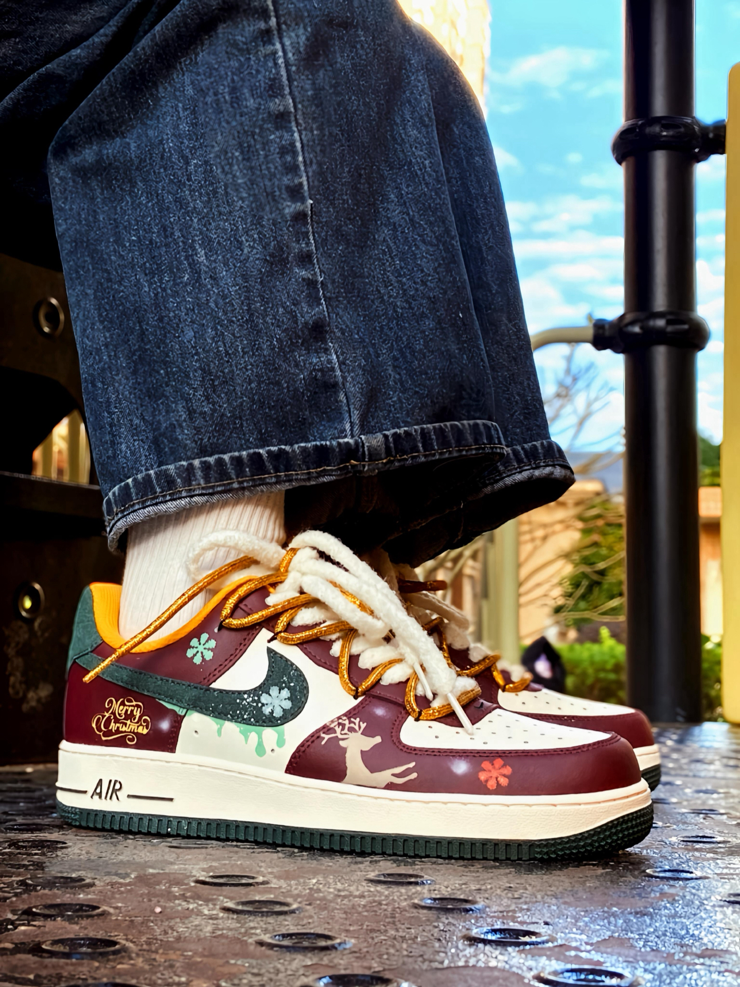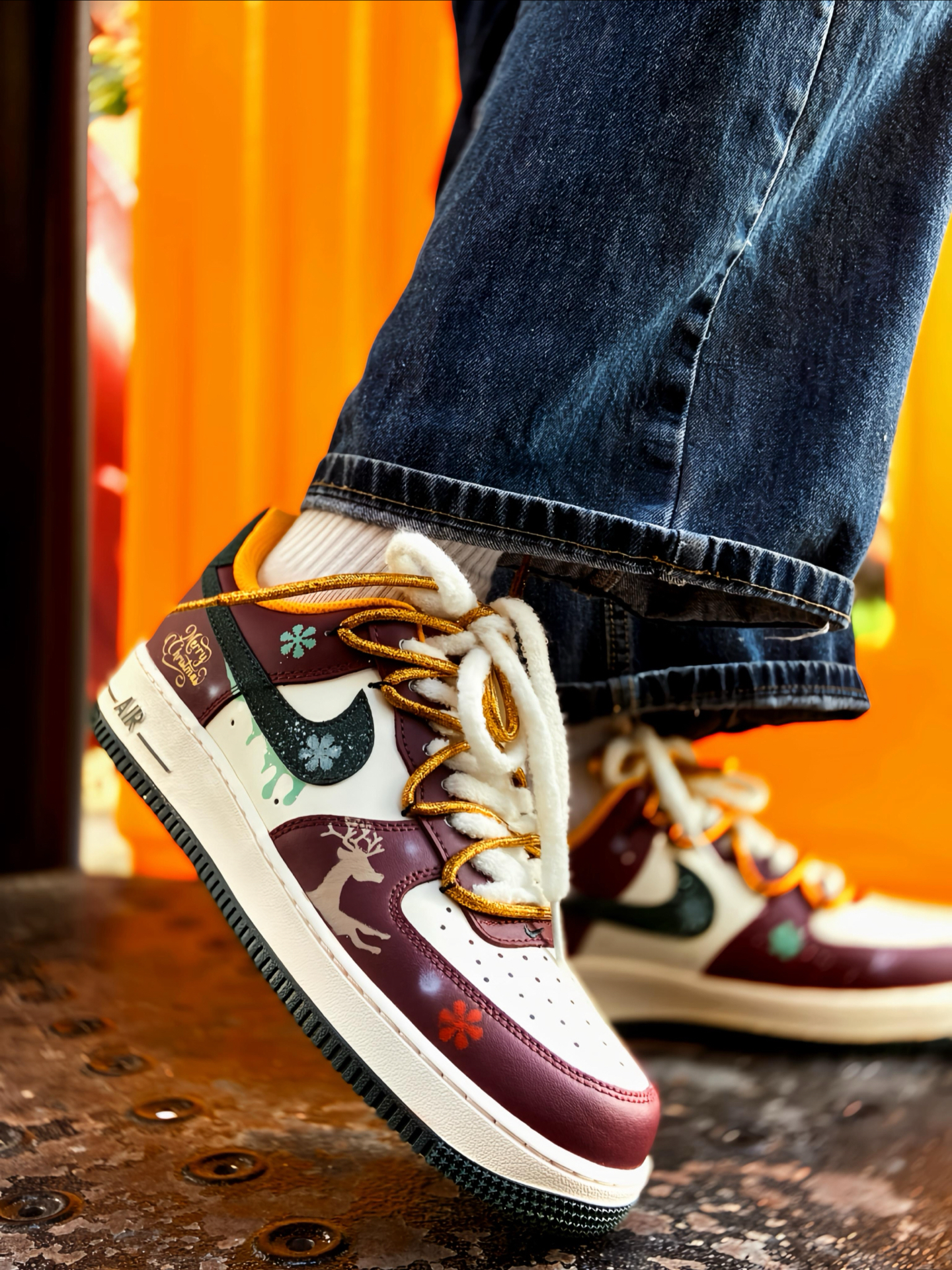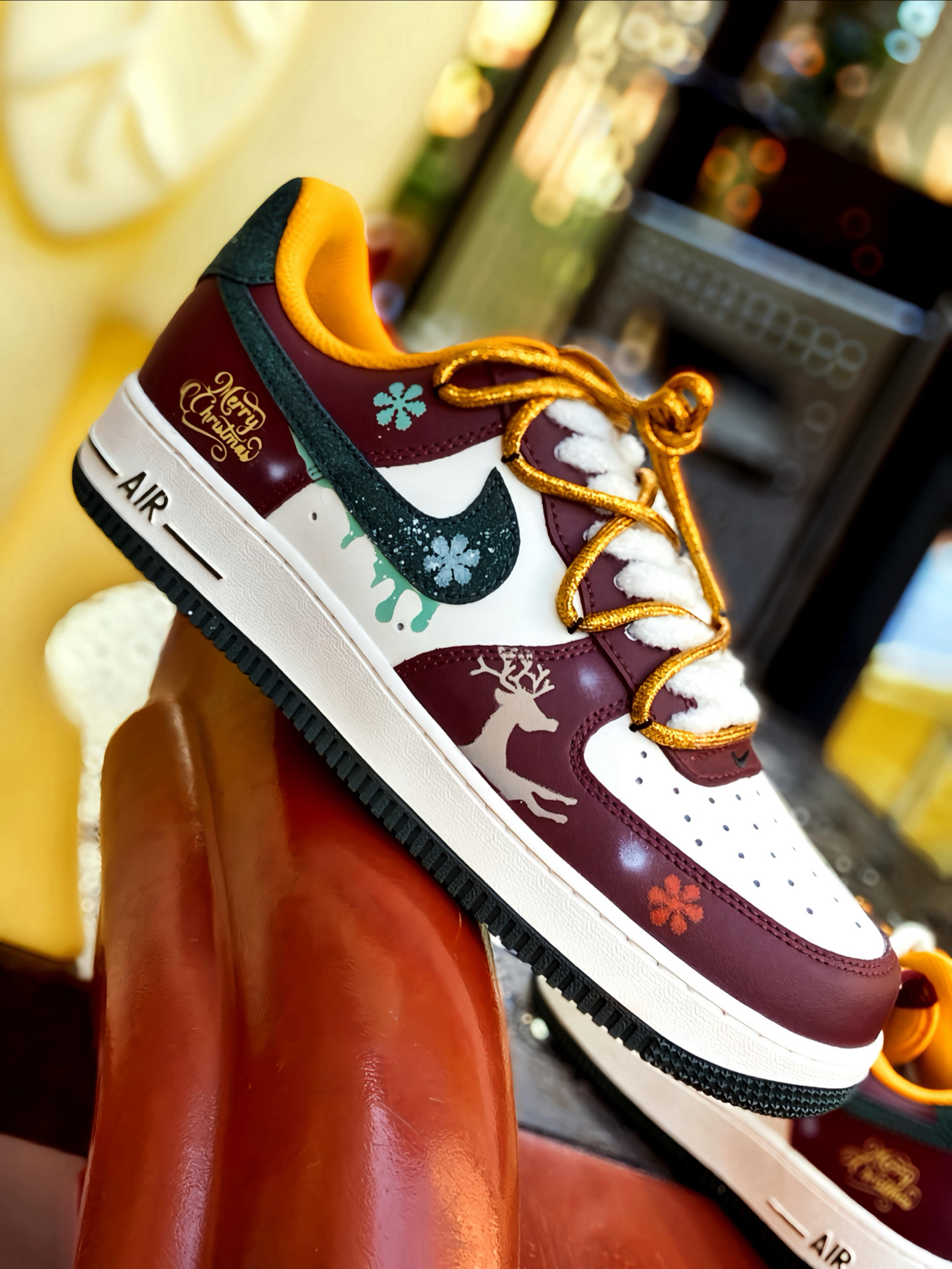 🎄 被这双 AF1 帅到了! 酒红搭配白色,再点缀墨绿和金色细节 一上脚圣诞氛围感直接拉满 特别是鞋面上的麋鹿和雪花图案这些小细节 还有🎅小吊饰,我是真的喜欢 而且还是双鞋带的设计 解构风满满 圣诞穿这双回头率都高了 鞋头有透气孔 久穿也不闷脚 平常配牛仔裤、工装裤啥的都好看 脚感就是正常 AF1 的脚感 自穿或者送礼 🎁 都是蛮不错的 码数正常选就行 ! #运动达人的送礼清单 #双旦礼物礼物...