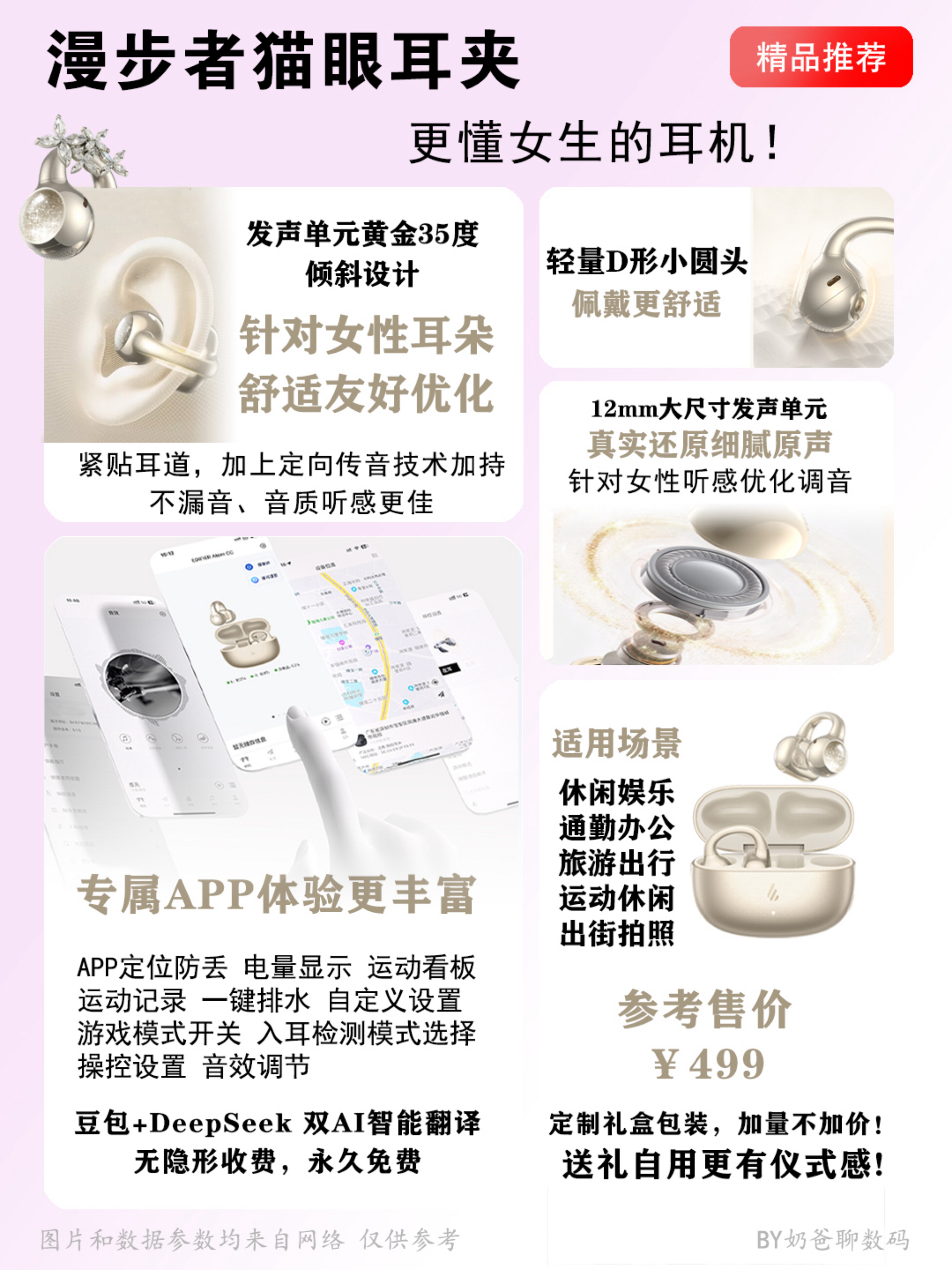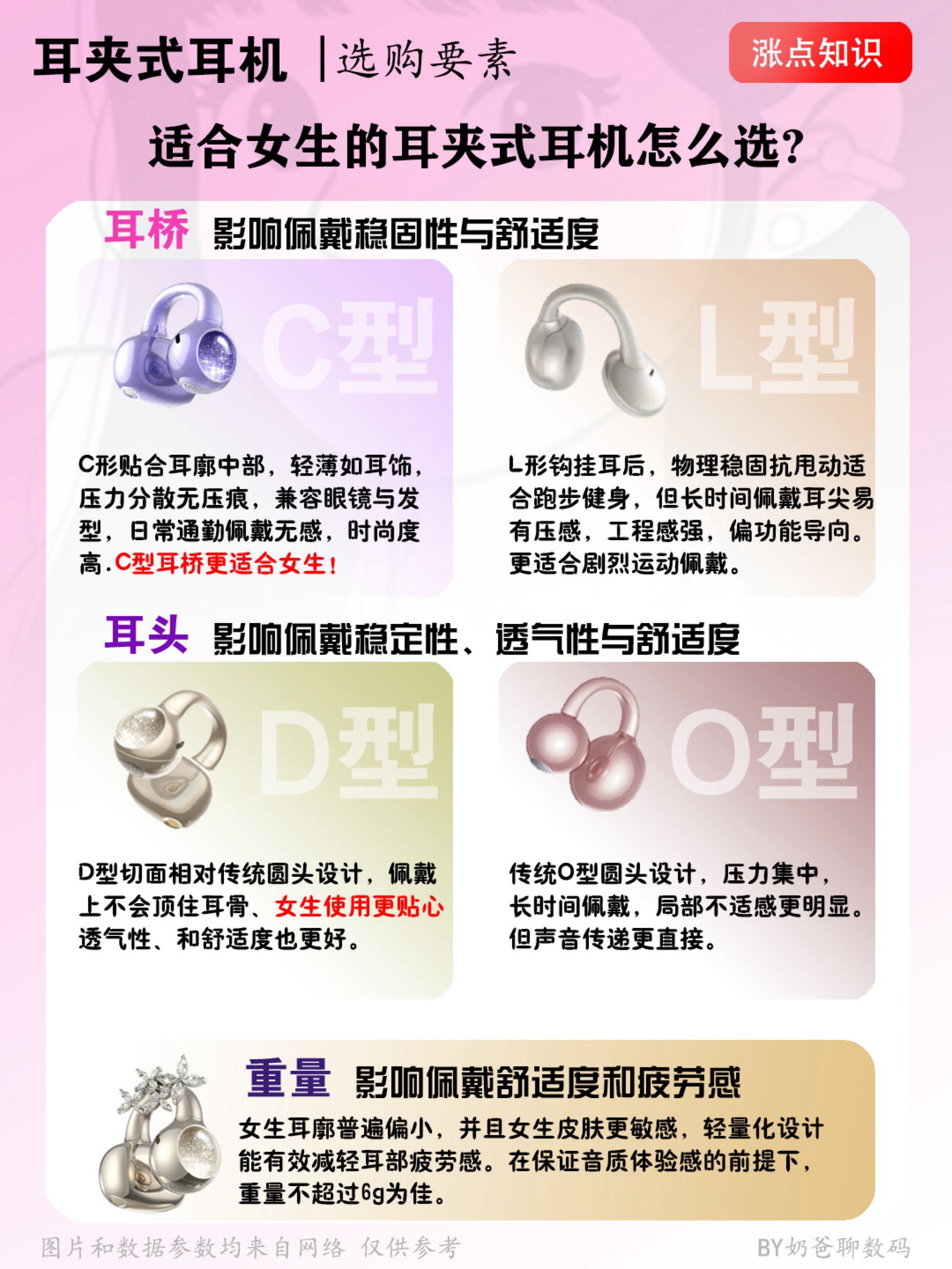 还在为选耳夹式耳机头疼吗?👂 耳夹式设计确实舒服,但漏音、压耳、滑落…问题也不少 看完这篇,你就知道怎么挑了~ 💡 核心要点在这: ✅ 选对「耳桥」是关键! C型设计更适合日常,像耳饰一样轻贴耳廓,戴眼镜也不影响,真正无感佩戴 L型适合运动狂人,钩挂更牢,但久戴可能压耳朵 女生通勤休闲,闭眼入C型就对了 ✅「耳头」决定舒适度! 优先选D型切面设计,不顶耳骨,透气...