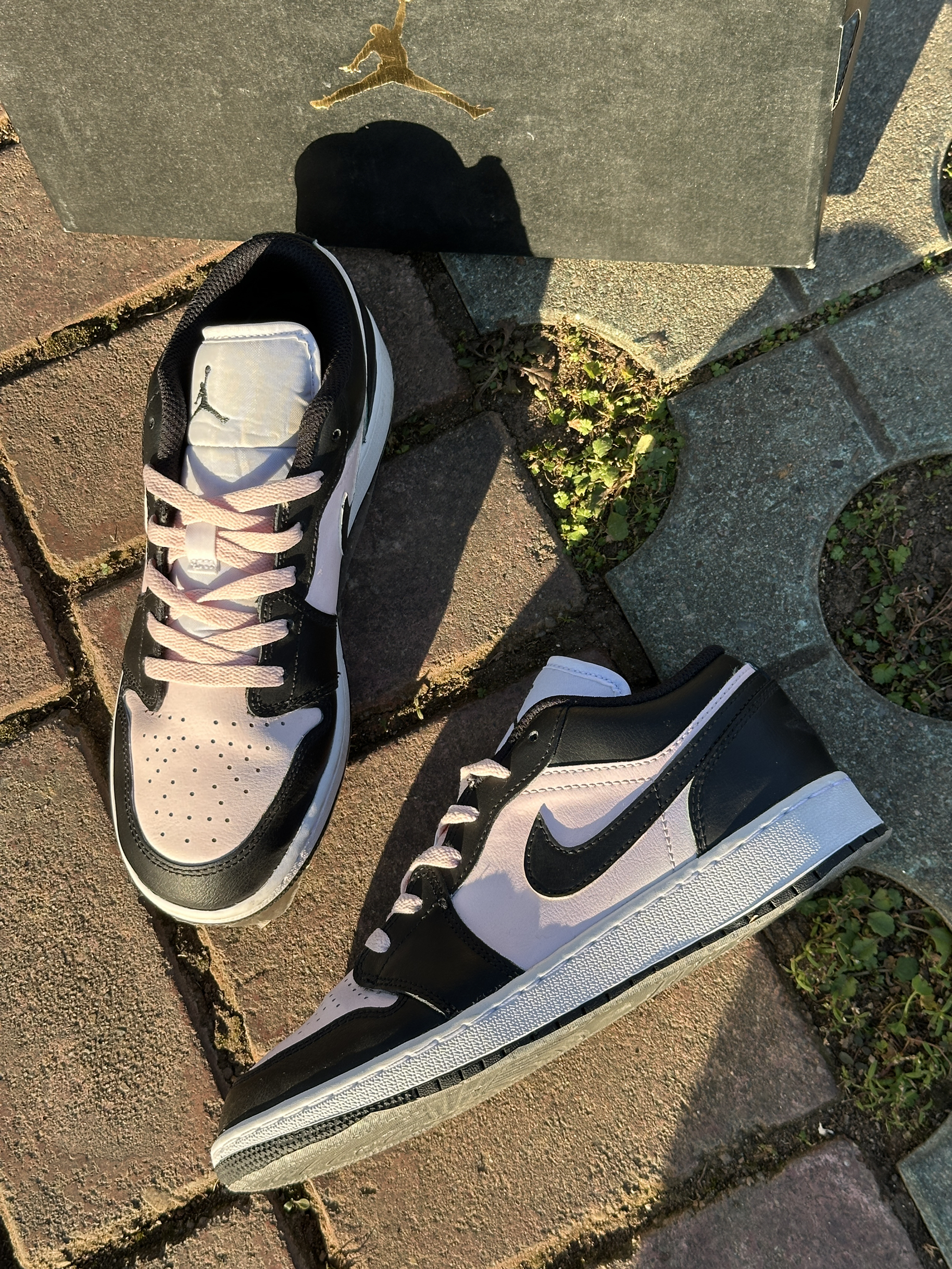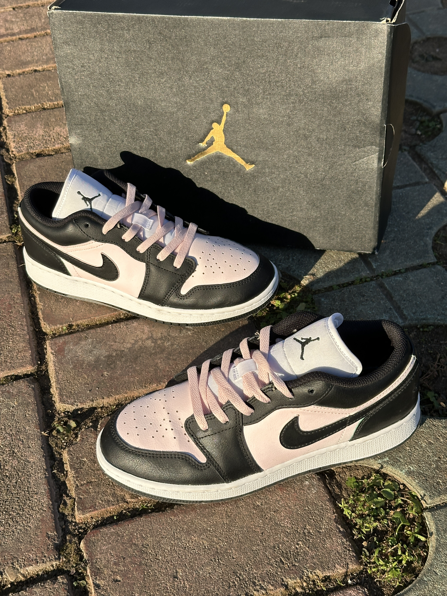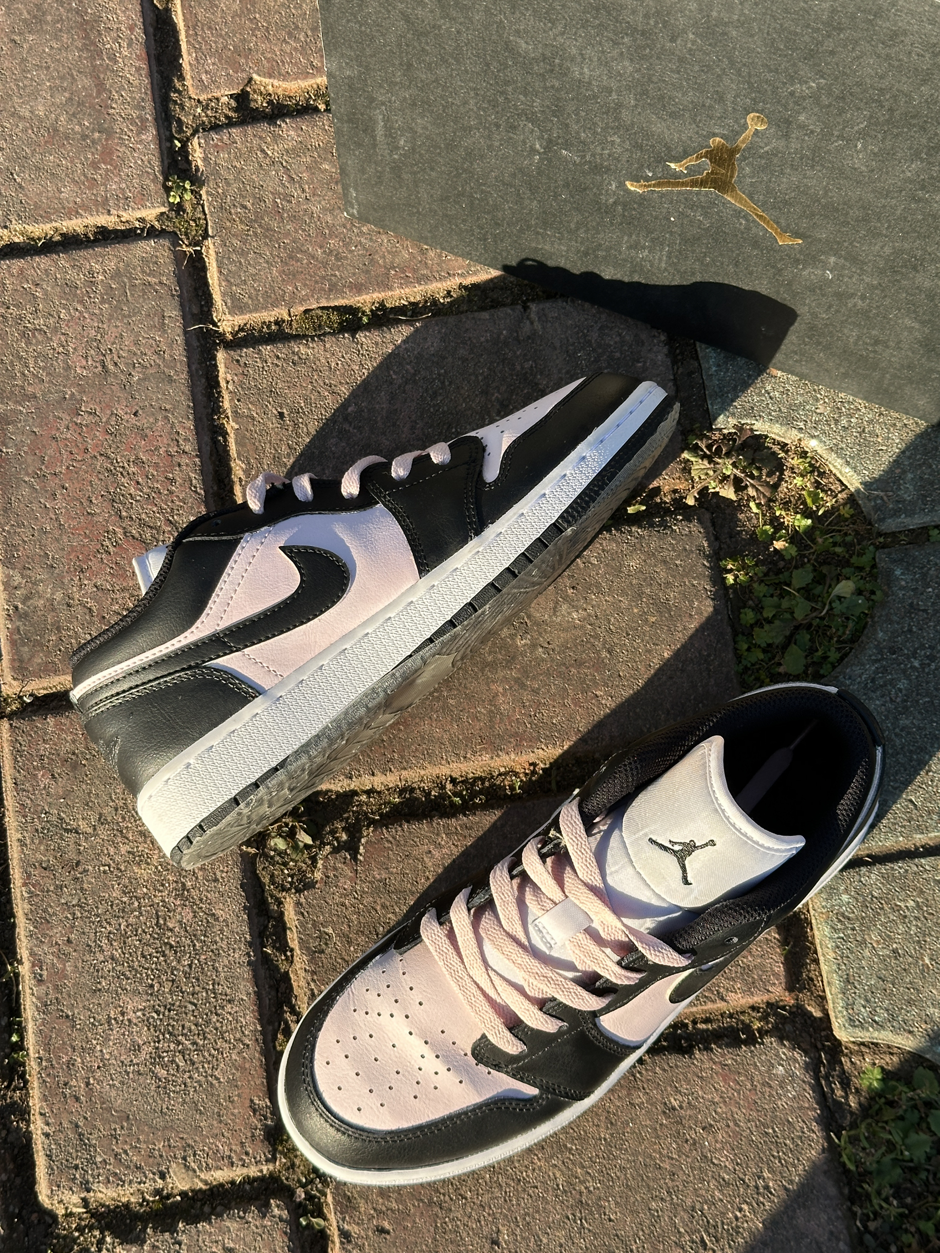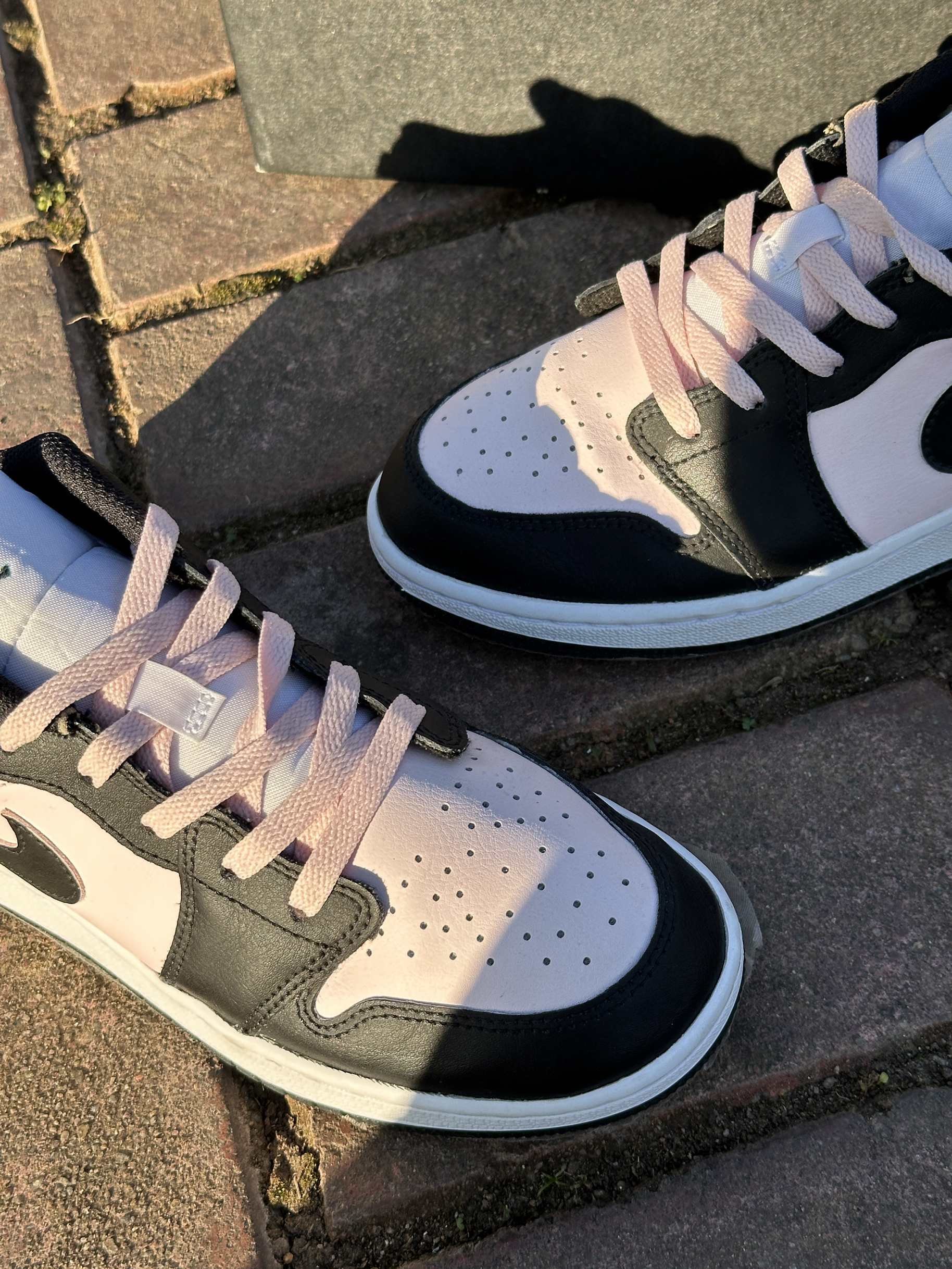 AJ1低帮这款粉黑撞色很戳审美 版型显瘦不压脚面。鞋底有韧劲不硌脚,日常遛弯逛街都适配✅鞋帮有点低,脚踝没支撑,走远路脚踝发酸。材质不挑水但不透气,夏天穿易出汗 版型简约不挑穿搭,耐看耐穿,胜在颜值戳人,日常出街拍照好看,小缺点磨合后能接受。