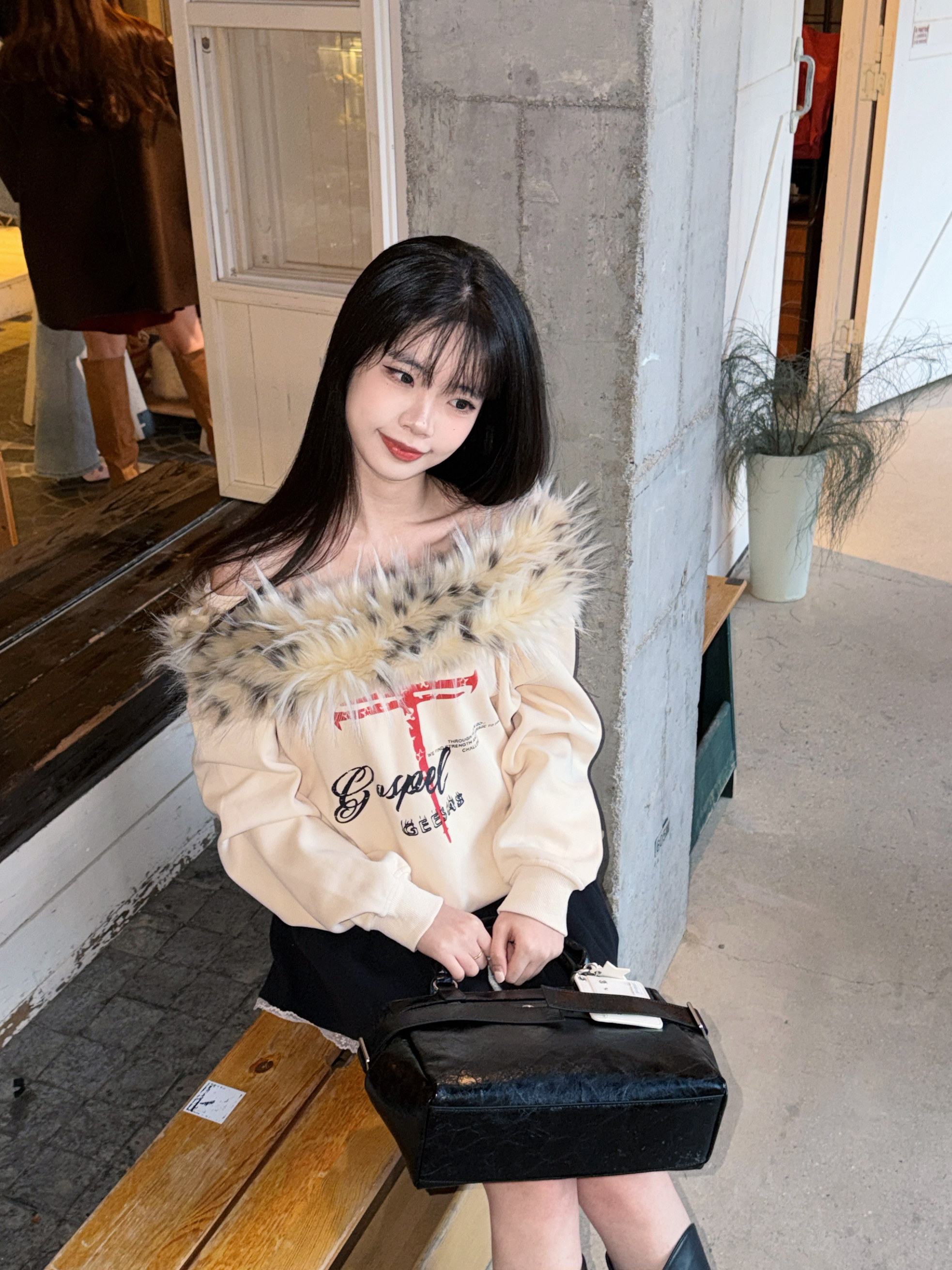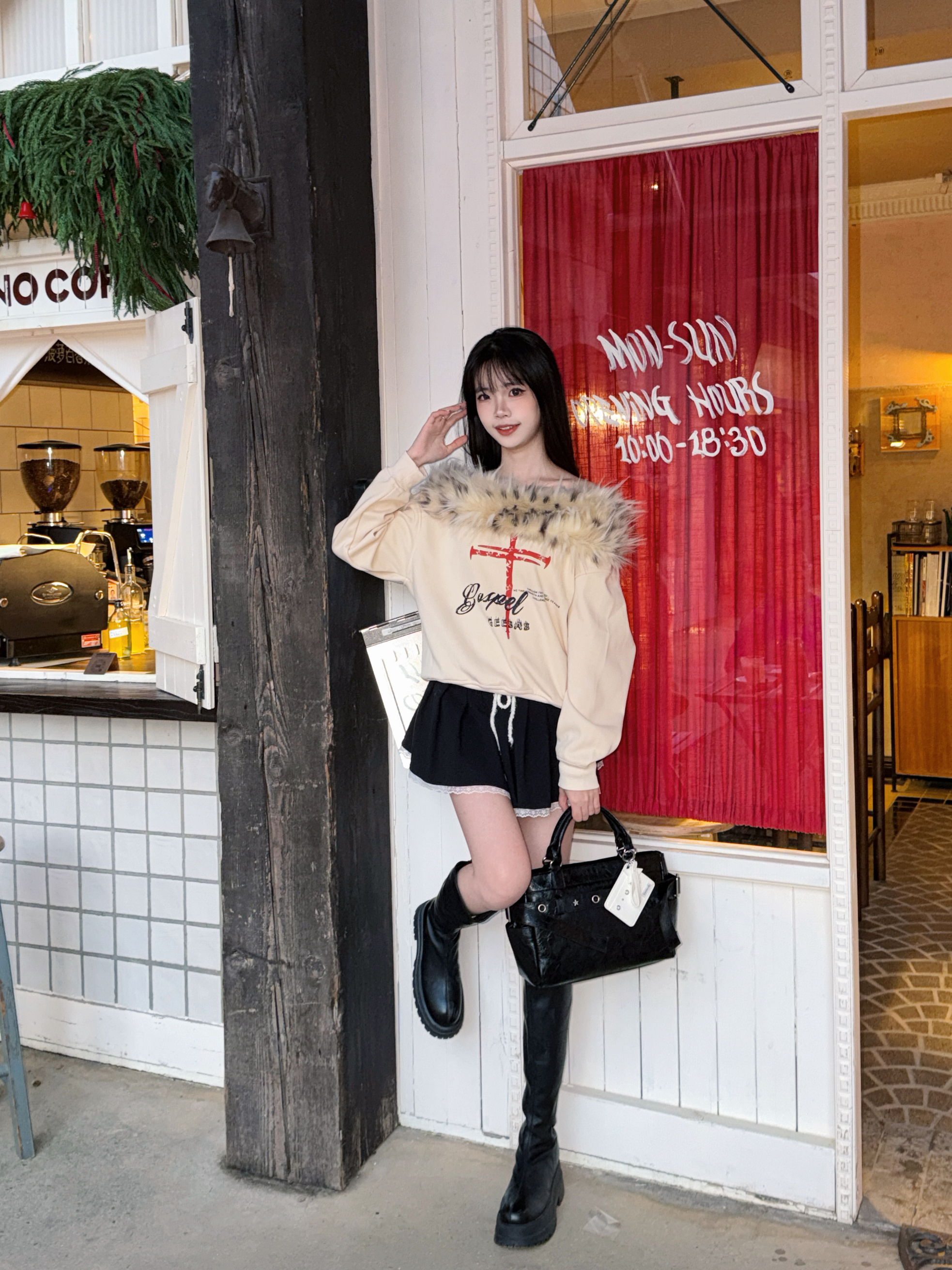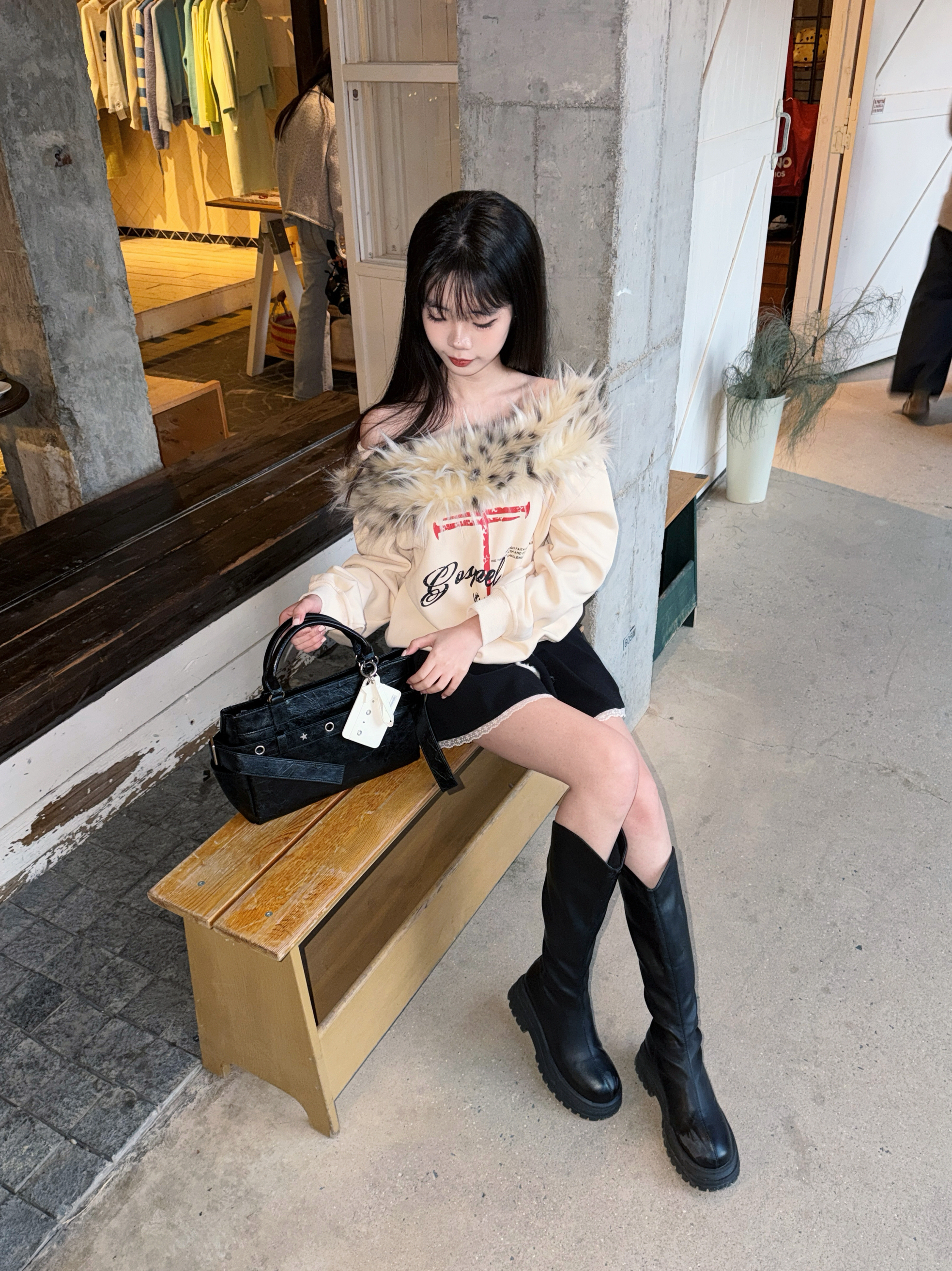 韩里韩气的甜酷感谁懂啊! 杏色毛领露肩卫衣自带慵懒氛围,毛领的设计又添了点小性感,胸前的印花还很有设计感~ 搭配黑色短裙+厚底长靴,直接拉长比例,甜妹秒变辣妹💥 再拎上vanwalk黑色机车包,细节感拉满 容量也很足够 随身物品都能装下 小雨伞也可以装喔 还搭配了白色的小卡包点缀 真的很精致时髦哇🍂 逛韩里韩气的小店太出片啦~