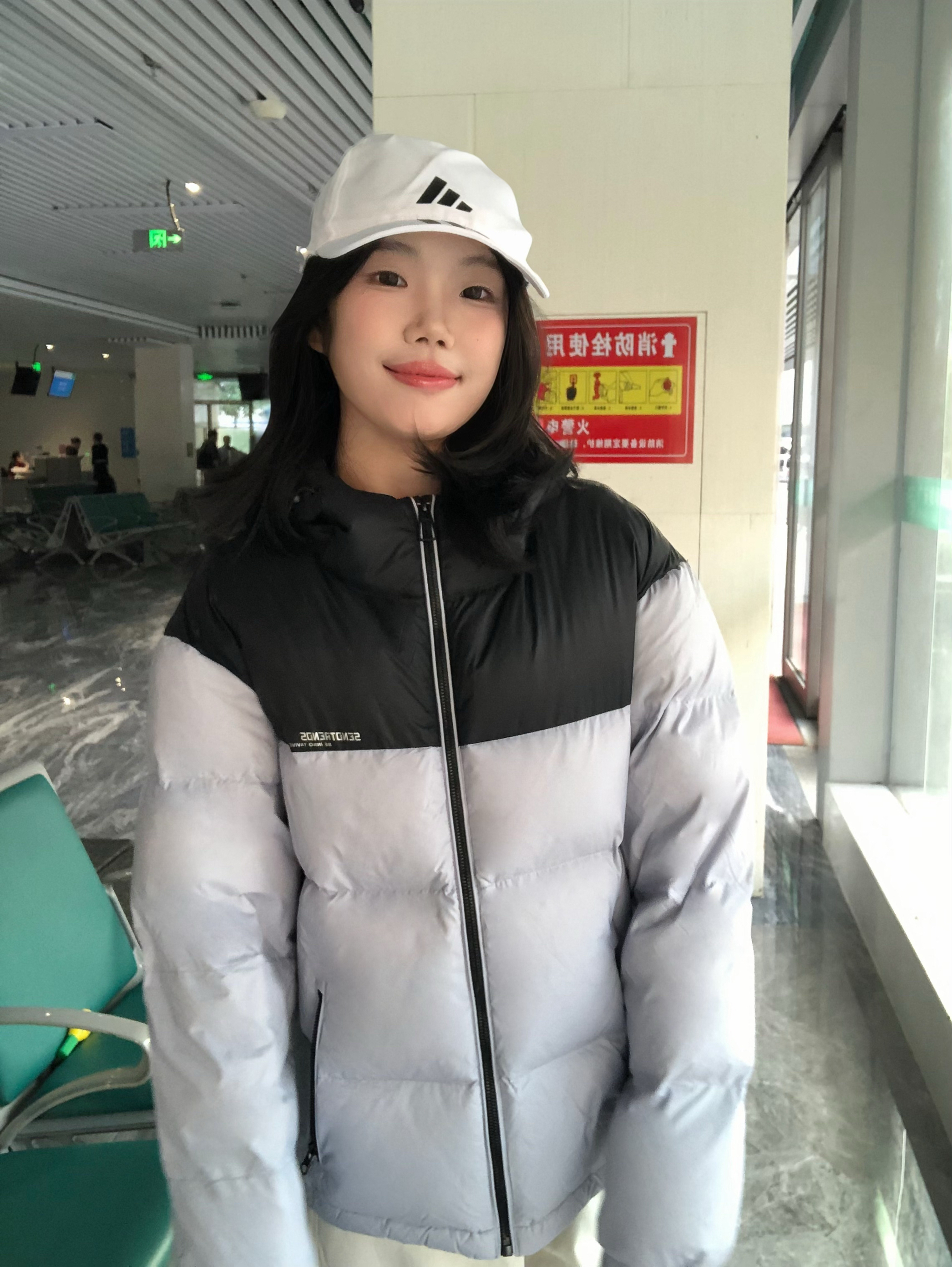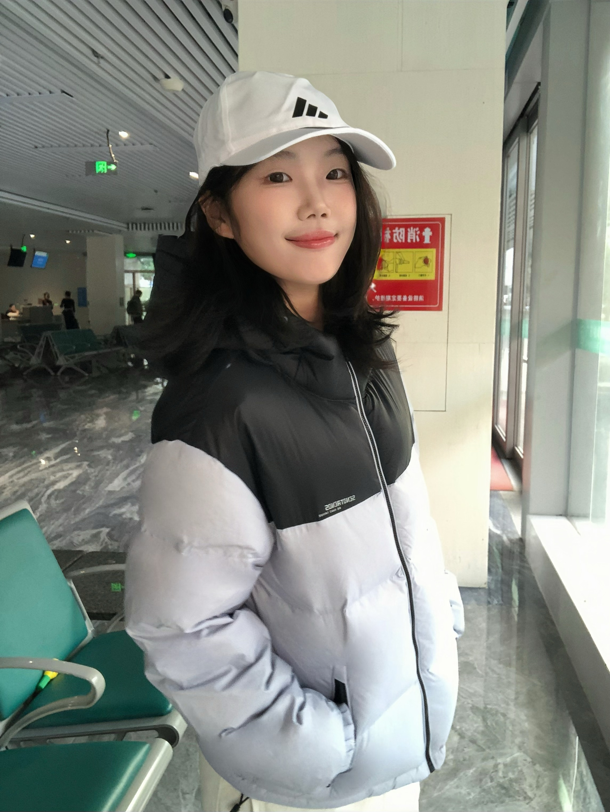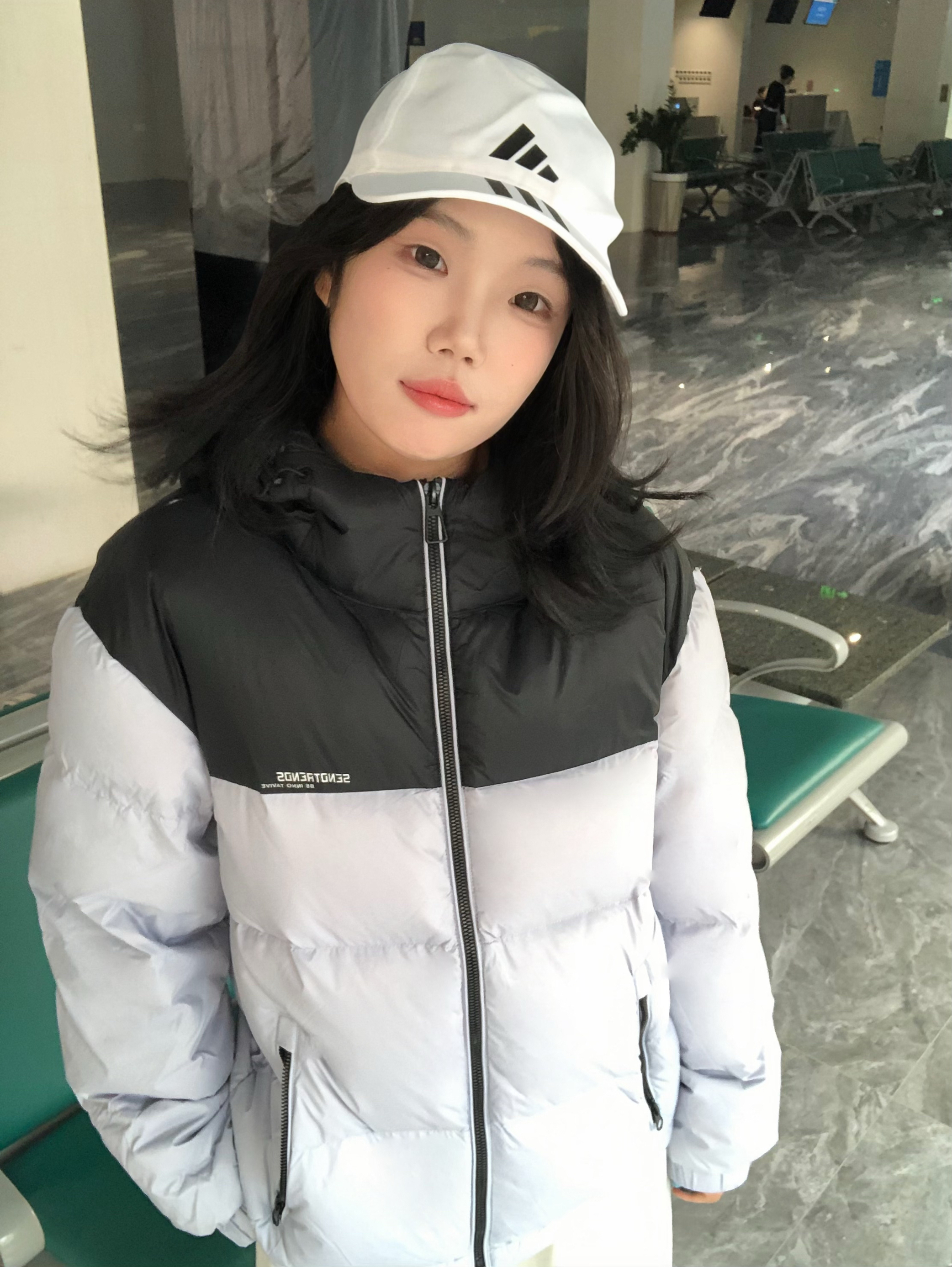 再冷也要搞穿搭 黑紫拼接羽绒搭配阿迪棒球帽 保暖不失潮流 羽绒上身轻薄不压身 163/100M