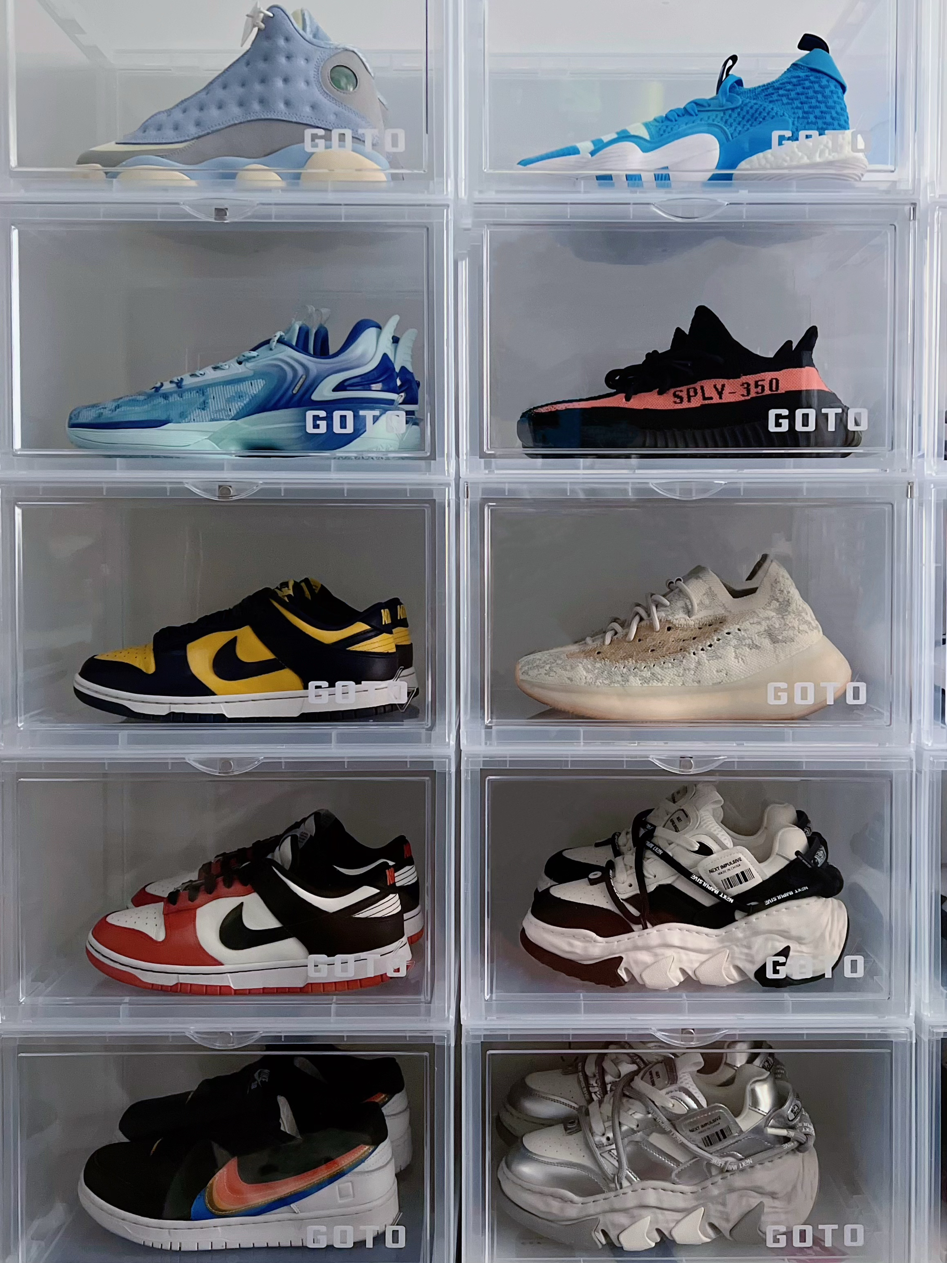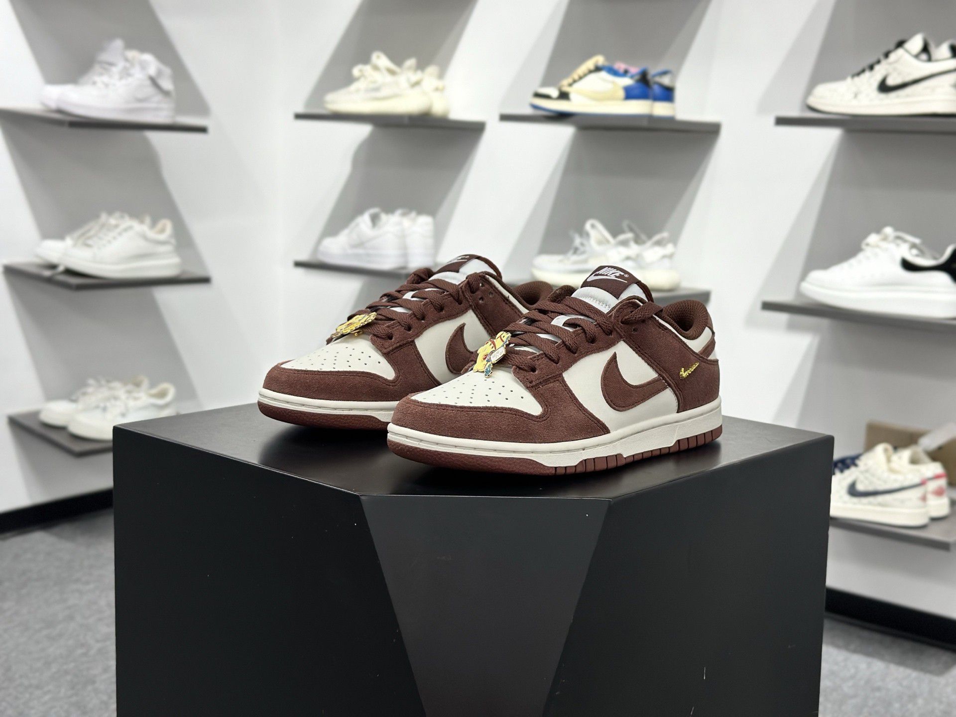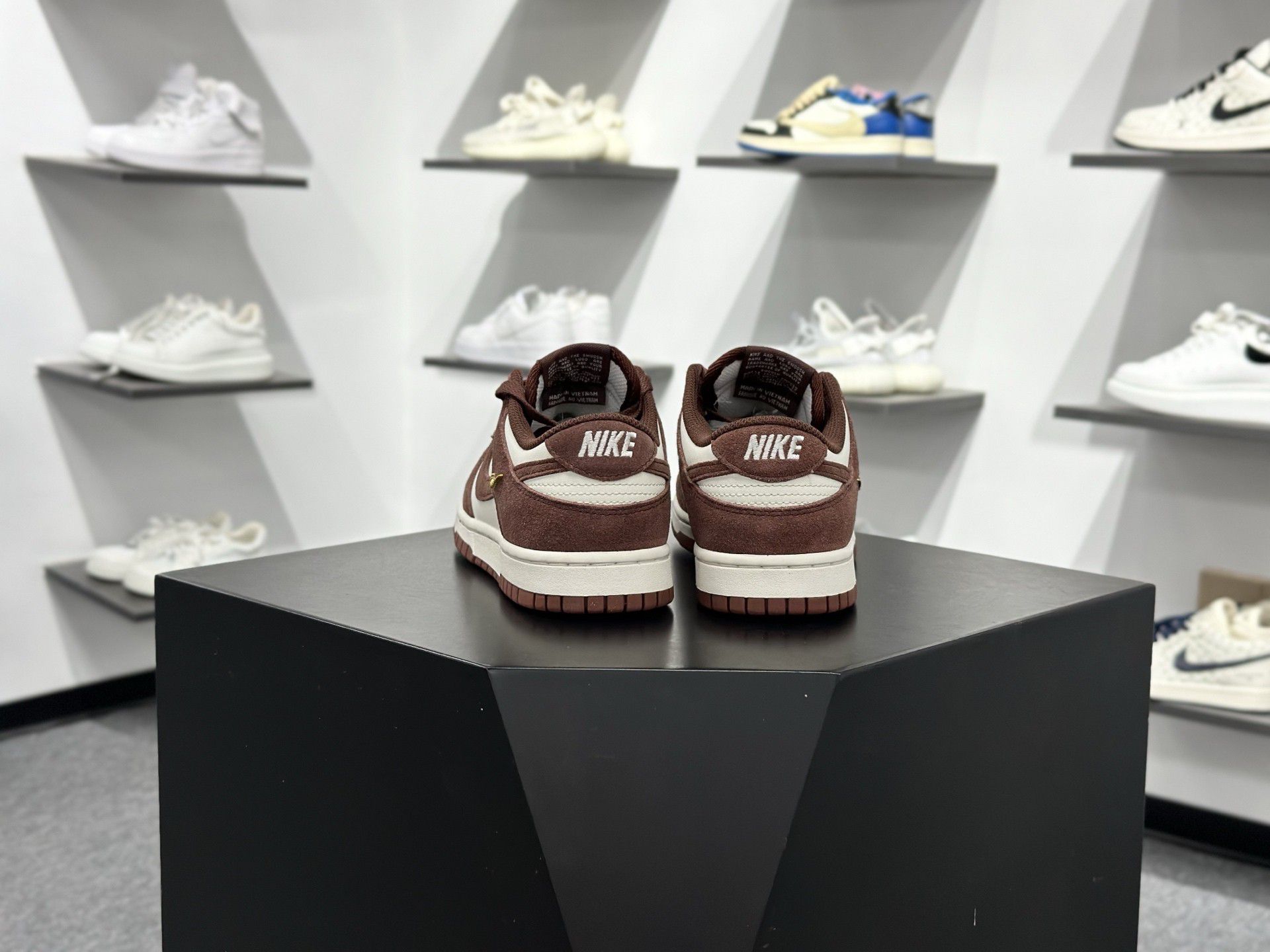✨在鞋墙前驻足的那一刻,就被这双棕白配色的Nike Dunk Low轻轻撞了下心~ 黑色展示台像一块丝绒幕布,把鞋身的麂皮质感衬得格外温柔。阳光斜斜掠过鞋侧的Swoosh,棕调像焦糖融化在奶油里,低饱和的配色反而让细节更耐看。转头发现背景层架藏着彩蛋:藏蓝鞋面跳着冰裂纹、纯白款鞋舌藏着夜光暗标…原来每双鞋都在用颜色讲自己的故事。 这种陈列太懂鞋迷了!不用挤在货架前翻找,专业感从错落光影...
