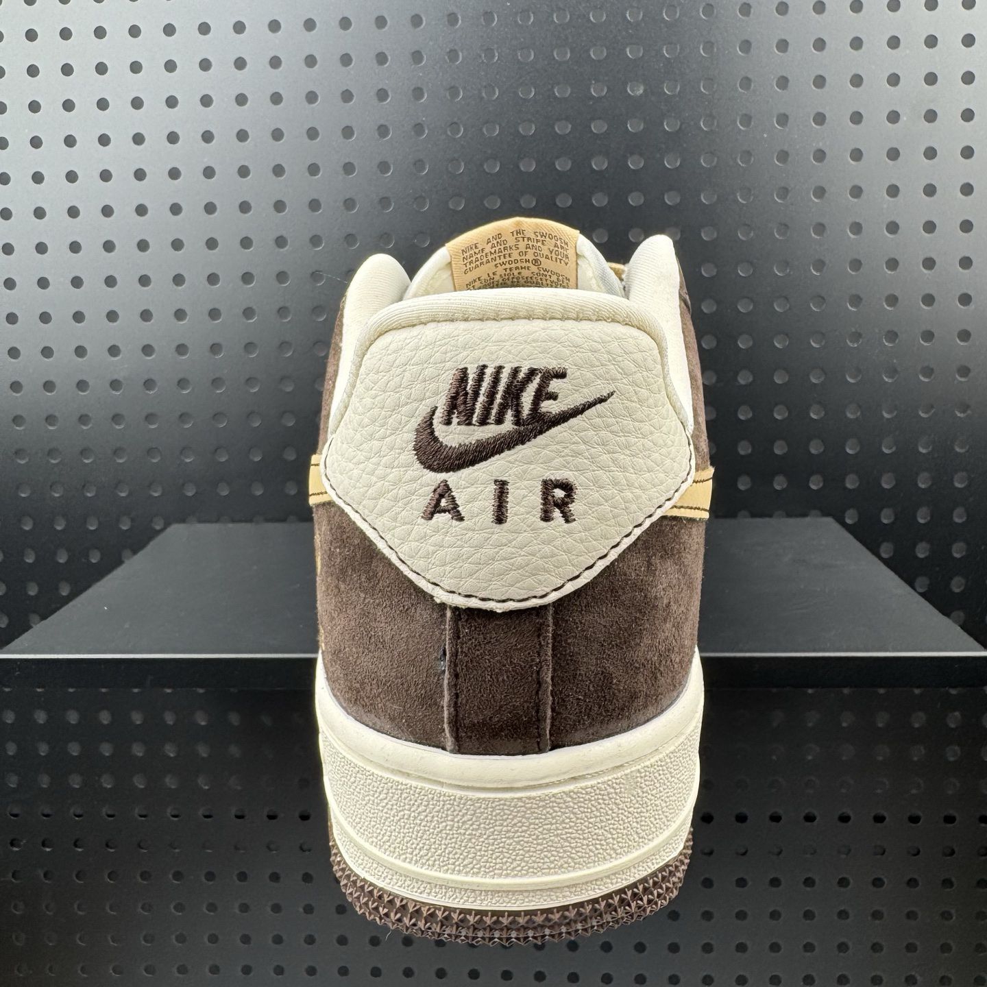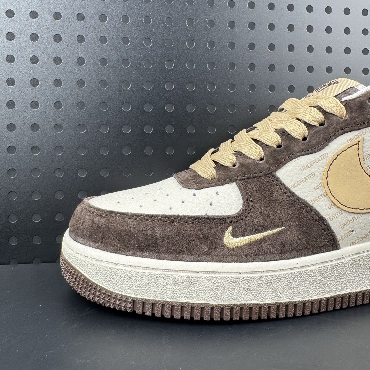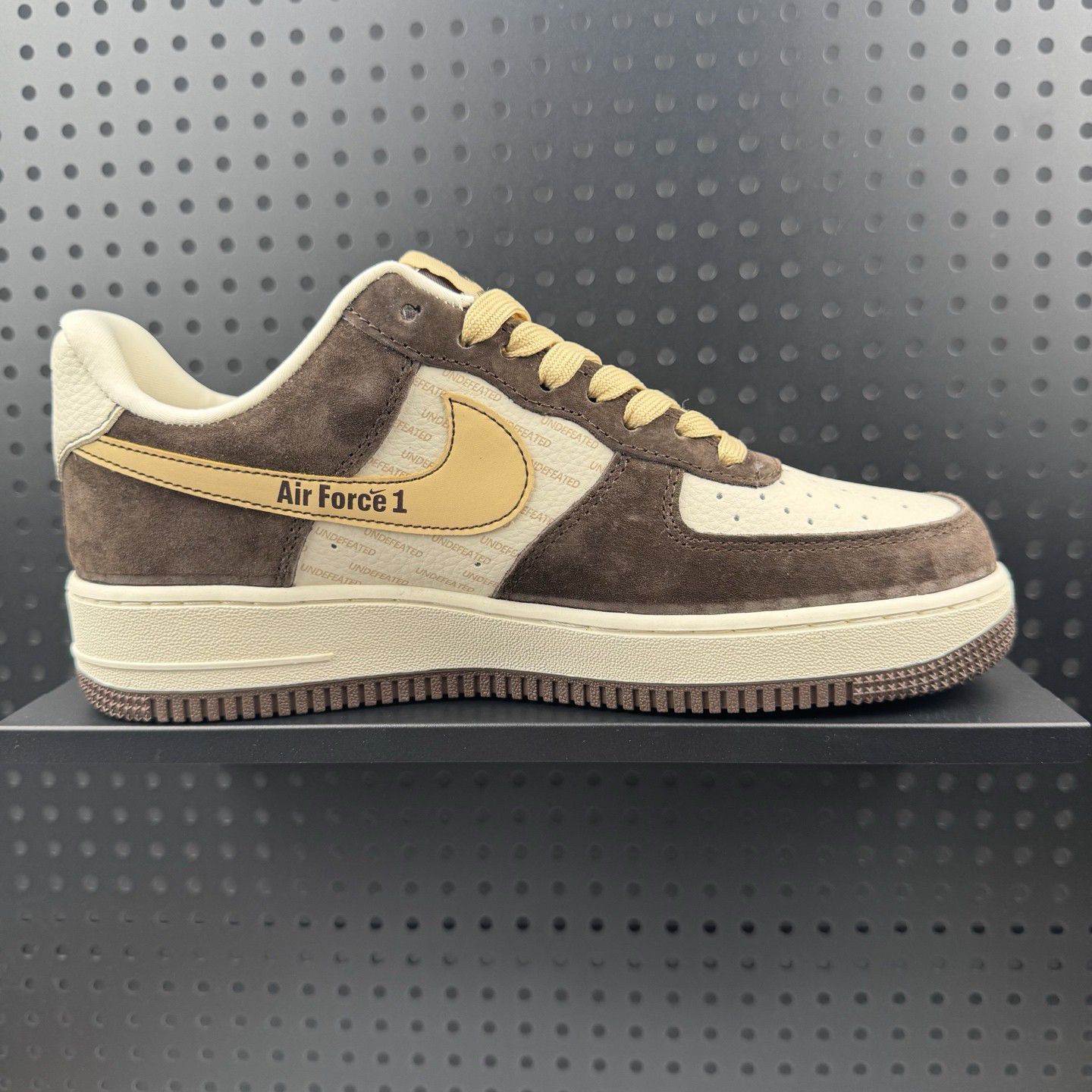 轻轻戳戳这双站在聚光灯下的宝藏!🖤✨ Nike Air Force 1 × Undefeated 联名款像一块被阳光吻过的焦糖蛋糕——棕调鞋面温柔包裹脚踝,米白缝线勾勒出流畅轮廓,金色Swoosh和侧边闪电标在暗处悄悄发光,仿佛在说:“嘿,懂鞋的酷小孩看过来!” 黑色展示台像宇宙黑洞般衬得鞋身愈发立体,那圈神秘的圆形孔洞背景板,更像是设计师特意留的呼吸窗,让每处做旧细节都活了起来。凑近看,麂...