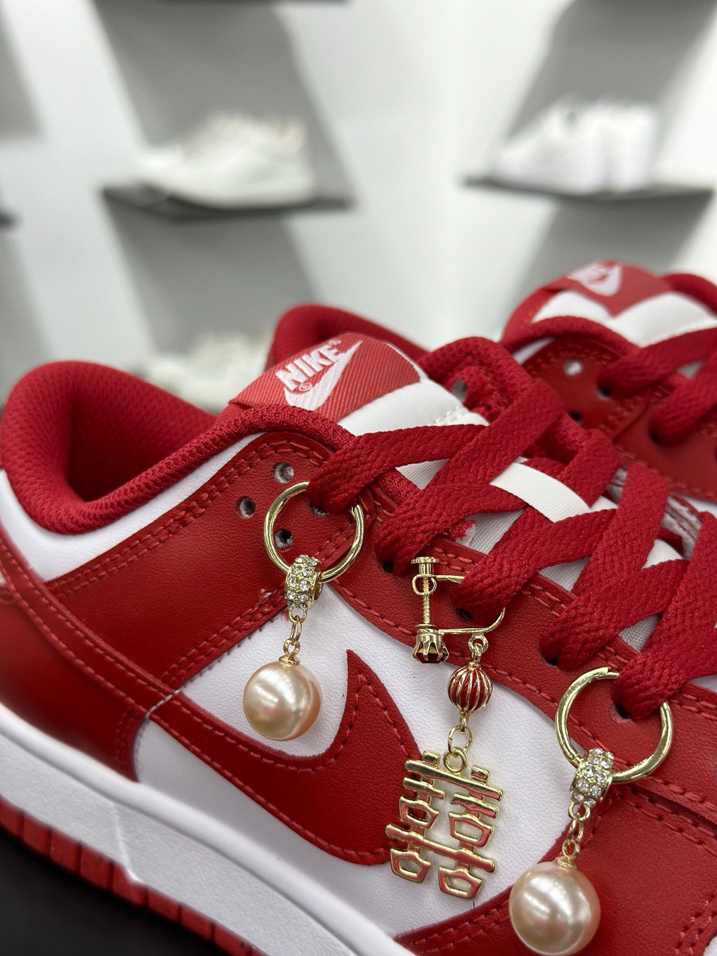 ✨这双红白Nike Dunk Low像一颗行走的草莓糖!放在哑光黑台上像艺术品,背景整墙运动鞋陈列瞬间拉满专业感——原来买鞋也能像逛美术馆一样治愈~ 白墙几何线条框住鞋架上的彩虹战队,每双鞋都在发光却丝毫不抢主角风头。红白Dunk的漆皮红像落日熔金,鞋侧Swoosh白得发亮,搭配复古做旧中底,踩在脚上是行走的90年代复古胶片滤镜! 悄悄说背景鞋架藏着彩蛋:荧光绿跑鞋、斑马纹板鞋...像...