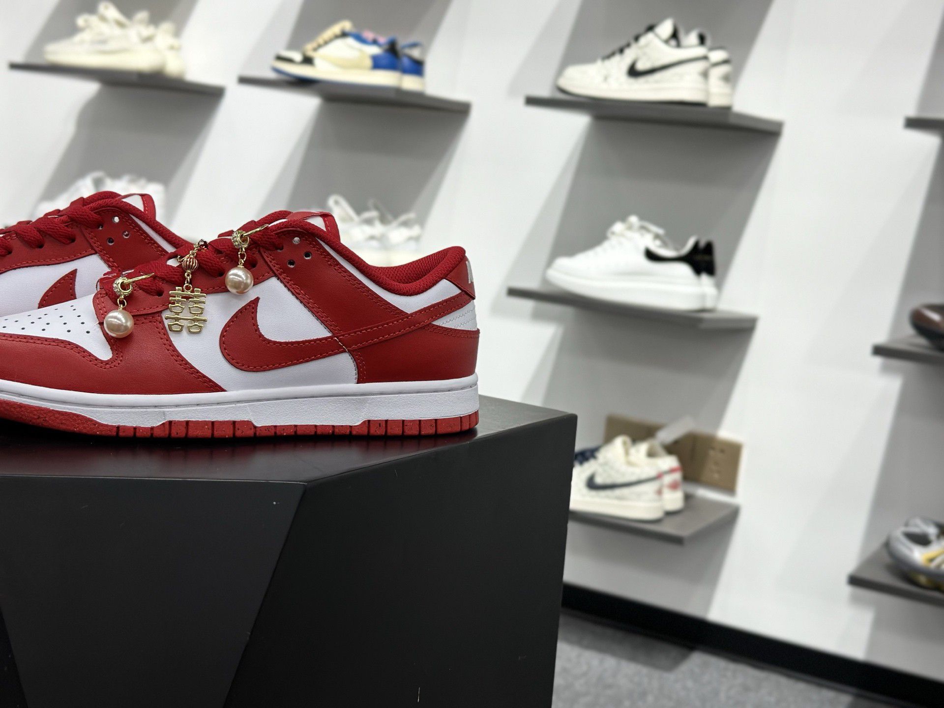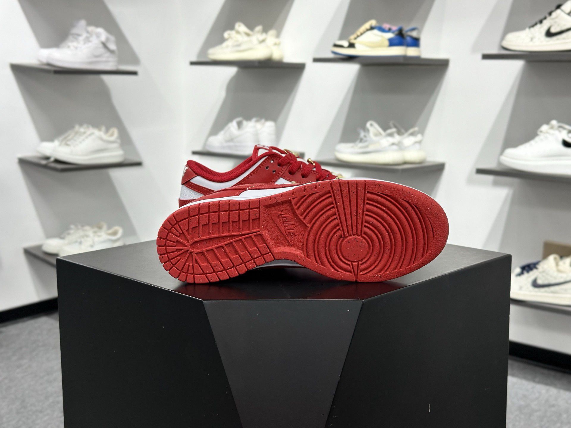 【 ✨这双红白Nike Dunk Low像一颗行走的草莓糖!放在哑光黑台上像艺术品,背景整墙运动鞋】,由用户 大宝哥时尚 分享,来自湖北。这是一篇来自识货社区的真实用户分享笔记。