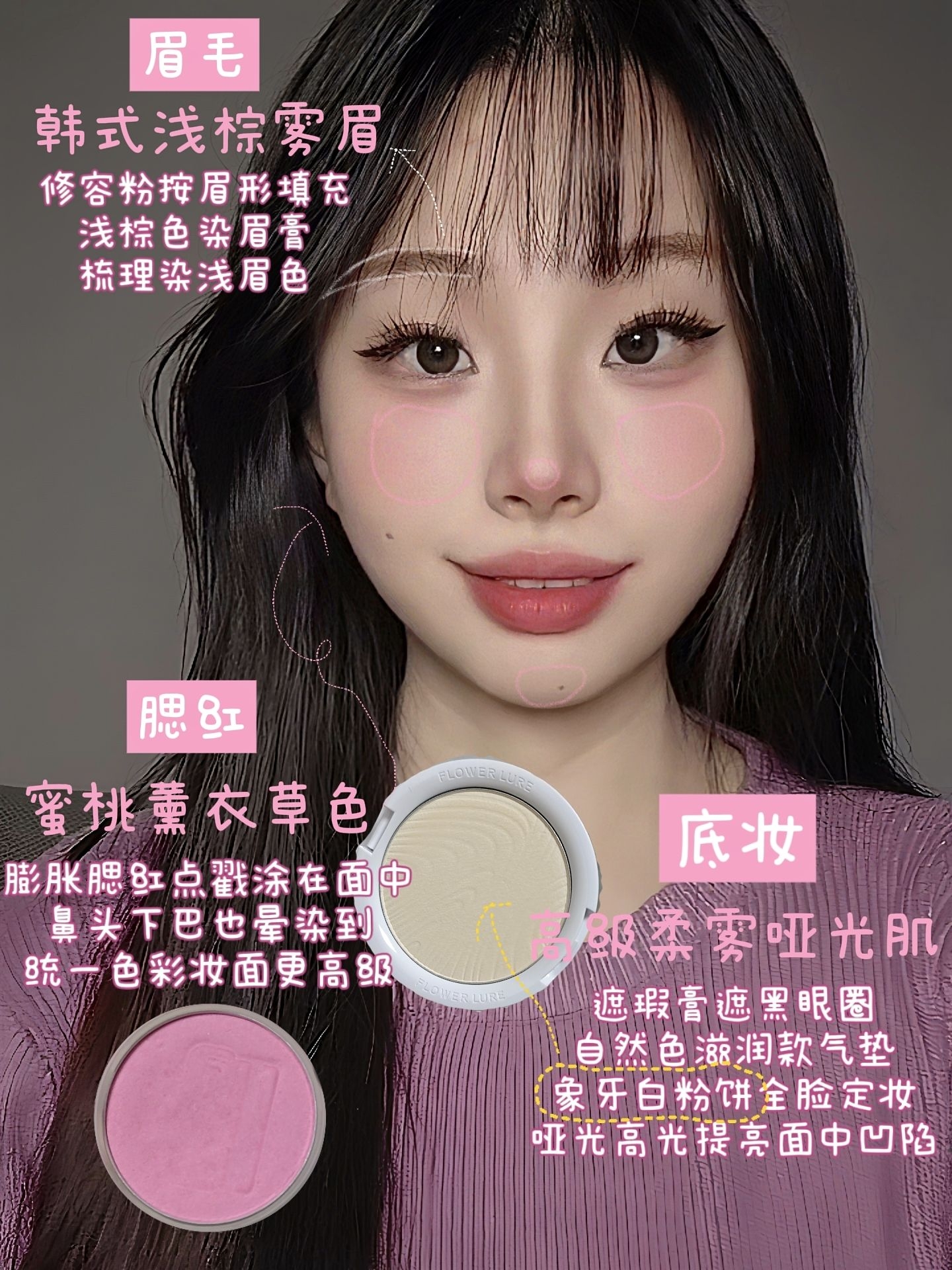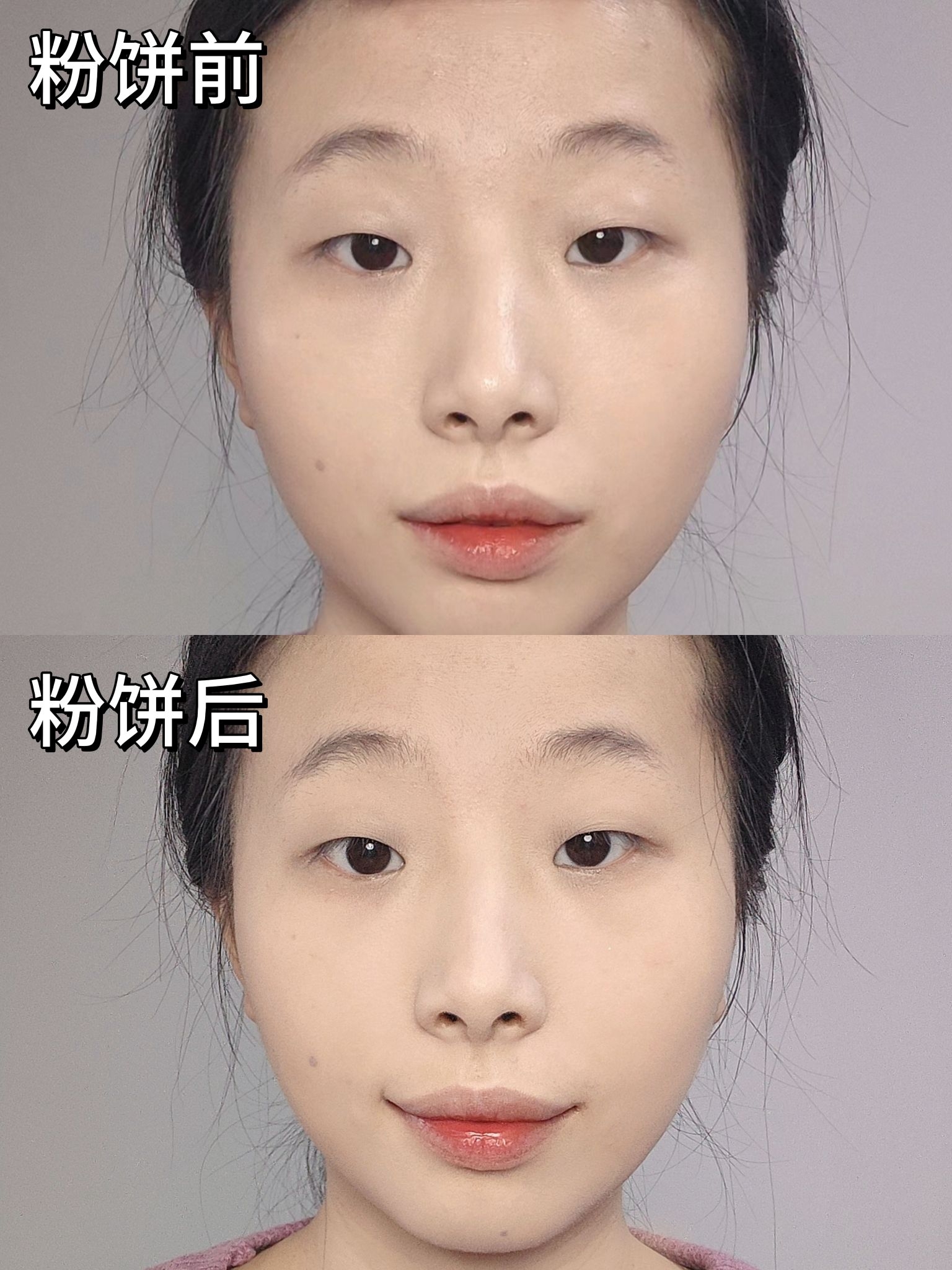 这期是韩系蜜桃嫩妹妆很详细的妆容图文分析 底妆是用的清透滋润气垫叠加花间颂柔雾粉饼 粉饼用的是象牙白色号 会让原本底妆颜色再白一点点 刚开始使用是有点惊喜的 因为它和别的粉饼相比下挺平价的 没想到粉质是细腻的 几乎没什么粉感 拍后是高级柔雾妆效 图六是左右脸对比(一边只涂气垫 另一边有压粉饼) 奶油肌🆚柔雾肌 图七是全脸使用粉饼的前后对比 除此之外妆容还蛮重要的是蜜桃粉腮红 打在了面中~鼻头~...