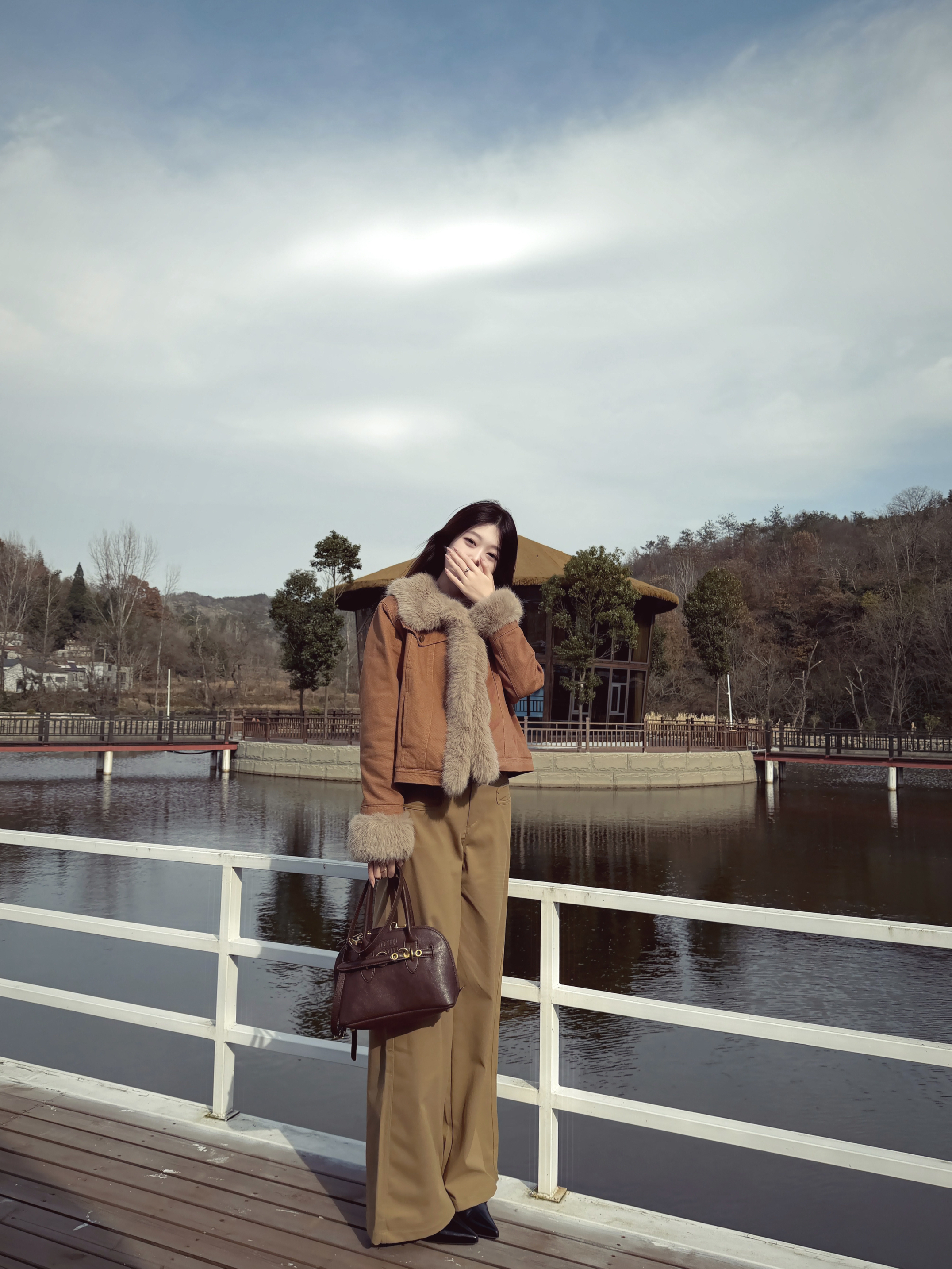 冬日的氛围感果然还是要靠棕调~ 焦糖色毛领外套软乎乎的 搭配卡其阔腿裤+黑色高跟鞋 垂坠感真的绝了 显高又显瘦 搭配 MIU MIU 棕色贝壳包 湖心观赏台随手拍都很出片 这种慵懒又精致的感觉谁懂啊!