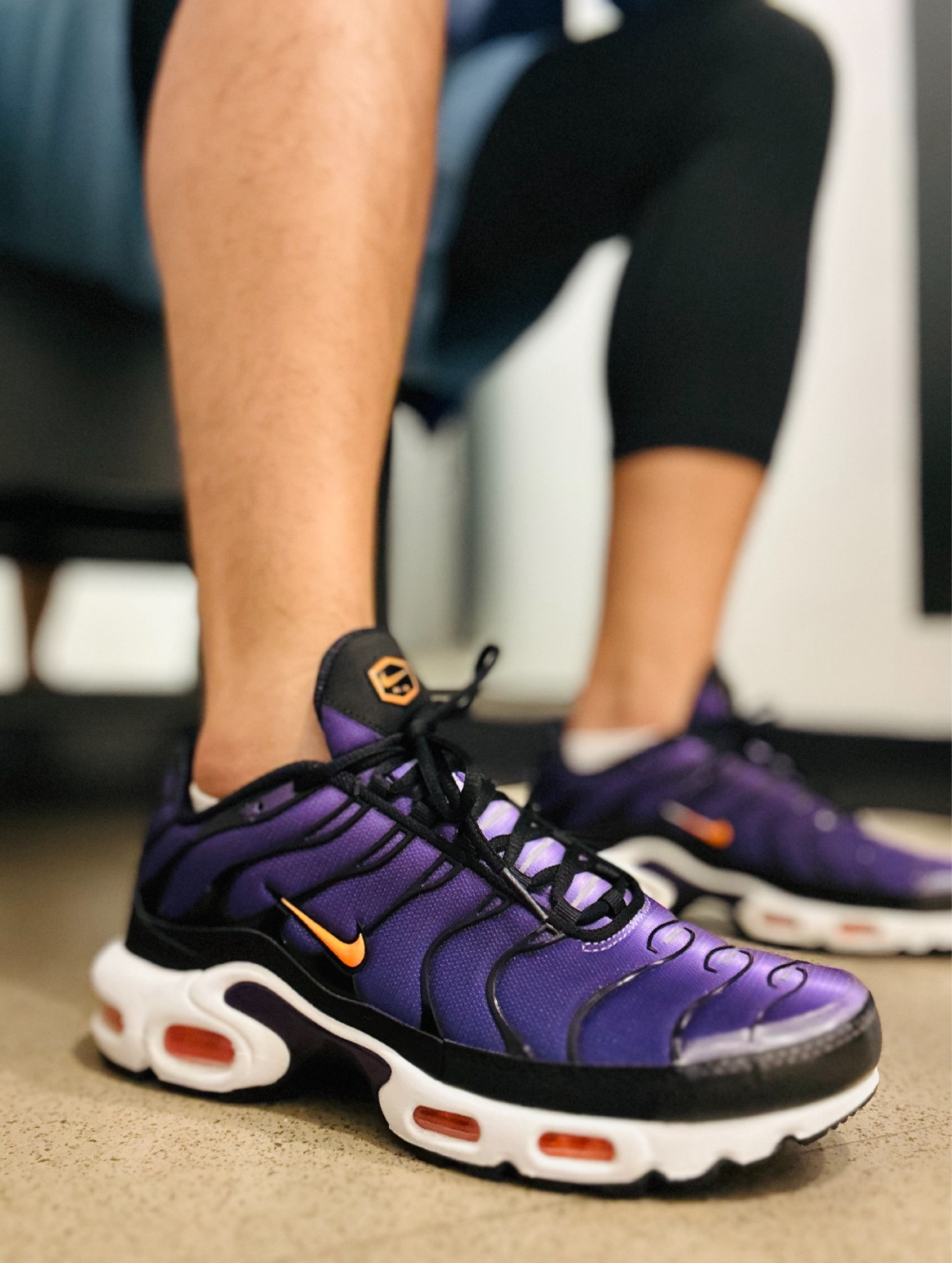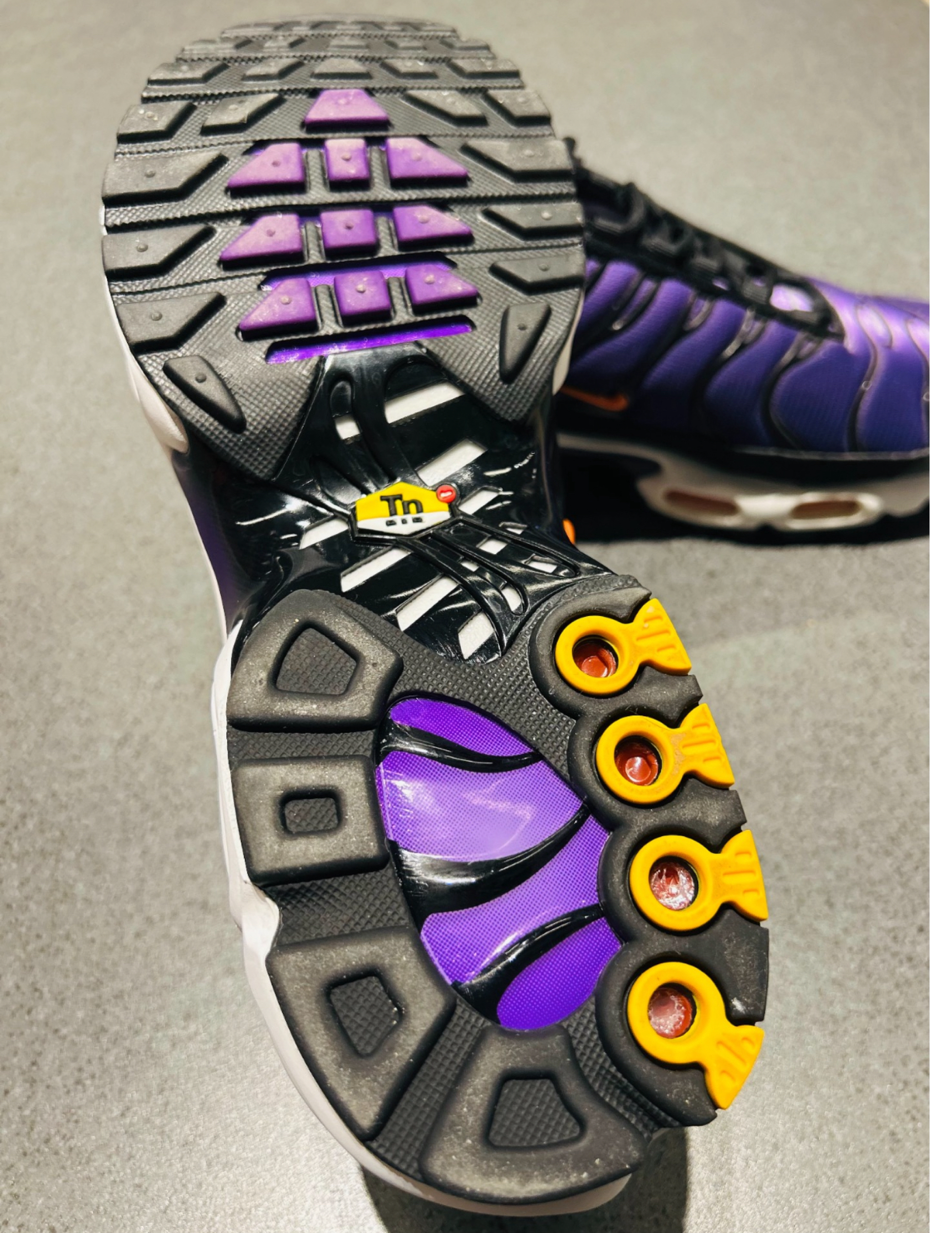 今天与大家分享上脚的鞋款是Nike Air Max Plus紫黑色,最初了解到这款鞋是由于当年阿里纳斯在NBA球场上穿着这款跑鞋打球,这在那个注重保护性的年代简直是不可想象的,说回这款从外观方面就可以看出这双最初也是以跑鞋上市,在复古风回潮得如今已休闲鞋回归也是大势所趋,采用分离式前后章可见式气垫,外观设计仍然惊艳尺码方面有点偏小建议买大。