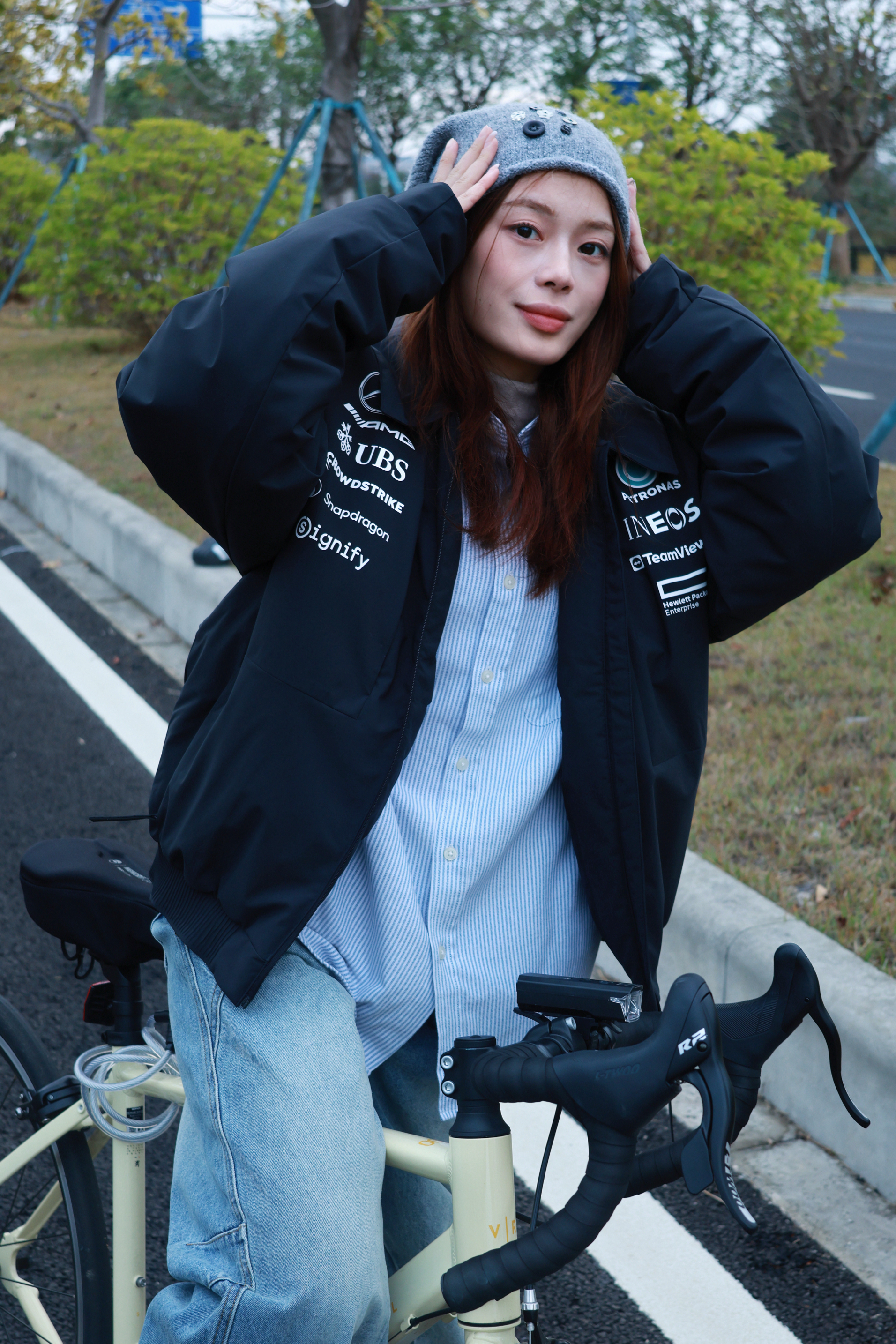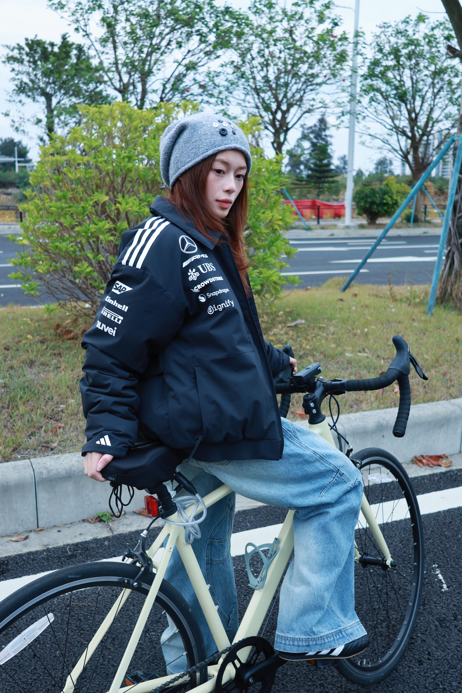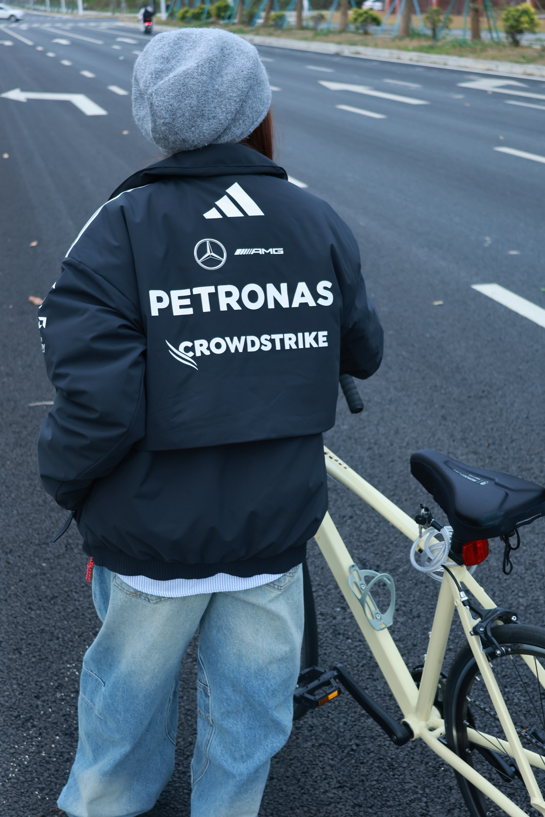 穿好看的衣服就是我每天出门骑行的动力! 冬天的温度骑行真的好需要勇气 极度需要一套时髦又保暖还方便骑行装备 我选择这套作为我的骑行解药✨ 黑色联名夹克➕格纹衬衫➕拖地裤 🧥:阿迪联名奔驰的这款纯黑夹克🌪️ 真的帅到我心砍啦 背后的涂鸦我巨喜欢 骑行时我就是最靓的那个仔 💥 特别轻薄但是很锁温 南方冬天穿完全OK💯 👔🧢:选择一件日常百搭的条纹款 我喜欢把衬衫做内搭 🪺同时戴一顶冷帽 软软塔塔...