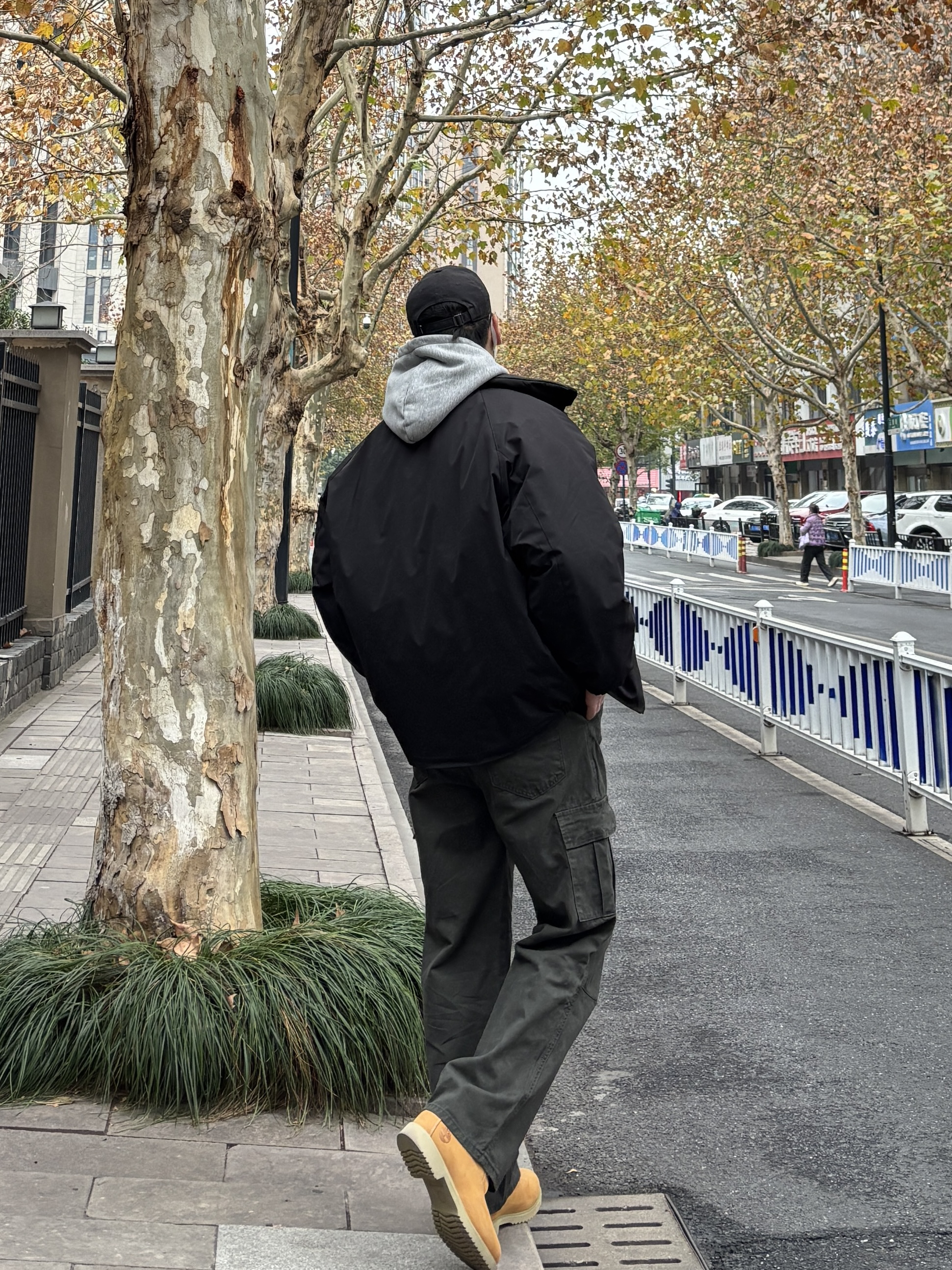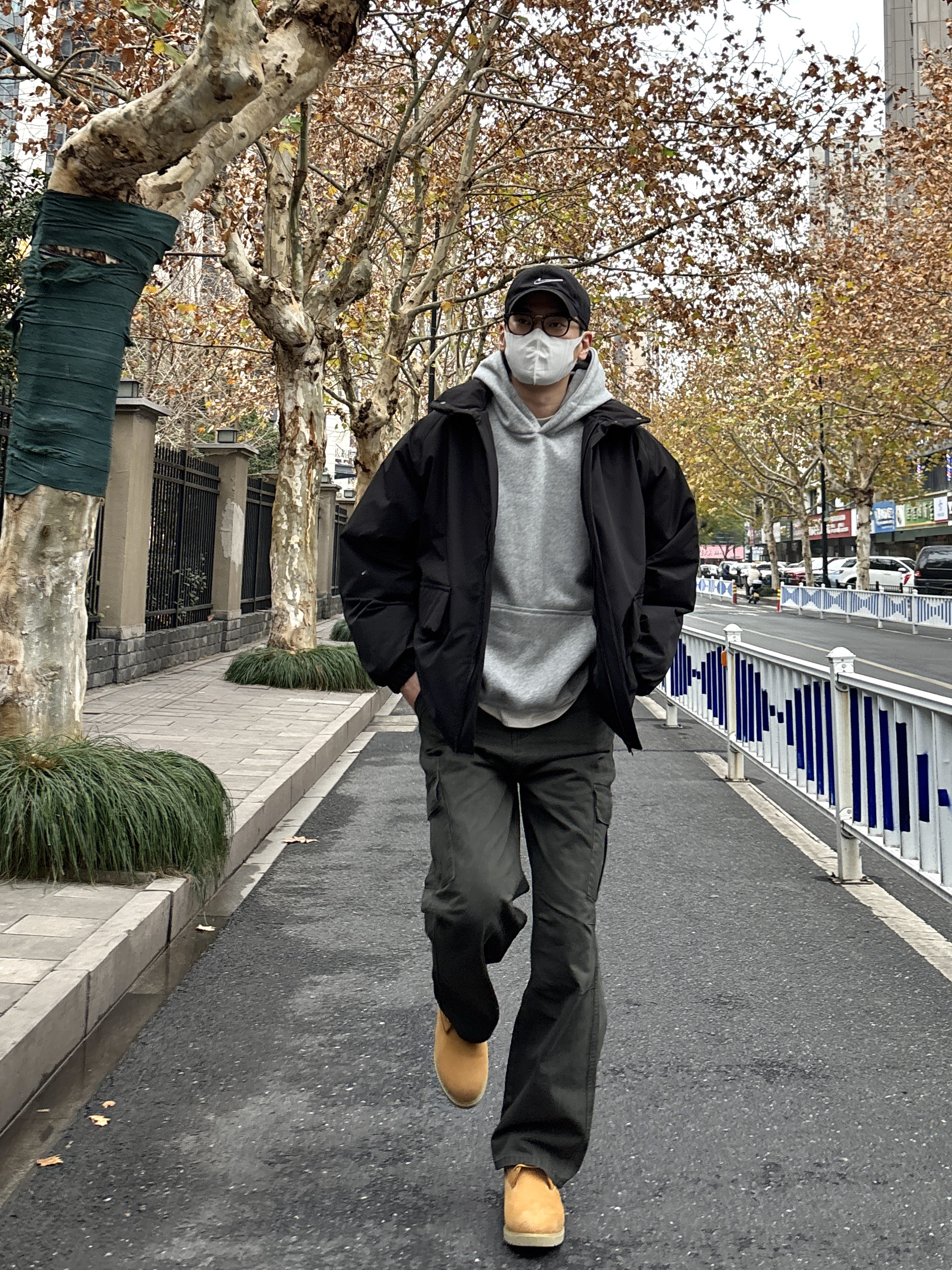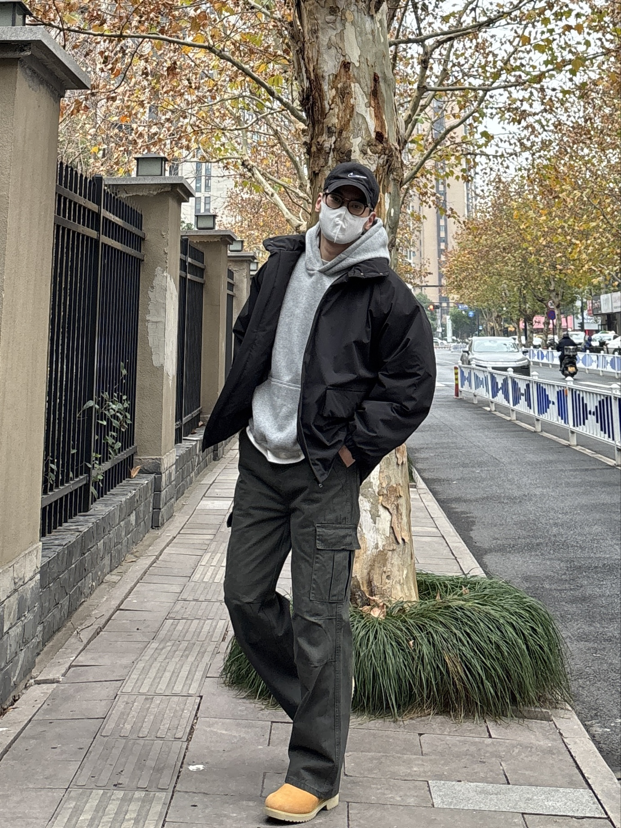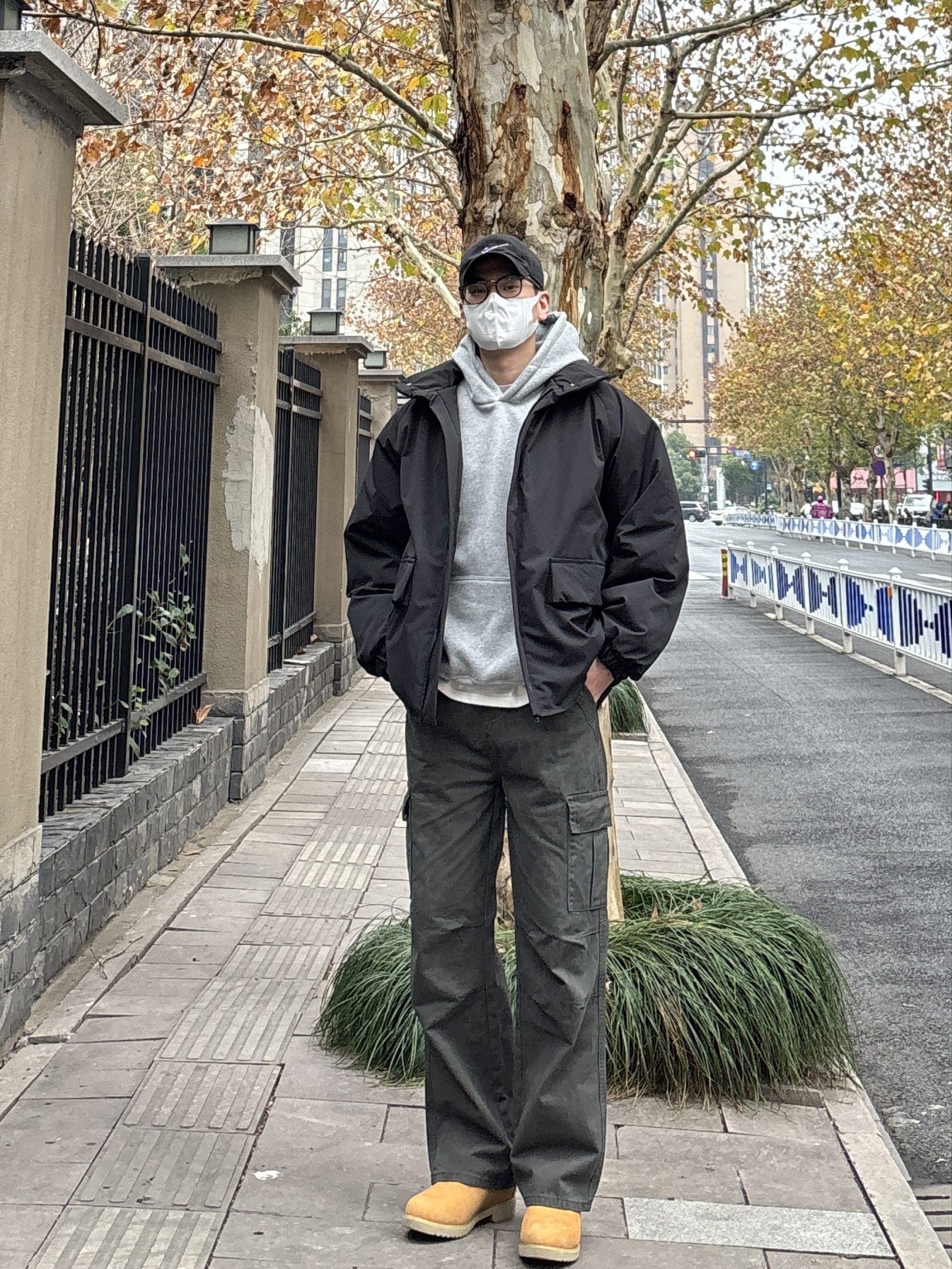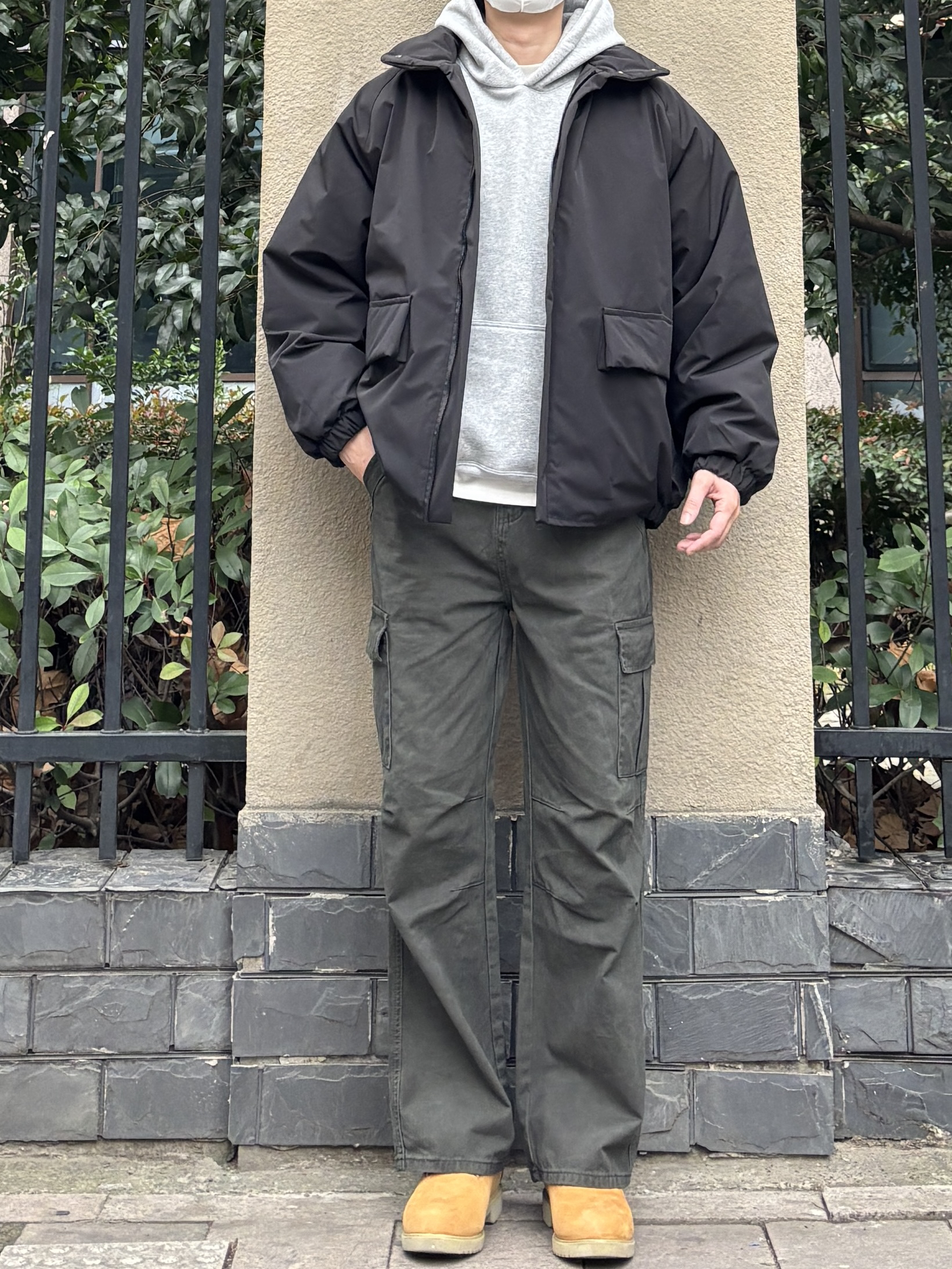 今日份look先用万能内搭base浅灰色连帽卫衣叠穿黑色宽松立领大口袋棉服,层次感和保暖度都在线。下身搭配绿色直筒水洗工装裤,多口袋设计增加细节感,沙漠黄工装靴小面积亮色提亮整体,还能悄悄拉长比例✌️ 黑灰绿主色调干净利落,黄色鞋子点亮细节,不用力过猛也能穿出氛围感。 - 今日搭配 衣服裤子:NICE LILI 鞋子:timberland