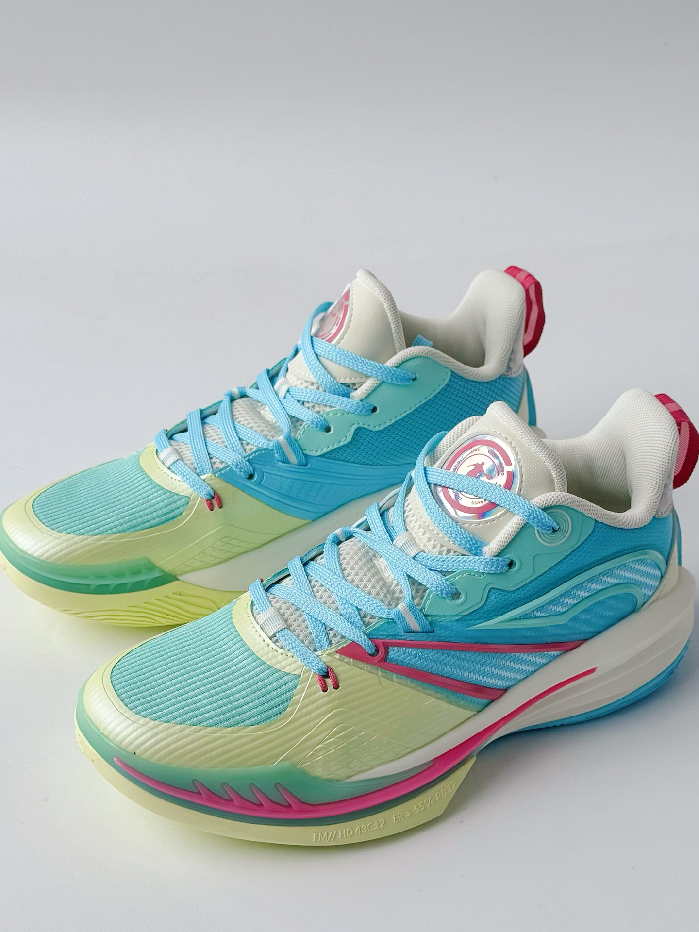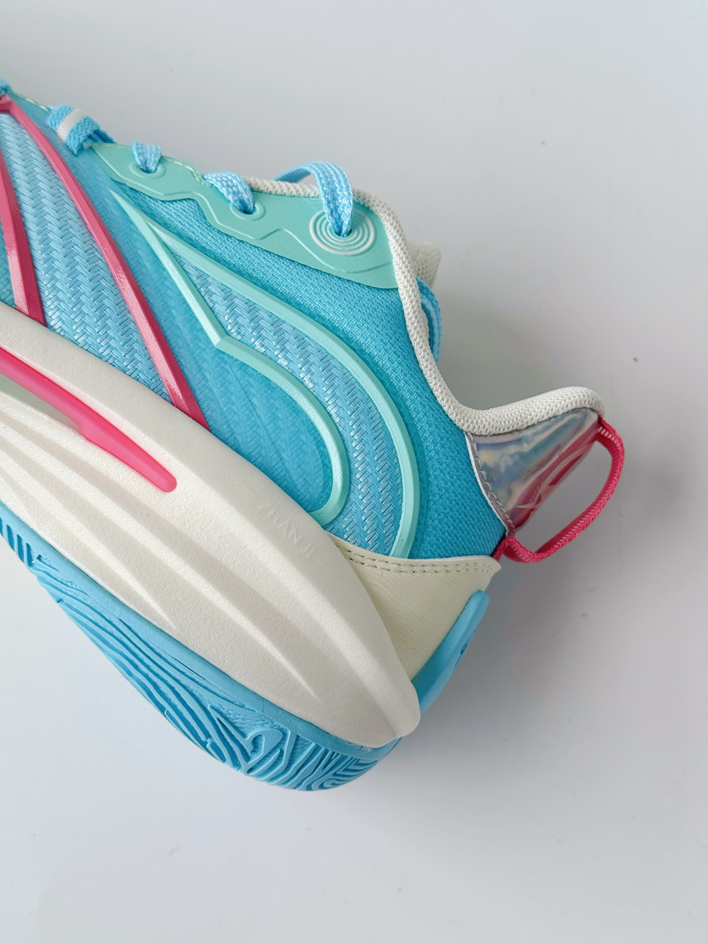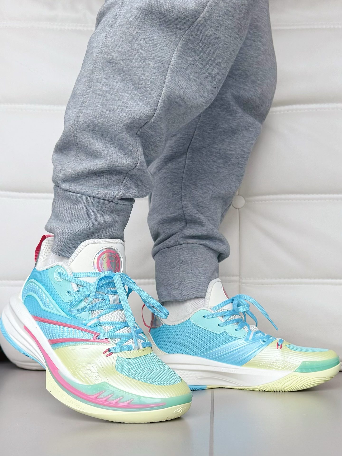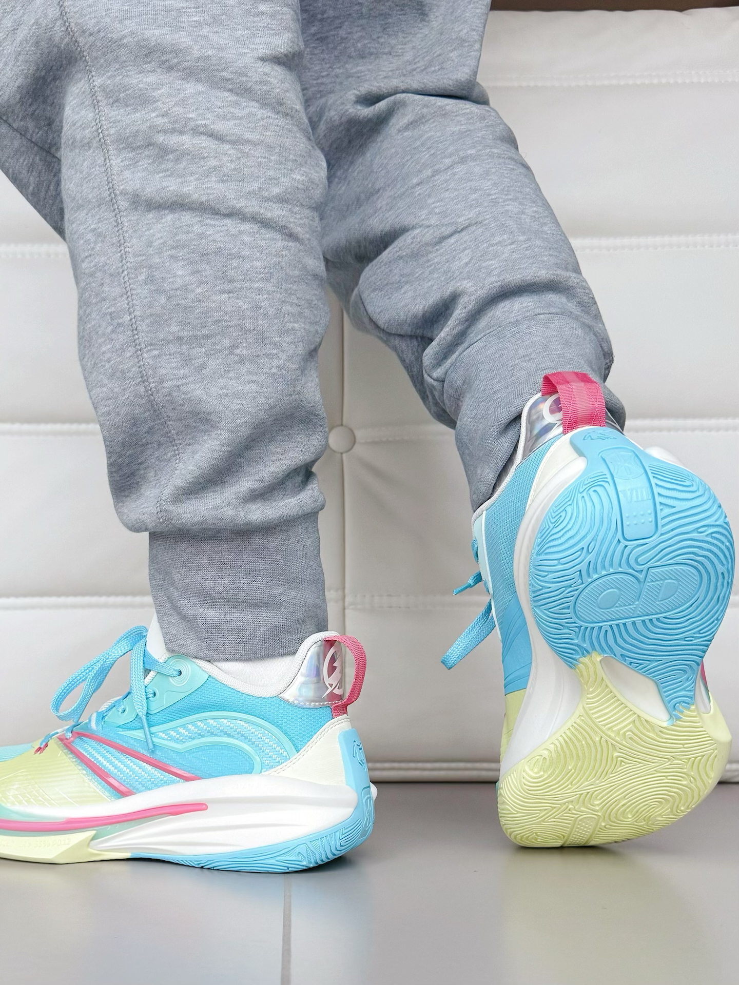 中乔破影 7这薄荷绿 + 淡粉的渐变,清爽得像夏天的冰饮,上脚连穿搭都变亮眼了。 鞋面是带细孔的网面,脚不容易闷汗,比我之前闷脚的训练鞋舒服太多。加上 “咻 - 轻速科技” 是真轻,跑跳的时候脚底下软软的,回弹也够劲儿,蹬地发力都不费劲。 后跟的 TPU 裹得特稳,做箭步蹲都没掉跟,全掌橡胶外底踩硬地也不滑,耐磨这块目测能扛一整年的训练。 关键这价格对学生党太友好了,透气轻弹还好看,训练通勤换着穿...