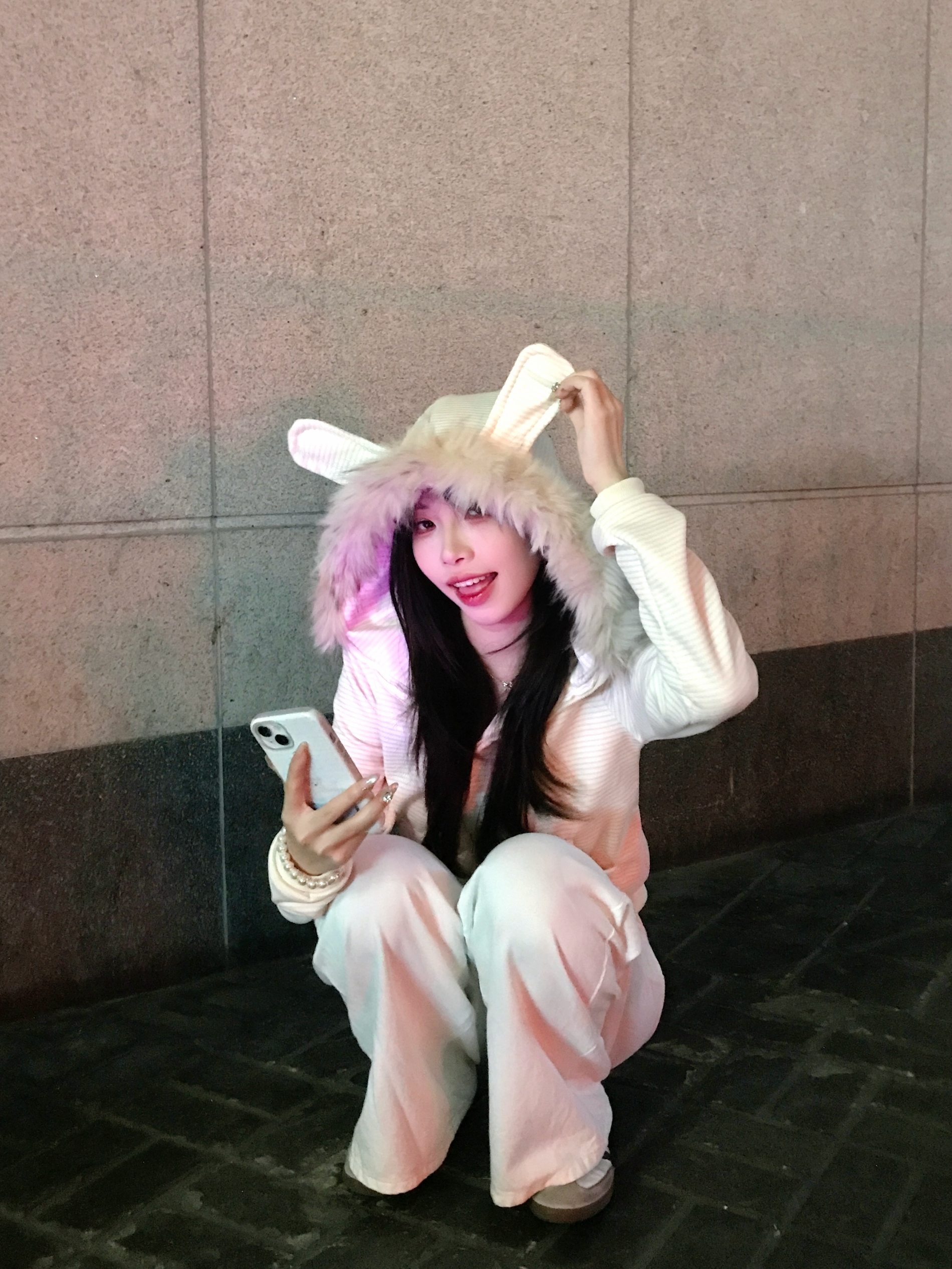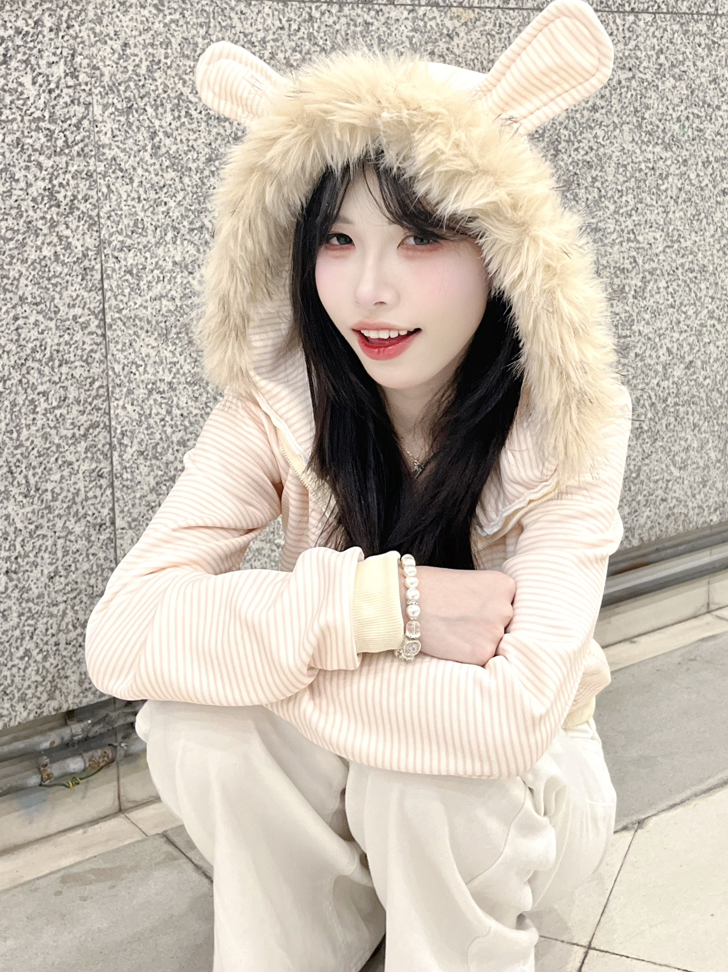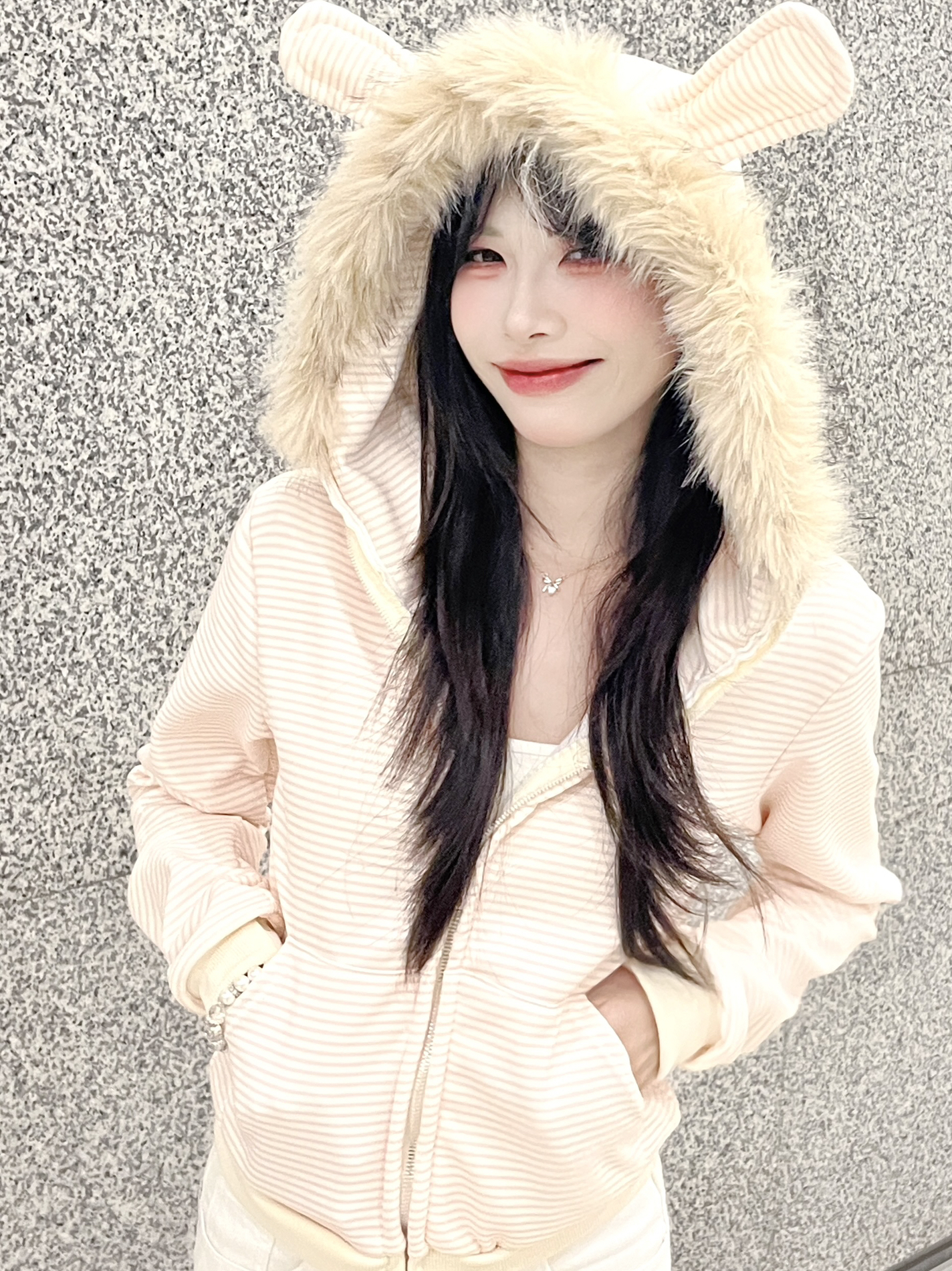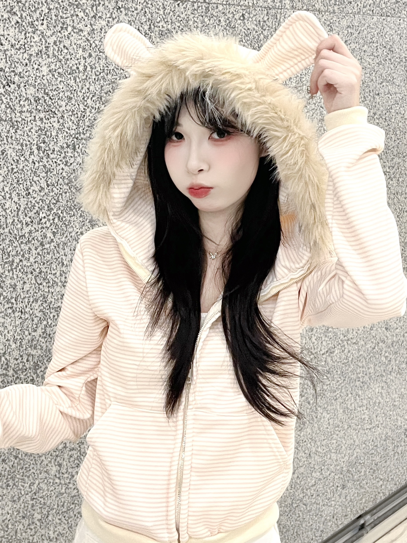 好乖好乖的外套 毛领材质挺舒服的 蓬松 软软的 衣服面料也很在线!!淡淡的粉色很好看哦 帽子上的兔子耳朵是点睛之笔! 太适合走韩系甜美风格的女孩子啦~