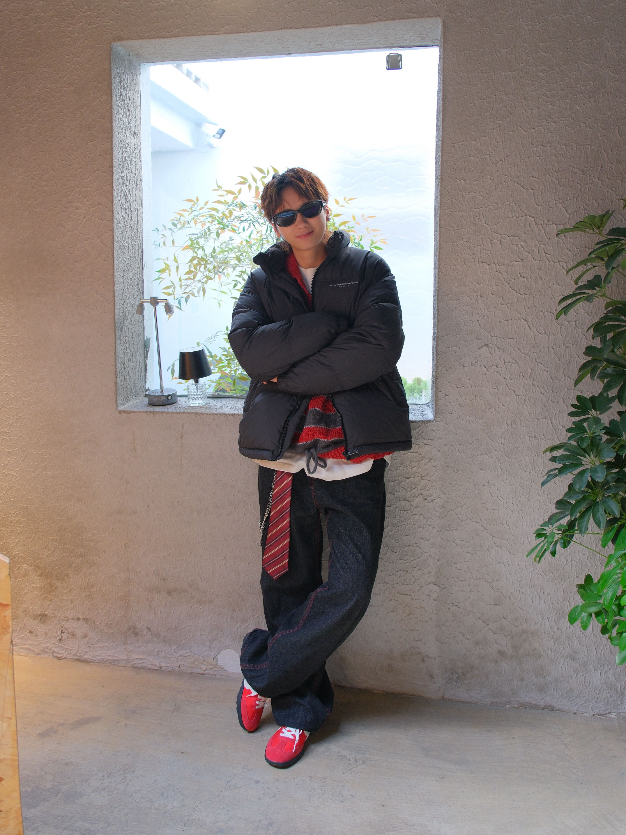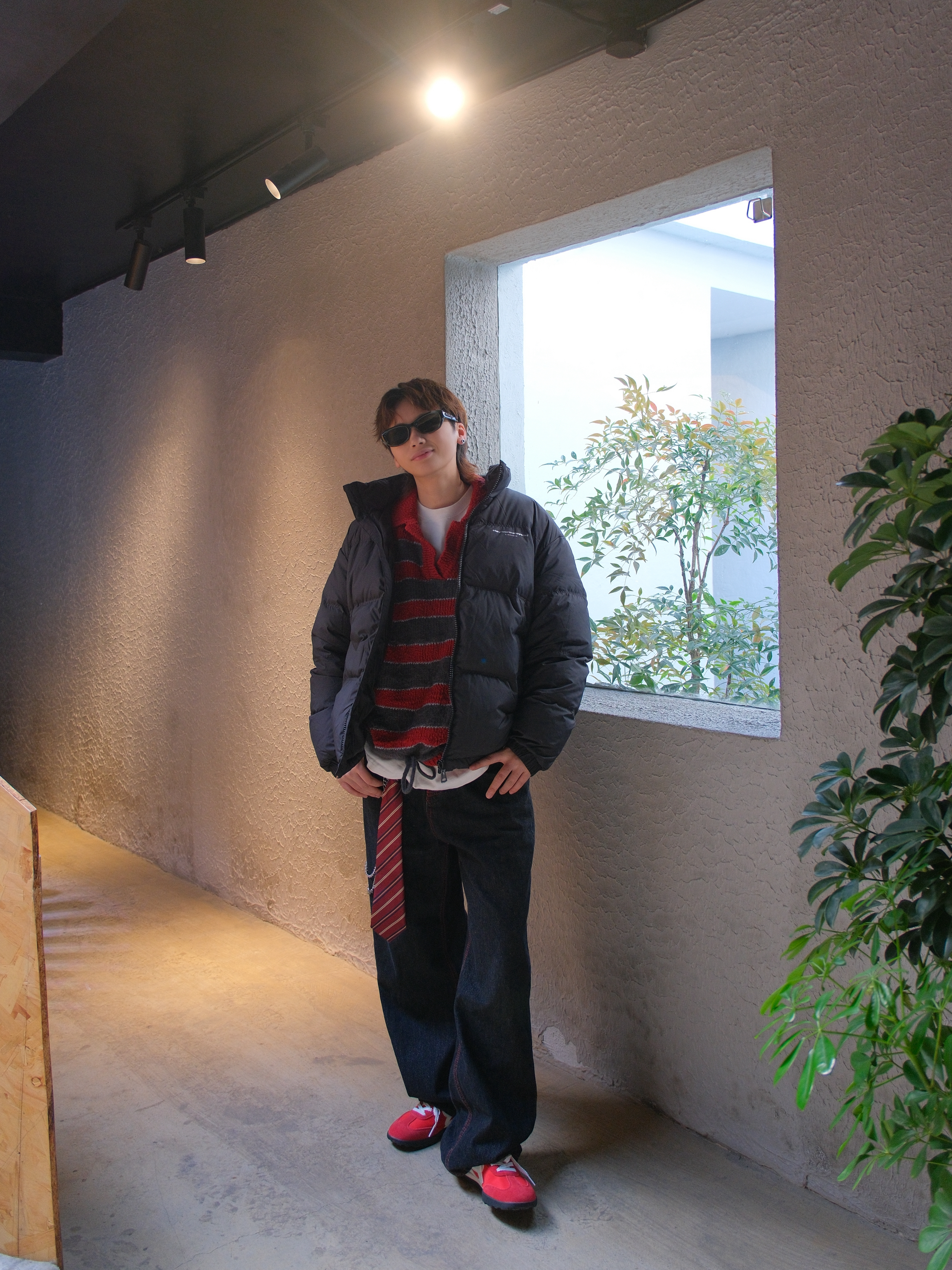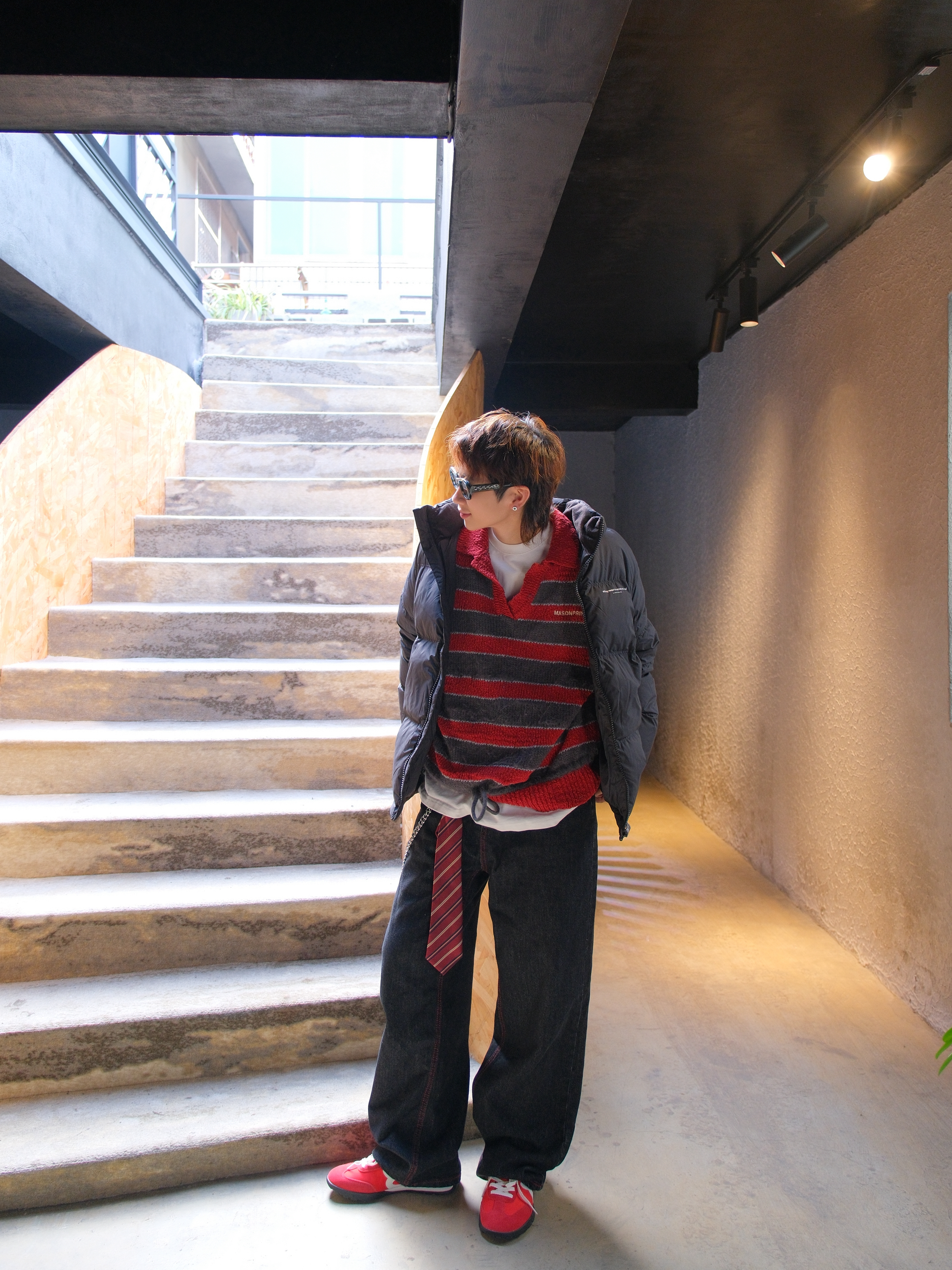羽绒服是对降温最起码的尊重 妈妈再也不用盯着我穿秋裤了 上身选件黑色羽绒服,经典不出错 短款的面包服版型也不会显得臃肿 内搭红色条纹毛衣 撞色看起来不会太闷 下装选黑色直筒牛仔裤 裤线的红色刚好和内搭呼应下 配上红色薄底鞋,简单利落 尺码参考:163cm/46kg 上身M码