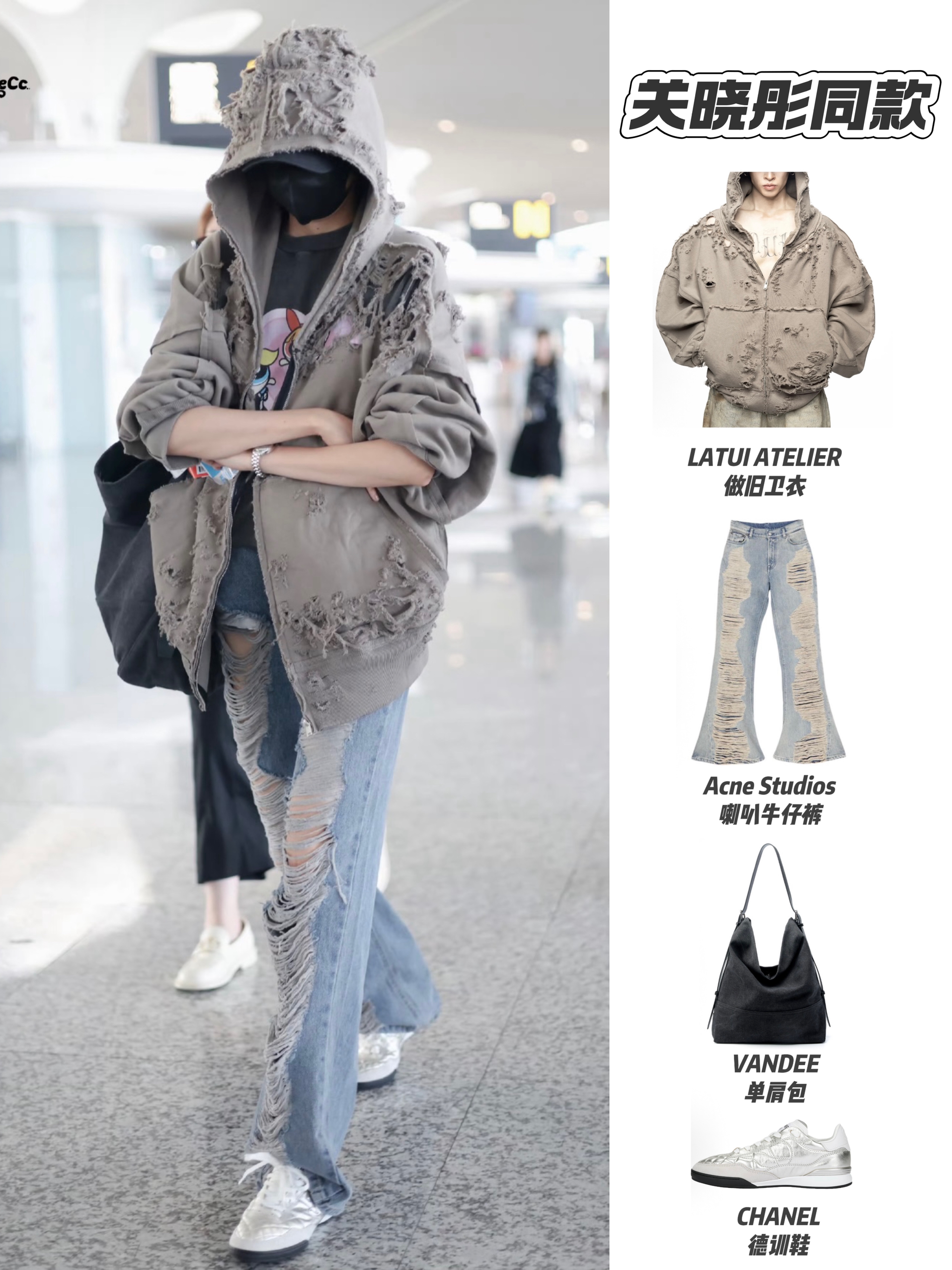 关晓彤这套穿搭把“做旧风”玩出了腔调!LATUI ATELIER做旧卫衣自带复古破碎感,搭配Acne Studios破洞喇叭裤,颓废又时髦;CHANEL德训鞋和VANDEE单肩包平衡了夸张感,整体将街头潮酷与复古做旧融合,随性中透着个性,很有辨识度~
