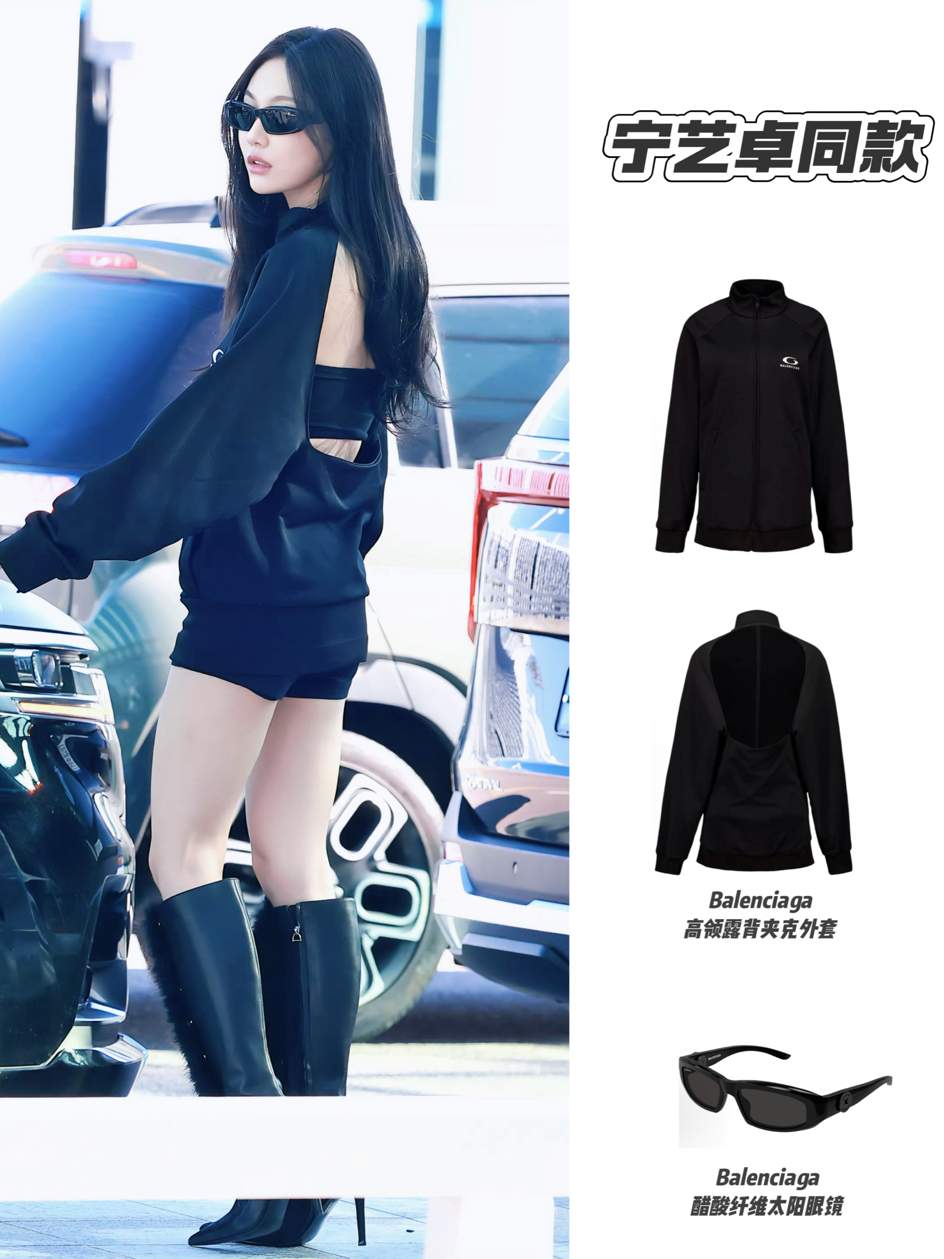 宁艺卓这套穿搭太敢穿了!Balenciaga高领露背夹克设计感拉满,正面简约利落,背面大胆露肤,瞬间打破沉闷;搭配短裤与高跟长靴,酷飒中透着小性感,再加上同品牌墨镜点缀,整体又美又辣,把“露背”的小心机玩出了高级感~