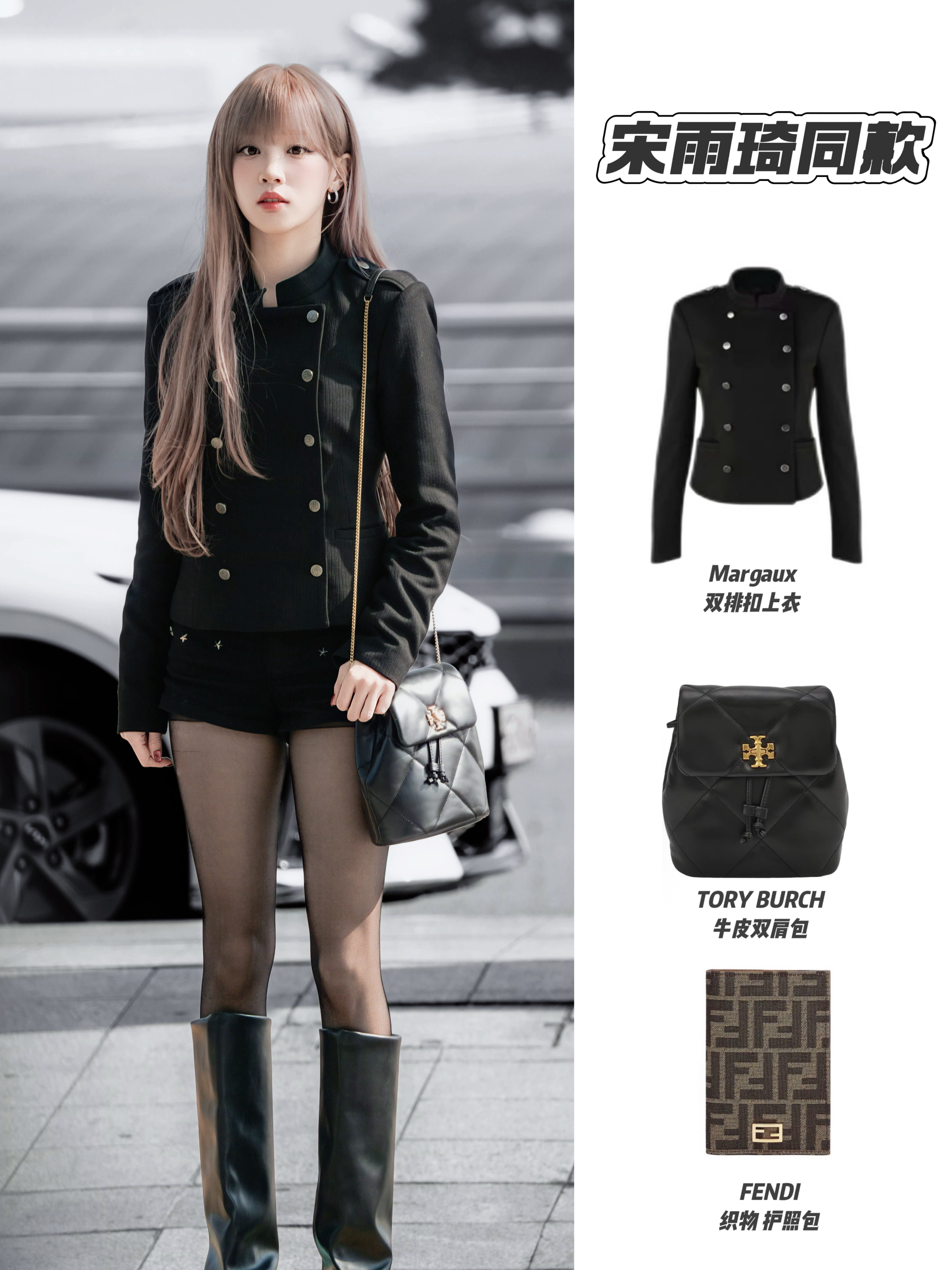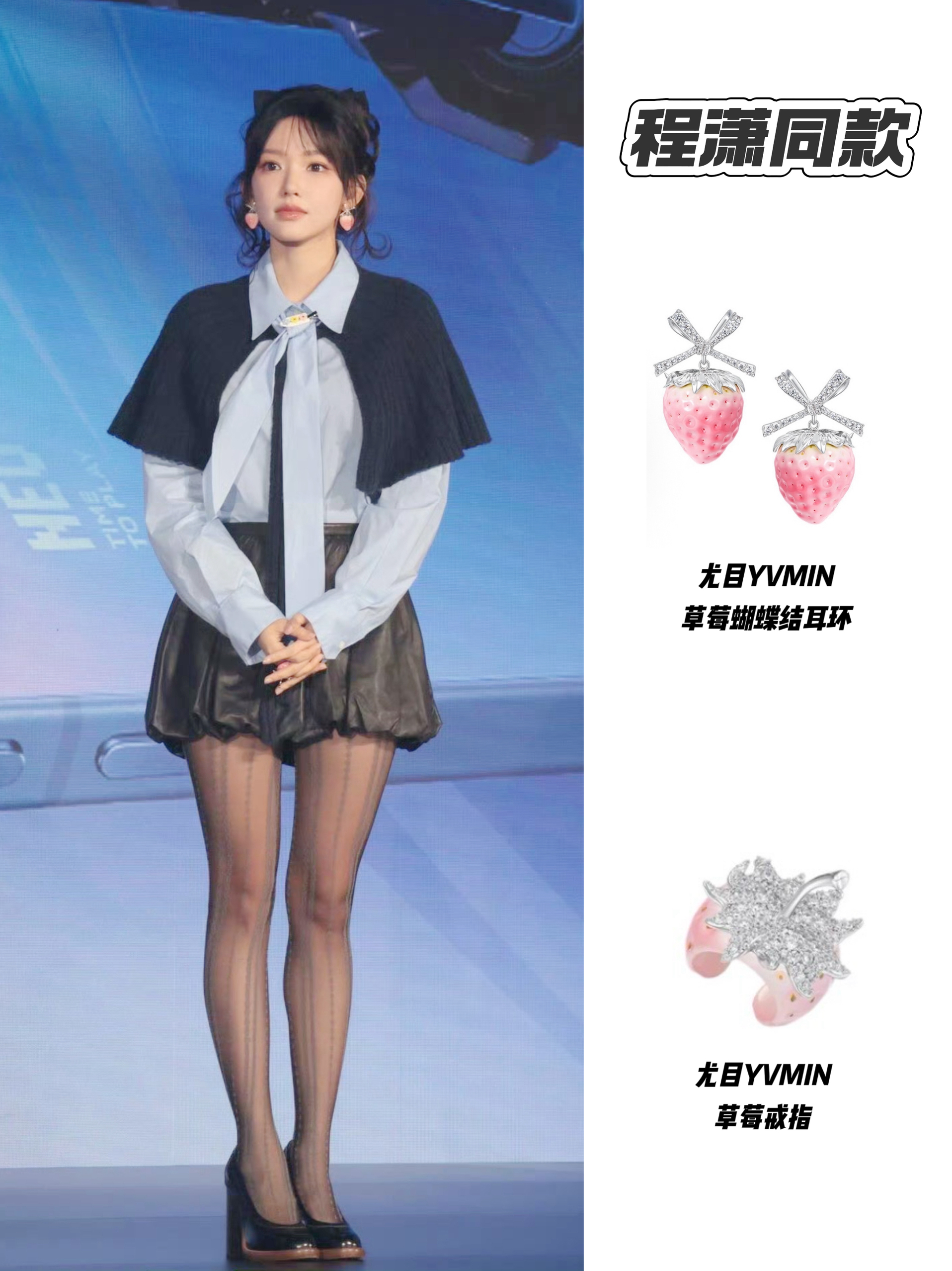 程潇这套穿搭甜酷感平衡得很好,配饰更是直戳少女心💗浅蓝衬衫配黑色小斗篷,学院风里掺了精致;皮短裤与黑丝、粗跟鞋增添飒气,又通过尤目草莓耳环、戒指这类甜美元素中和,整体保留少女的娇俏,细节处满是巧思~