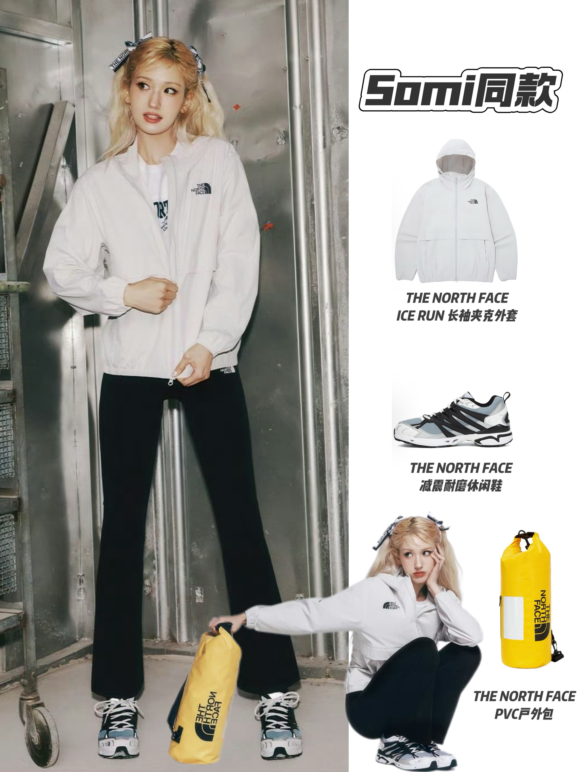 Somi这套北面同款穿搭太有活力了!🏃♀️白色夹克简约清爽,内搭露腰上衣秀出好身材;黑色长裤利落显瘦,搭配减震休闲鞋,运动感拉满。黄色PVC户外包更是点睛之笔,为整体注入明亮活力,轻松打造出率性又时髦的运动风造型~