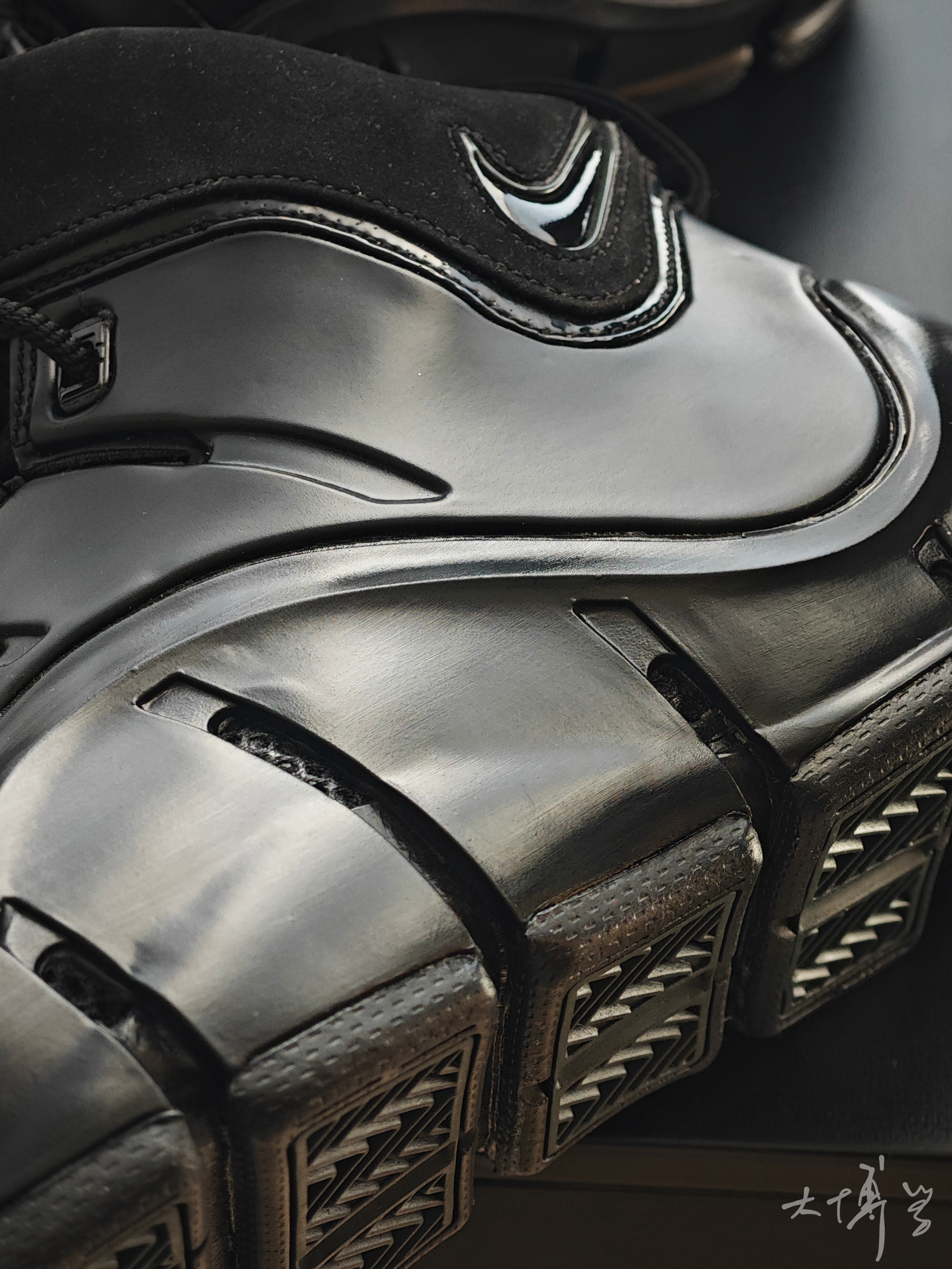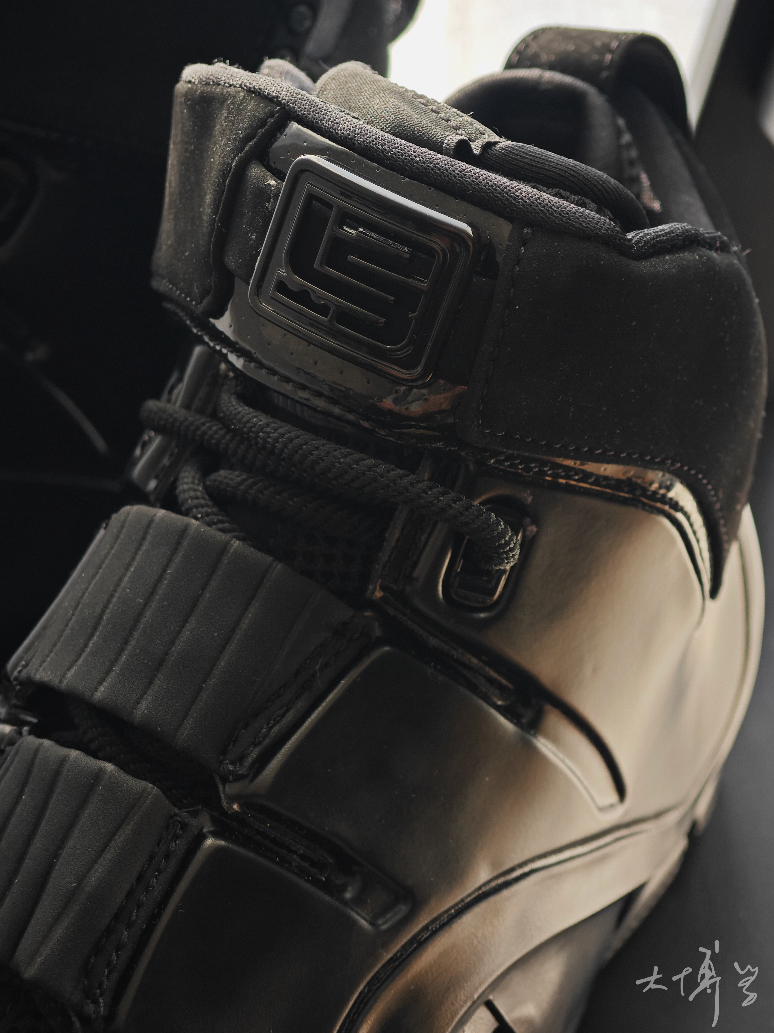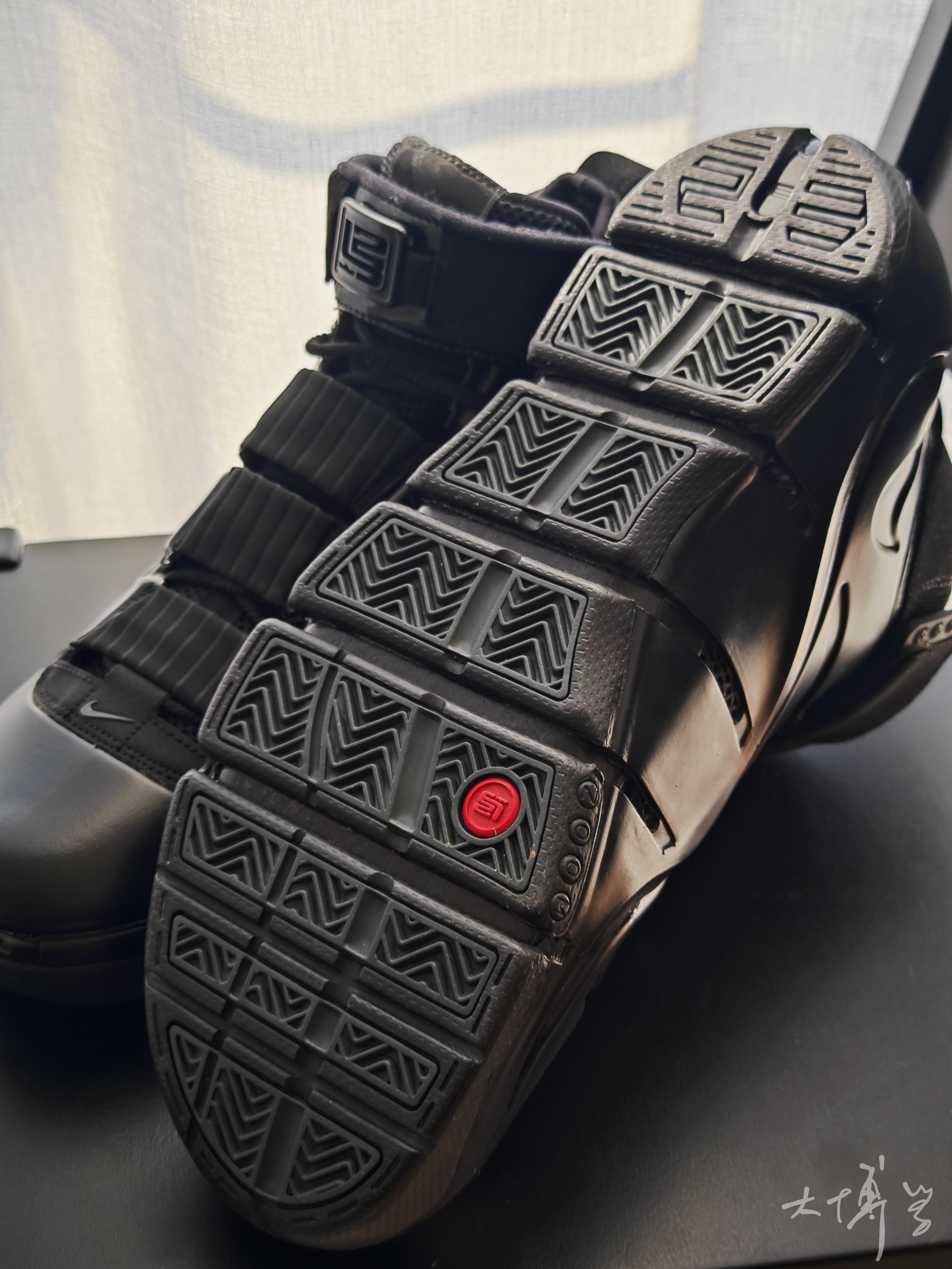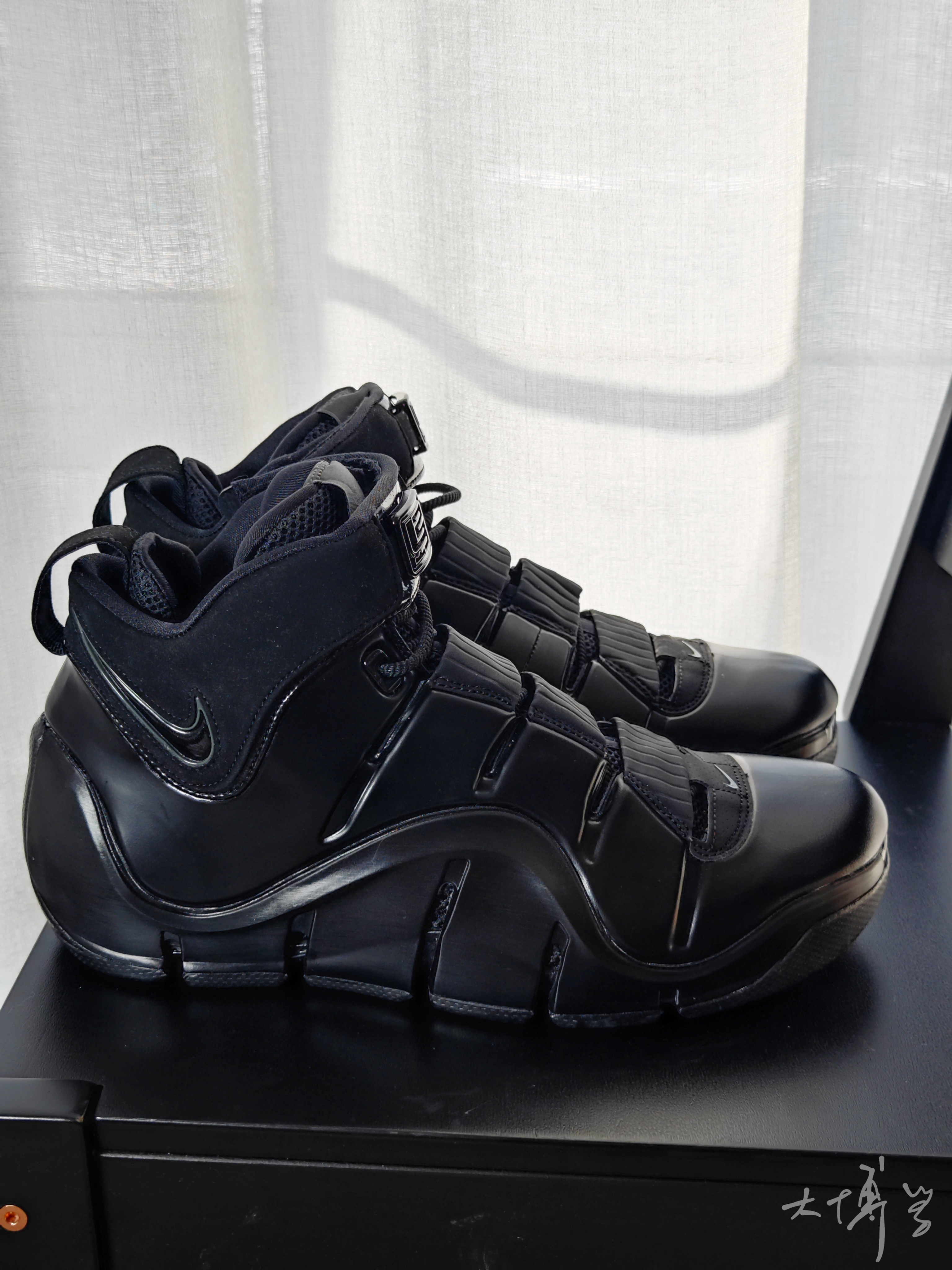 我对勒布朗最初那几代的印象深刻 应该是我最痴迷球鞋的年纪 所以前三代复刻我买了许多 这双勒布朗4我也真的很喜欢 可能是因为类似喷泡一样的鞋面材质 也可能是因为鞋垫里的那款大zoom气垫 总之这双鞋看起来是那么与众不同 全黑色看起来低调中暗藏凶狠