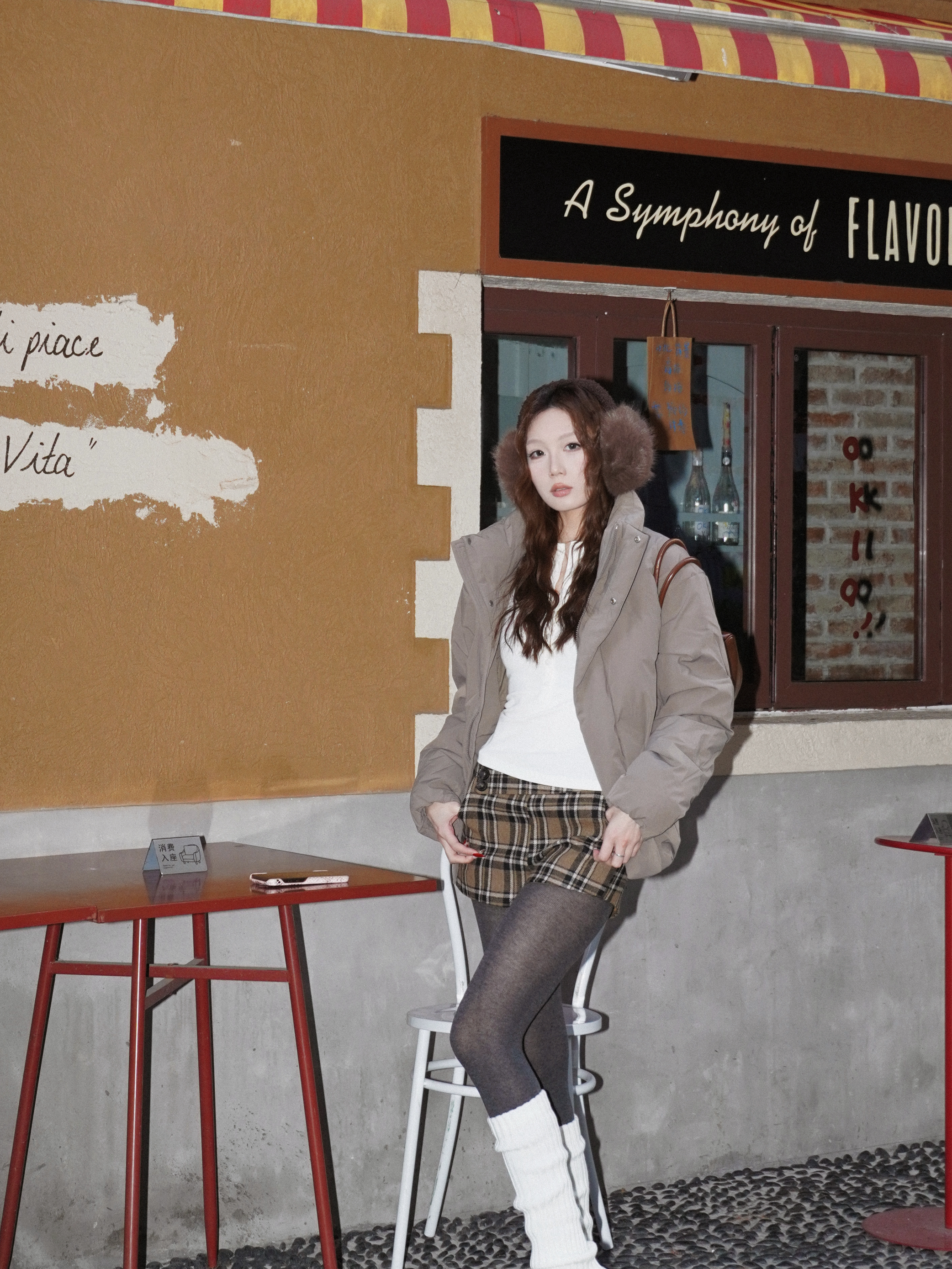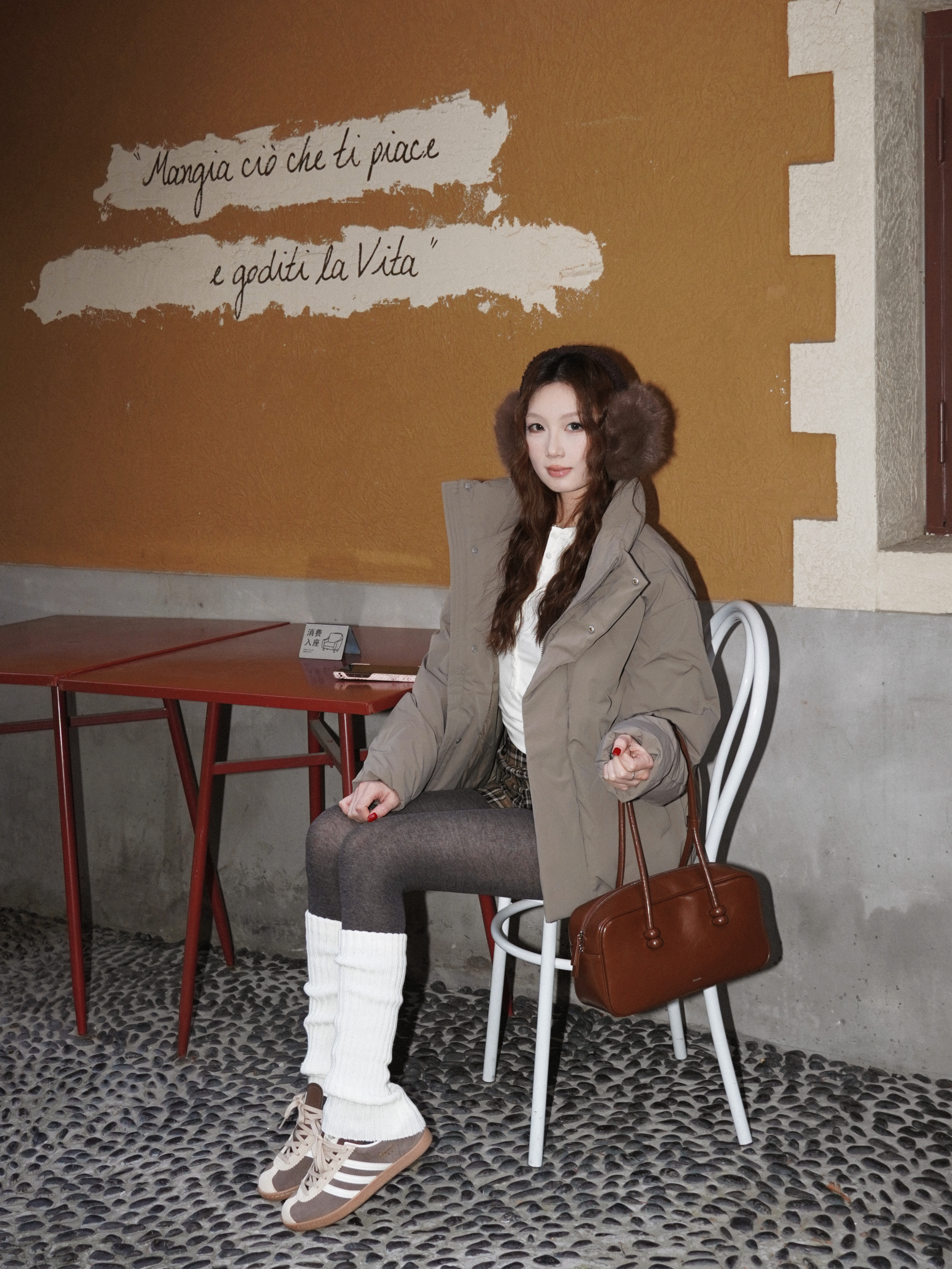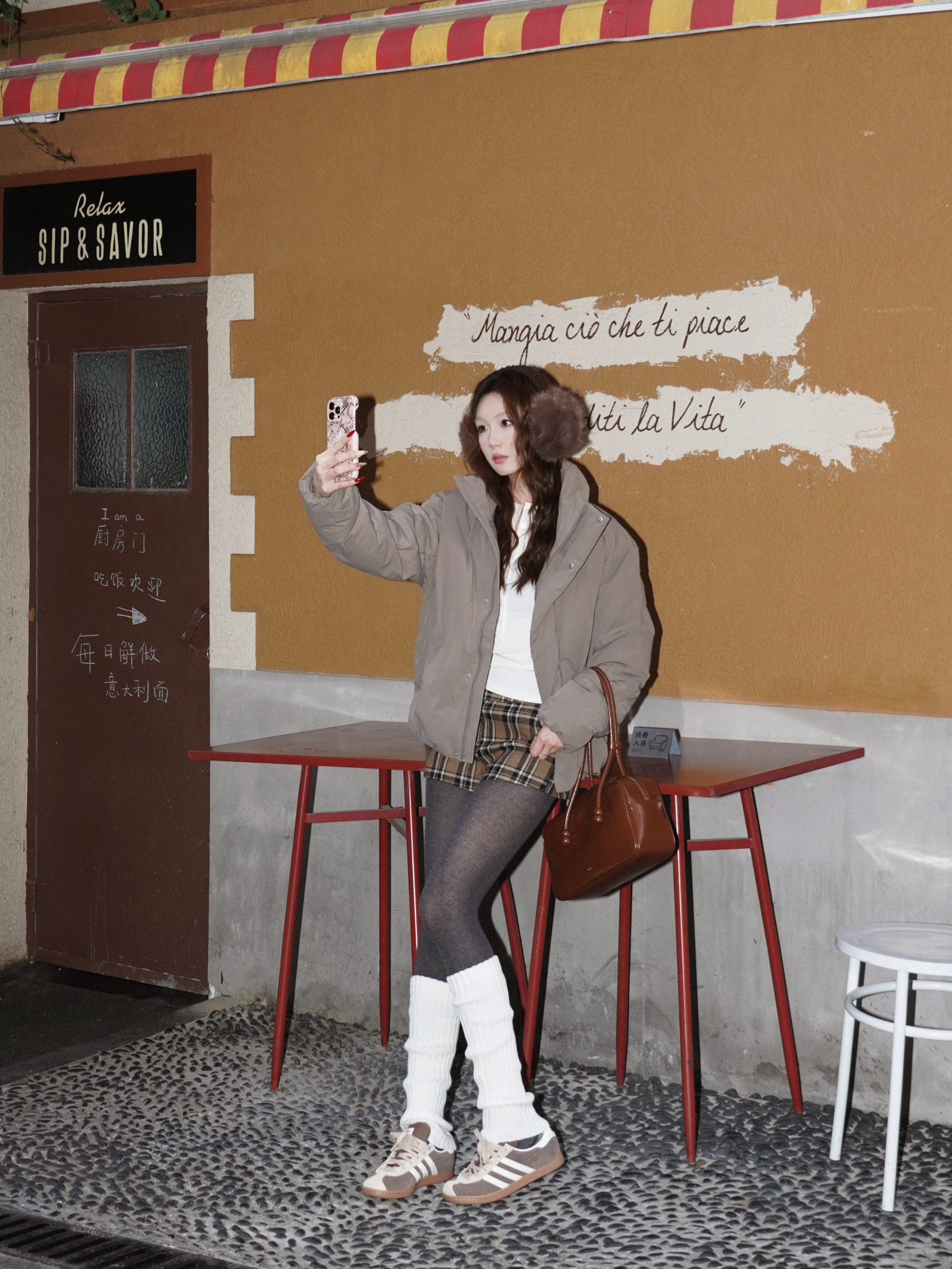 降温了也拦不住想出门的心🧤 浅咖色+黑白色系叠穿真的太适合冬天了 外套选了一件软糯的浅咖色羽绒服🫖 内搭白色长袖T恤悄悄解开两颗纽扣 微微露肤让厚重外套也显得轻盈💭 下半身用了多层叠穿去增强层次感 微透黑色裤袜搭配棕色格纹短裙有种暧昧的层次感 再用白色堆堆腿袜衔接 保暖又增强造型感☃️ 脚上的棕调德训鞋和整体色系呼应👟 棕色波士顿包和毛绒耳罩也是同色系小心思 整体从浅咖→棕→黑→白 色调渐变和谐 ...