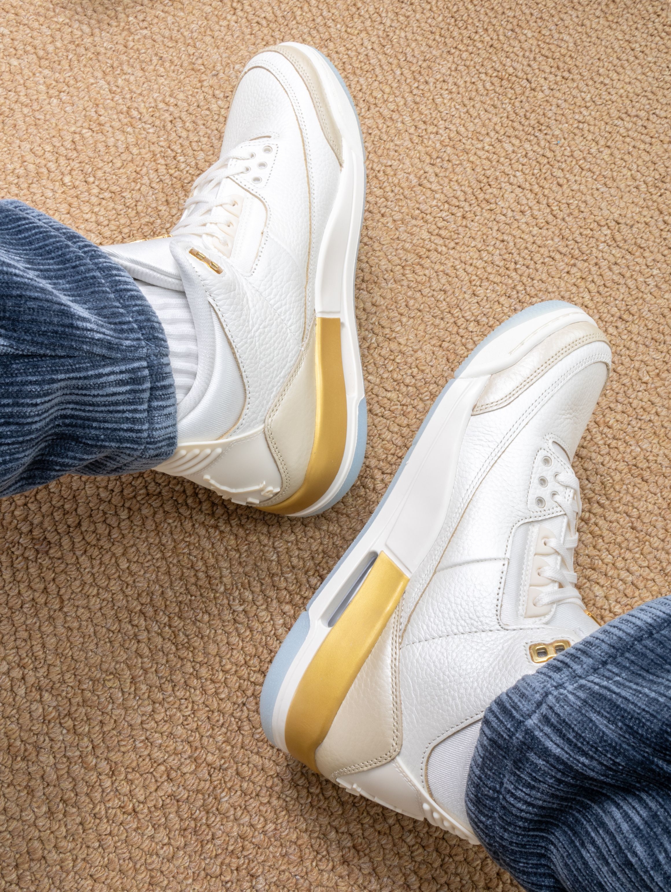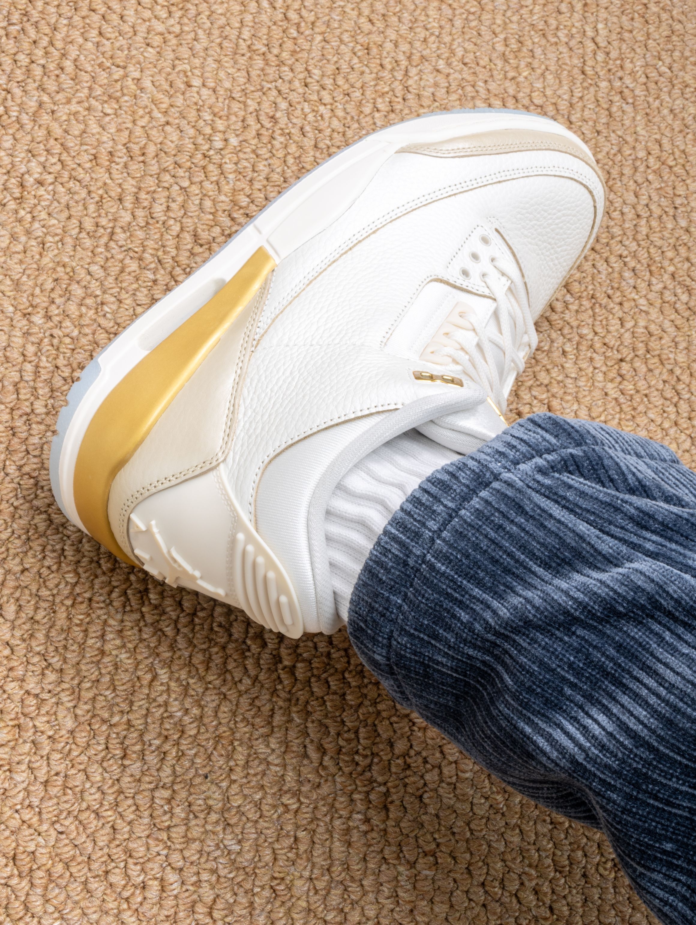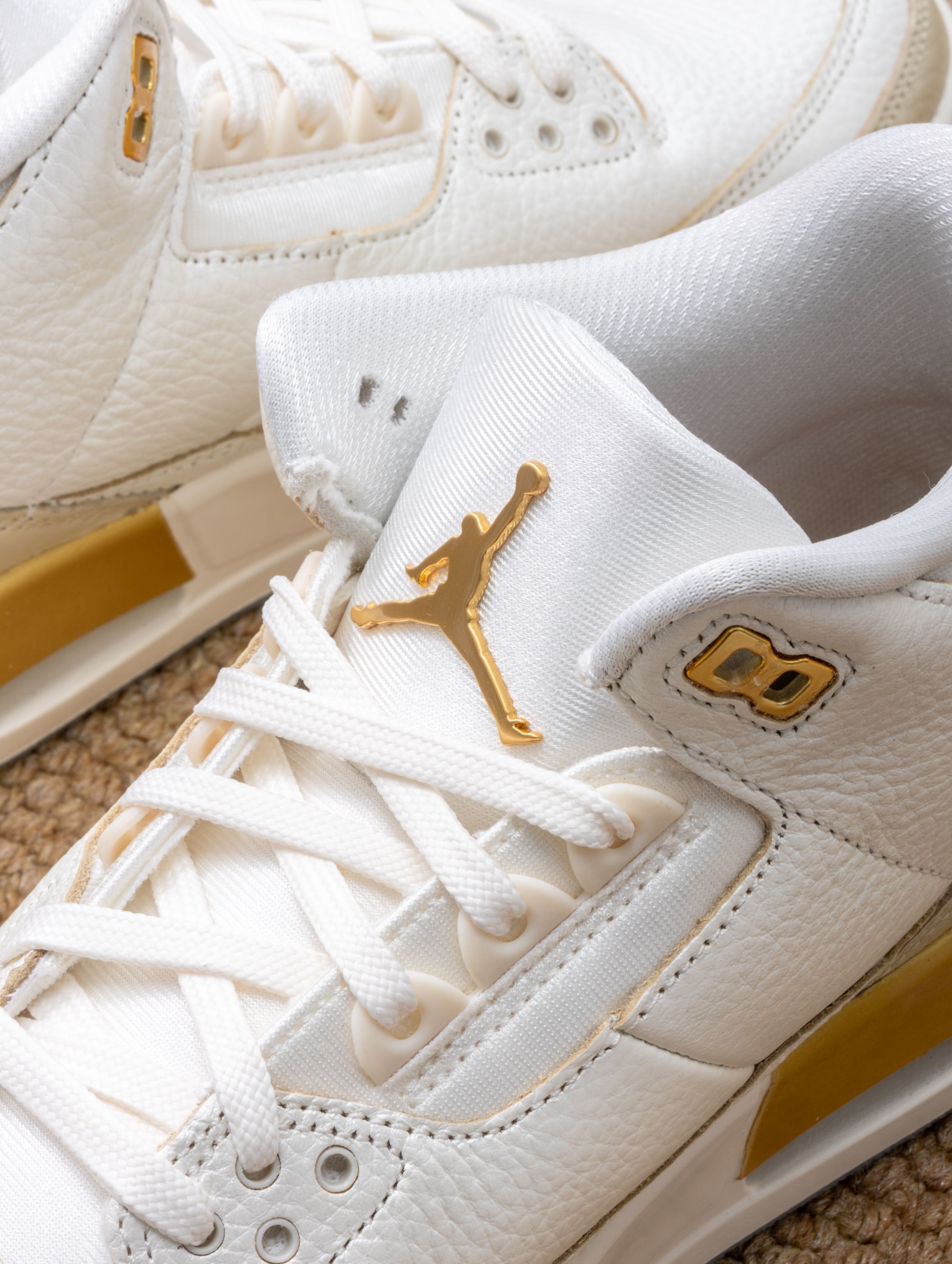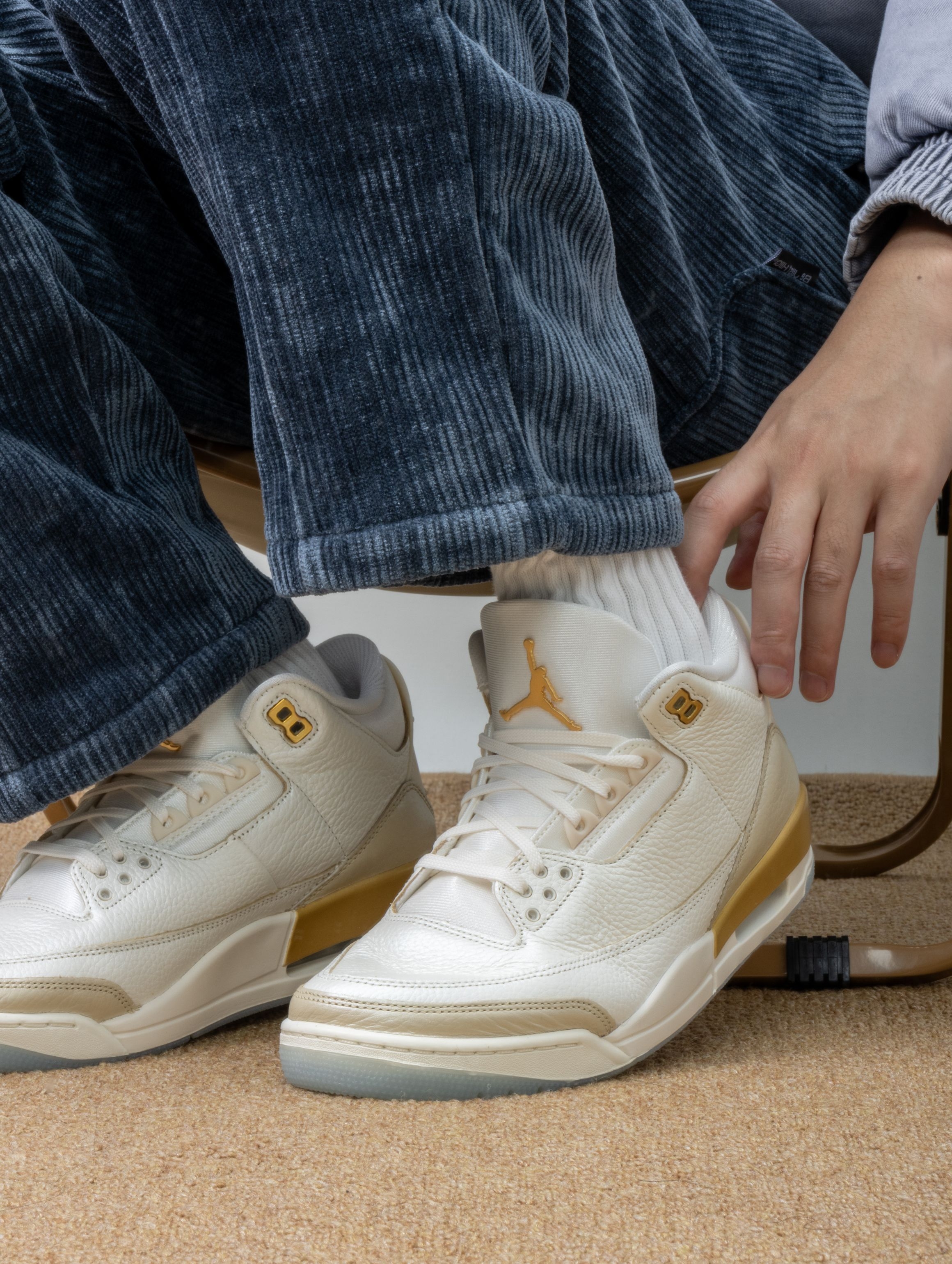这双米白AJ3的实物,真是温柔到心坎里了。 皮质感像初秋晒过的毛绒地毯,奶杏底色上泛起细腻纹路,连鞋盒都透着淡奶油色的光泽。 上脚那刻被惊艳到——皮革内衬异常柔软,全掌Air气垫的缓震带着踏实的回弹感,通勤走半天也不累脚。中帮设计恰好护住脚踝,却丝毫不显笨重。 最近它成了我的穿搭“定心丸”,无论是搭卡其裤营造静奢感,还是配浅蓝牛仔带去一丝复古休闲,它都能让全身搭配透出毫不费力的自在。原来经典无...