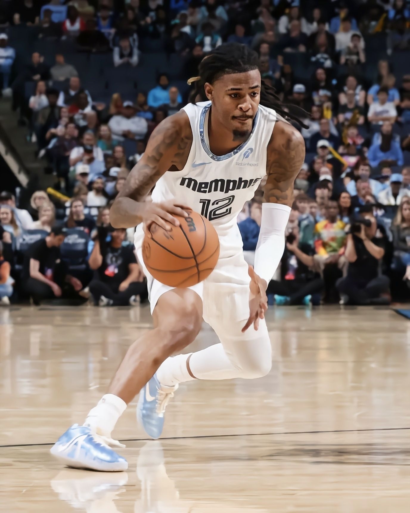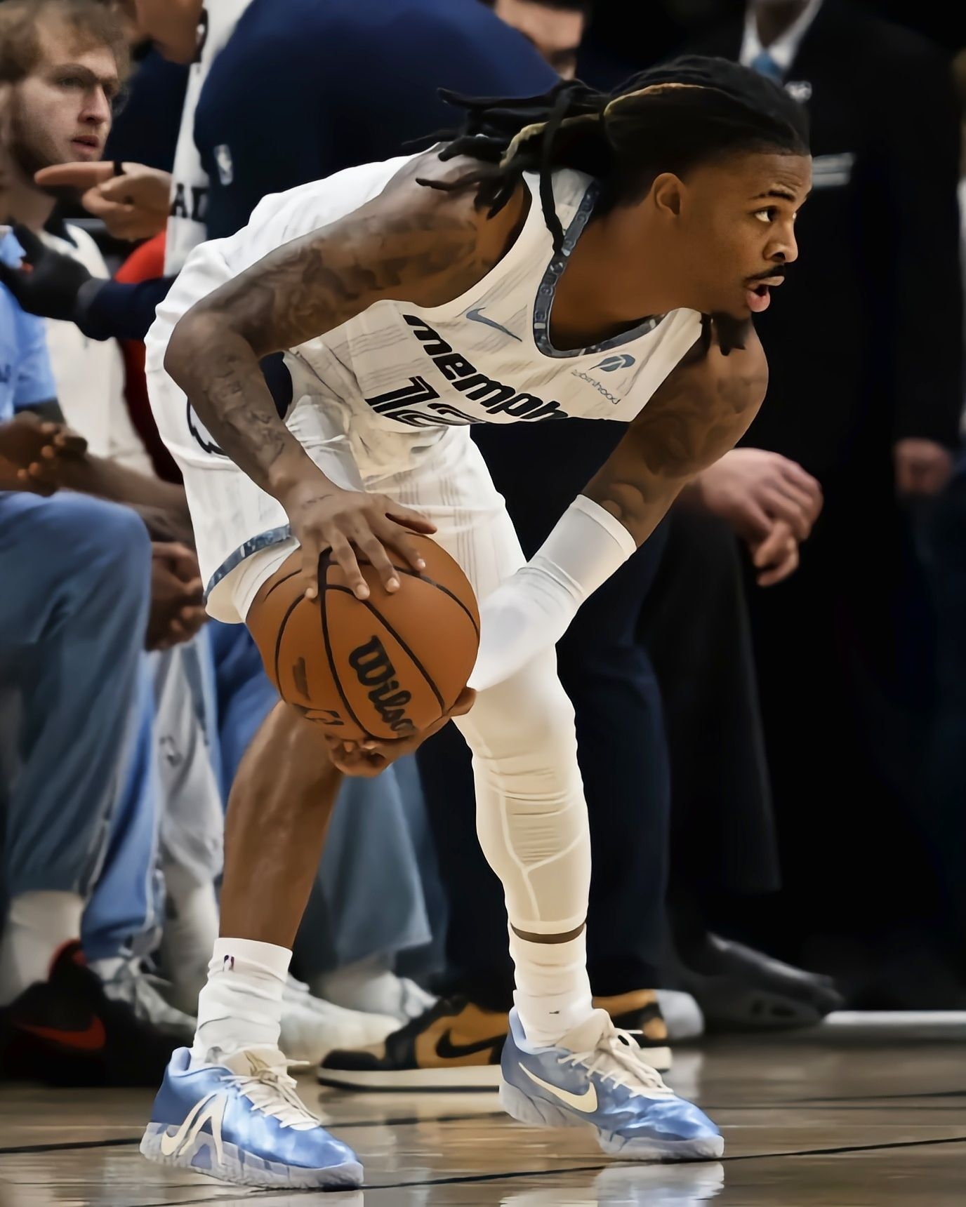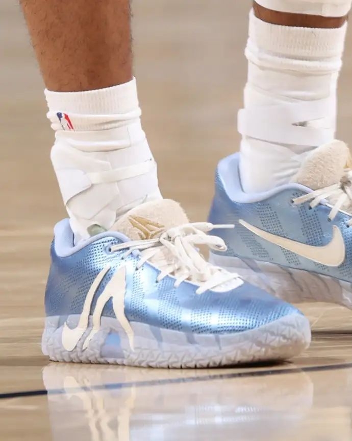今天看灰熊对雄鹿的比赛,直接被莫兰特脚下的冰蓝配色Nike JA3吸睛了! 灰熊125-104赢下雄鹿,莫兰特出场25分钟砍17分4篮板10助攻2抢断,数据依旧在线。而这双冰蓝JA3在球场上的视觉效果真的绝,浅蓝的鞋面搭配透明外底,清爽又有质感,和他的球风一样灵动。 鞋身的透气网面设计看着就很适合实战,鞋型的包裹感从赛场动态里也能看出来,难怪莫兰特这么爱穿自己的签名鞋打比赛。这配色不管是实...