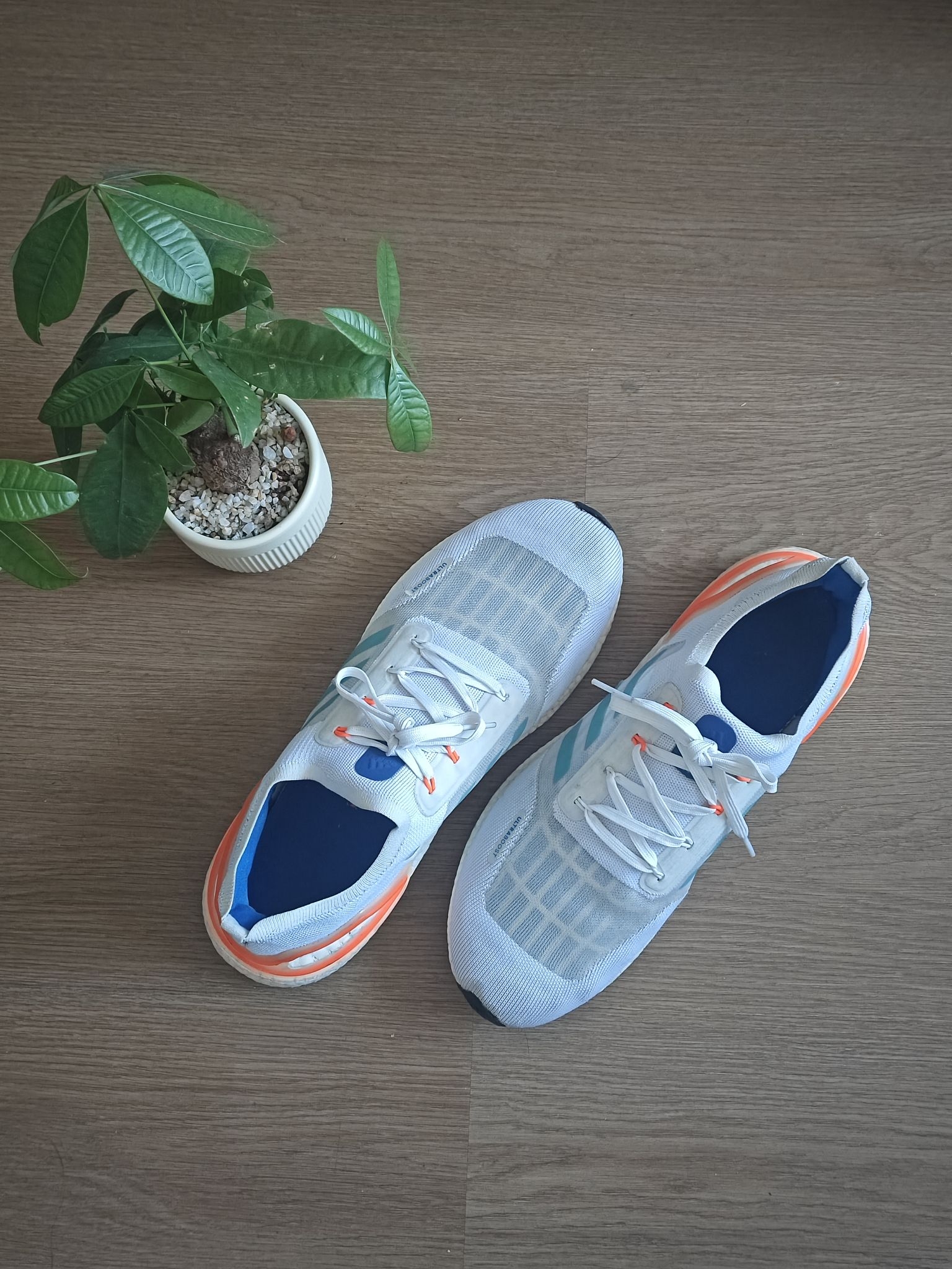 家人们谁懂啊!新入的阿迪Ultraboost Light真的刷新了我对跑鞋的认知,这轻量化做得也太绝了💨 整体是白蓝橙的撞色设计,浅色系超百搭,不管是搭运动裤还是牛仔裤都不违和,鞋身的透气网面夏天穿也不会闷脚,细节处的橙蓝点缀还特别有活力,颜值党表示狠狠爱了✅ 脚感方面直接封神!Boost中底比前代轻了30%,上脚第一感觉就是软弹,走路的时候能明显感觉到中底的回弹,跑起步来落地缓冲超舒服,...