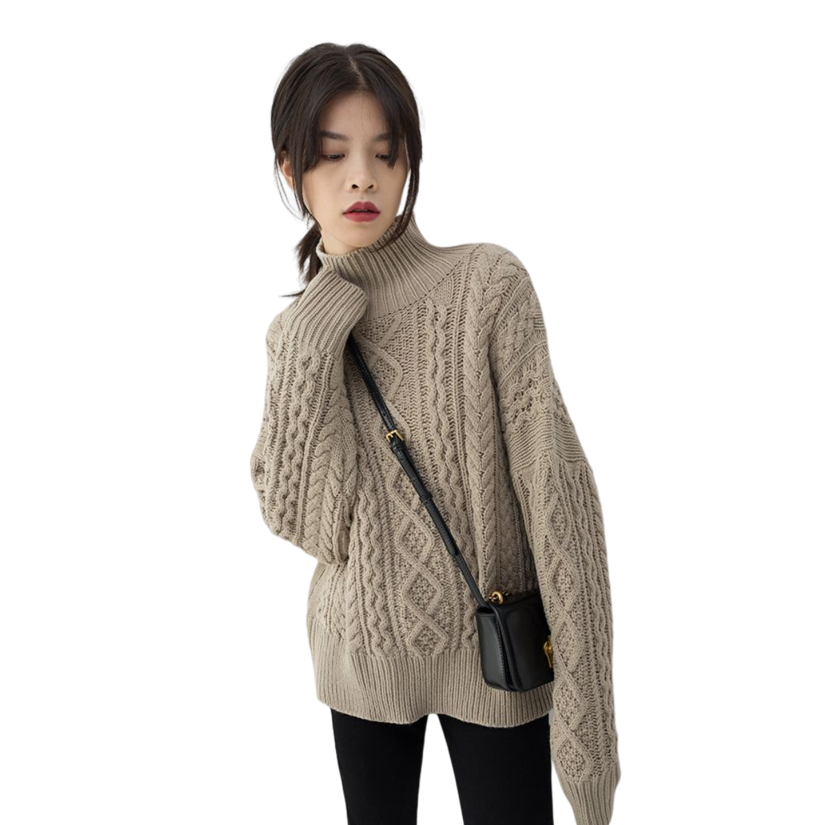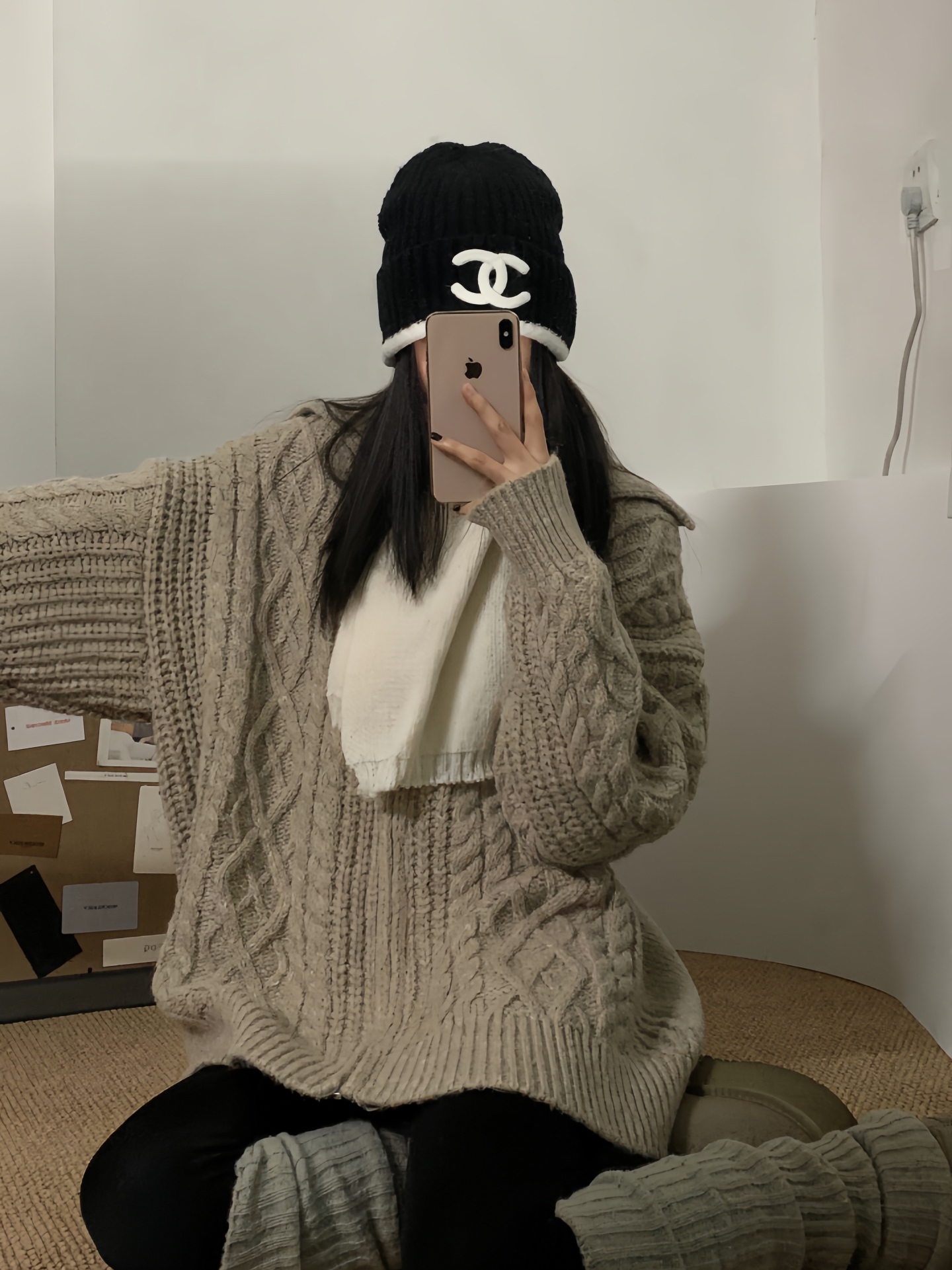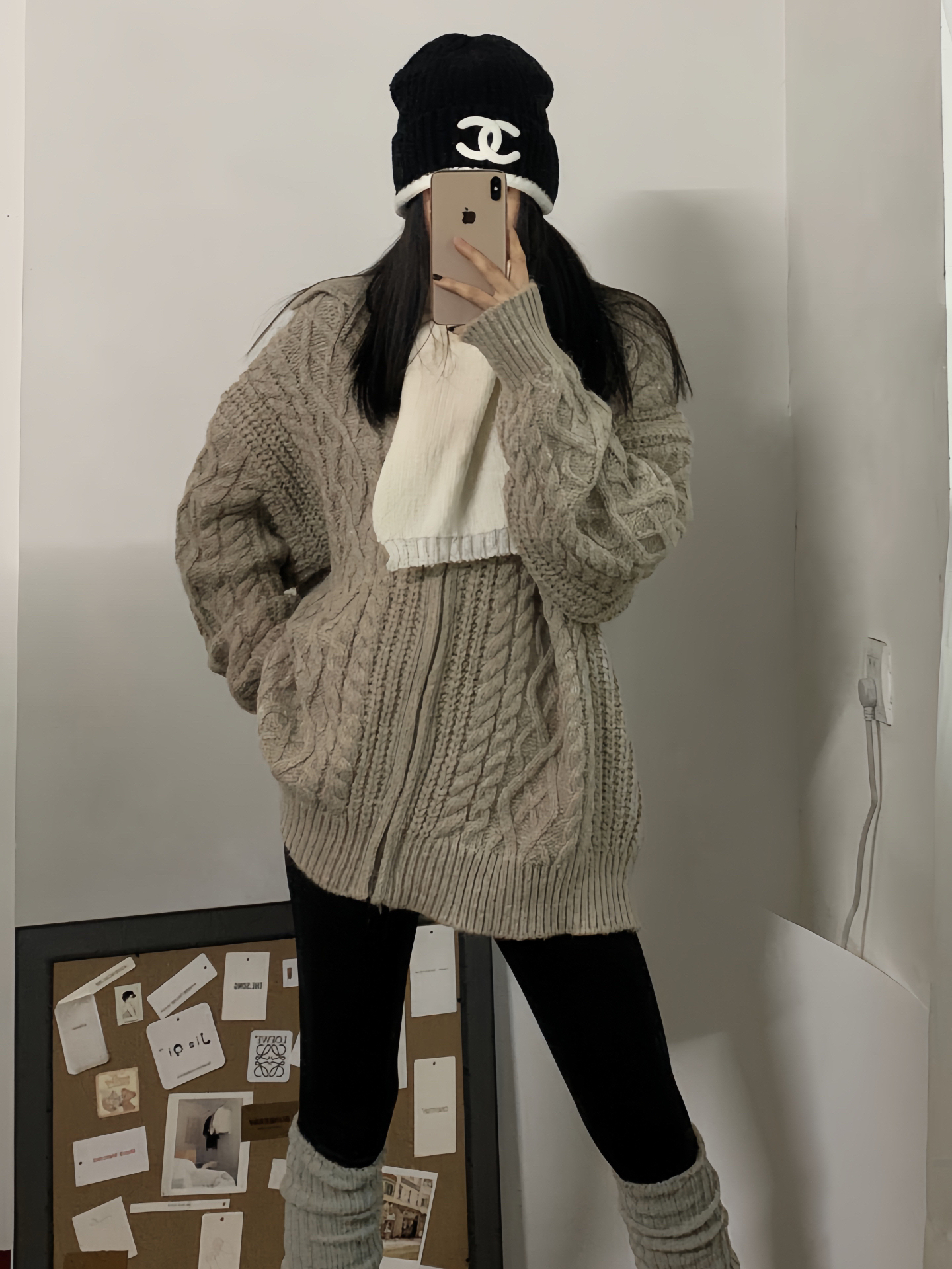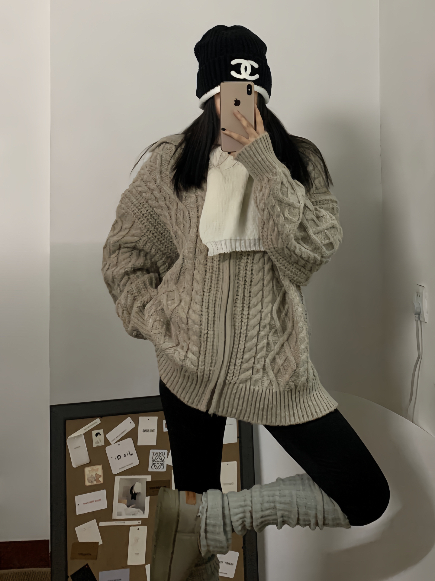 浅卡其绞花拉链开衫裹满蓬松质感,宽宽松松的版型自带慵懒滤镜; 内搭白围巾露个边,像往暖调里掺了点软雾感,细节里全是温柔; 下搭黑裤+同色系堆堆靴,上宽下紧刚好把比例衬得利落,再配顶带标针织帽,暖糯里还藏着点精致小心思~