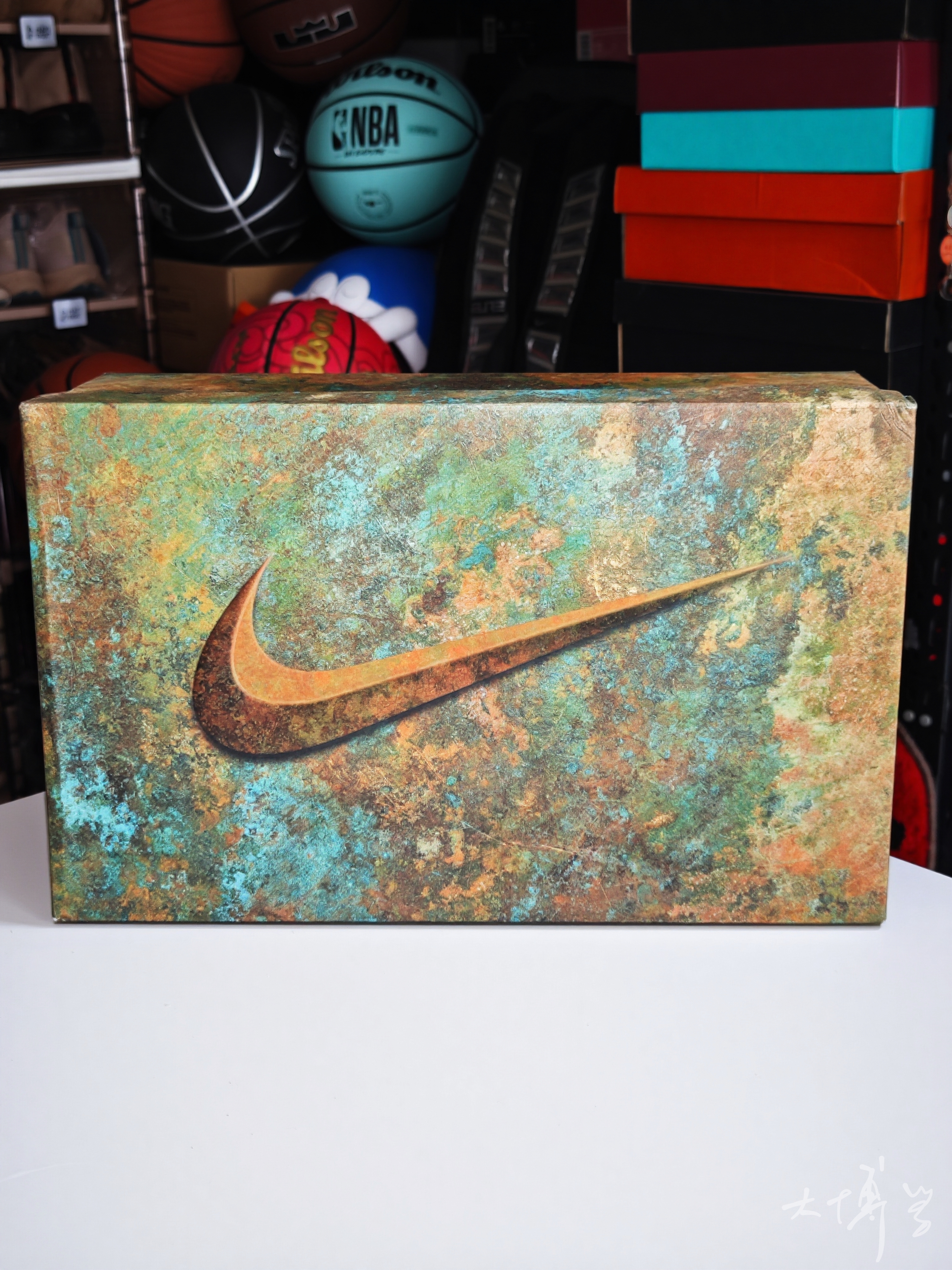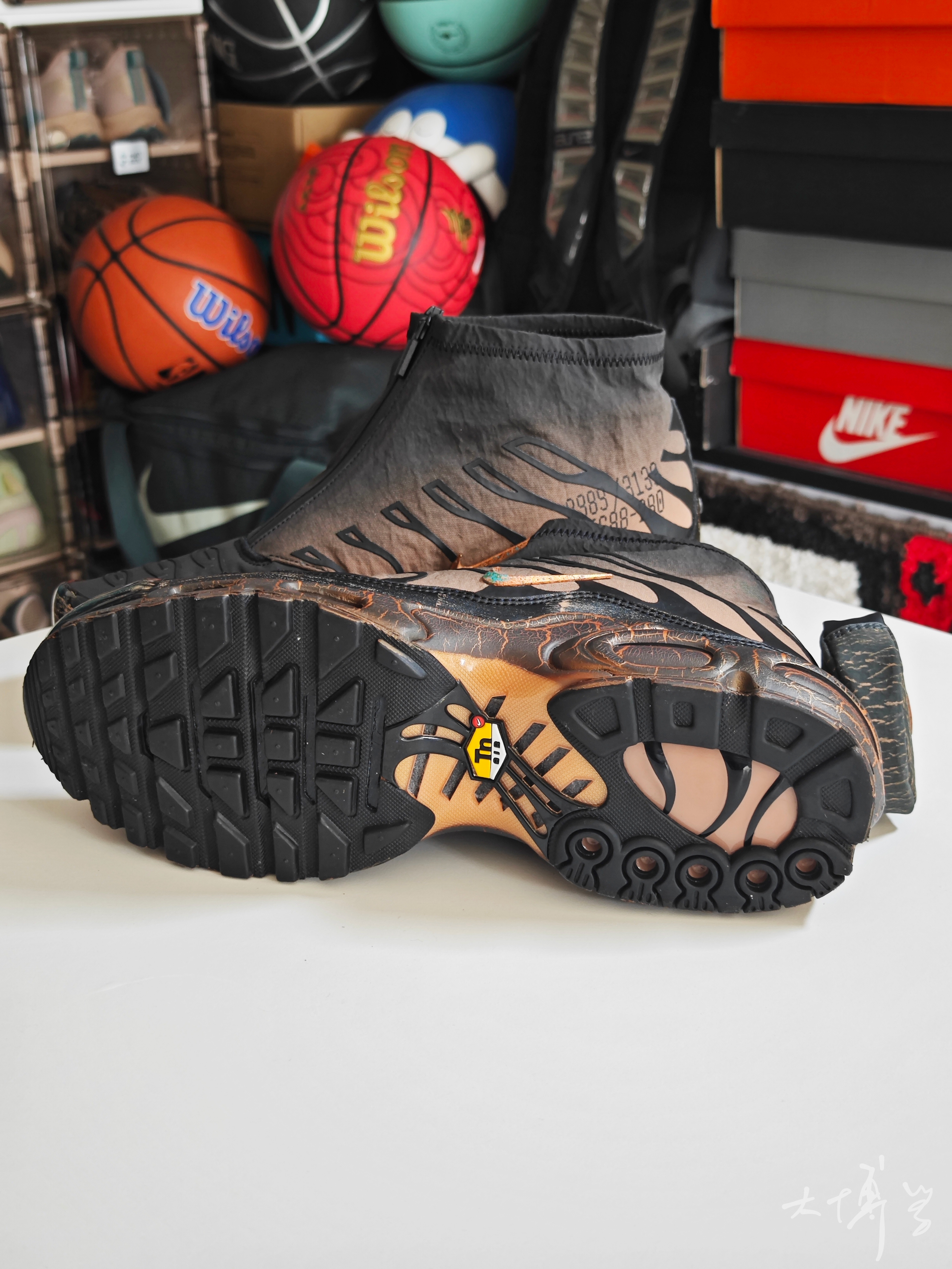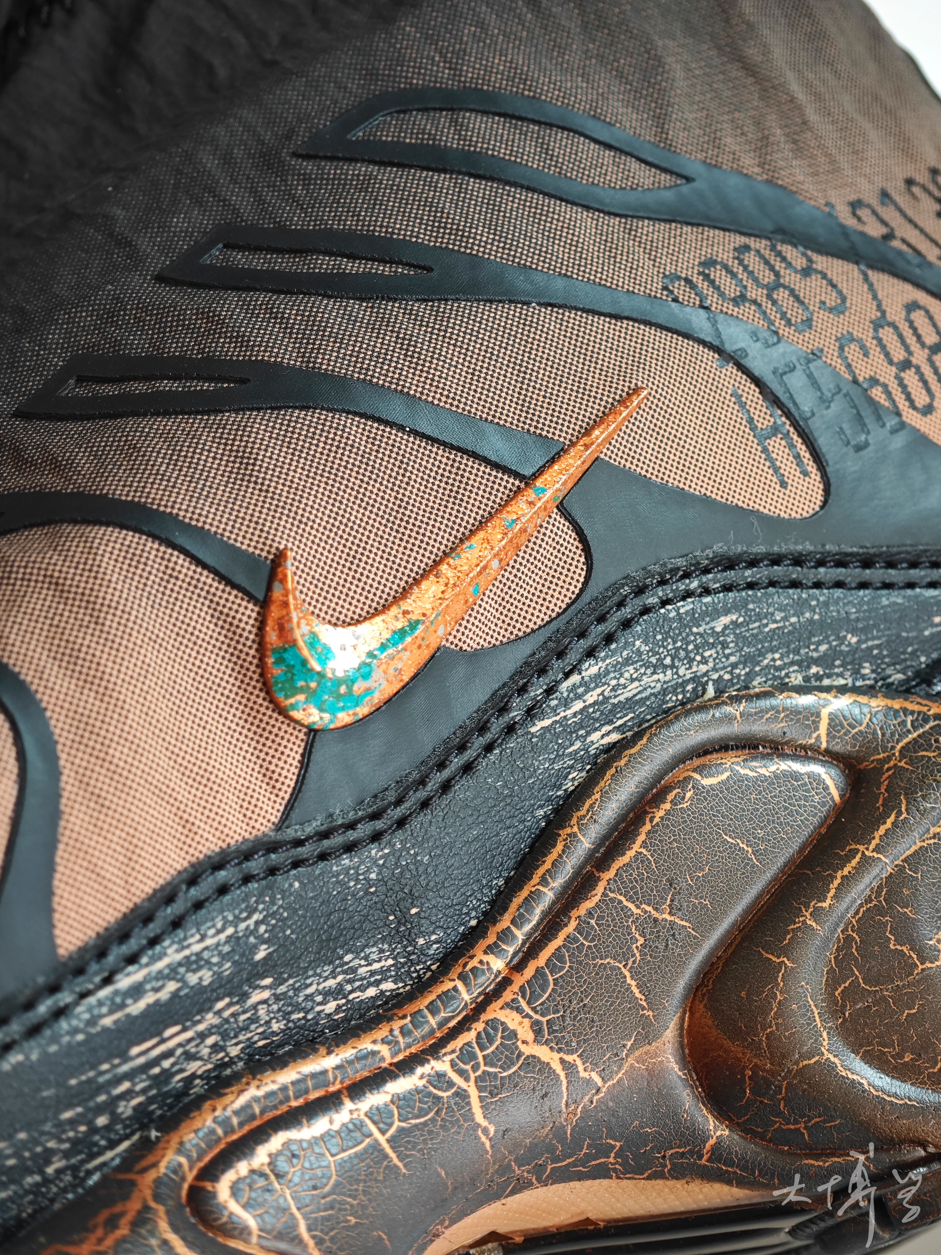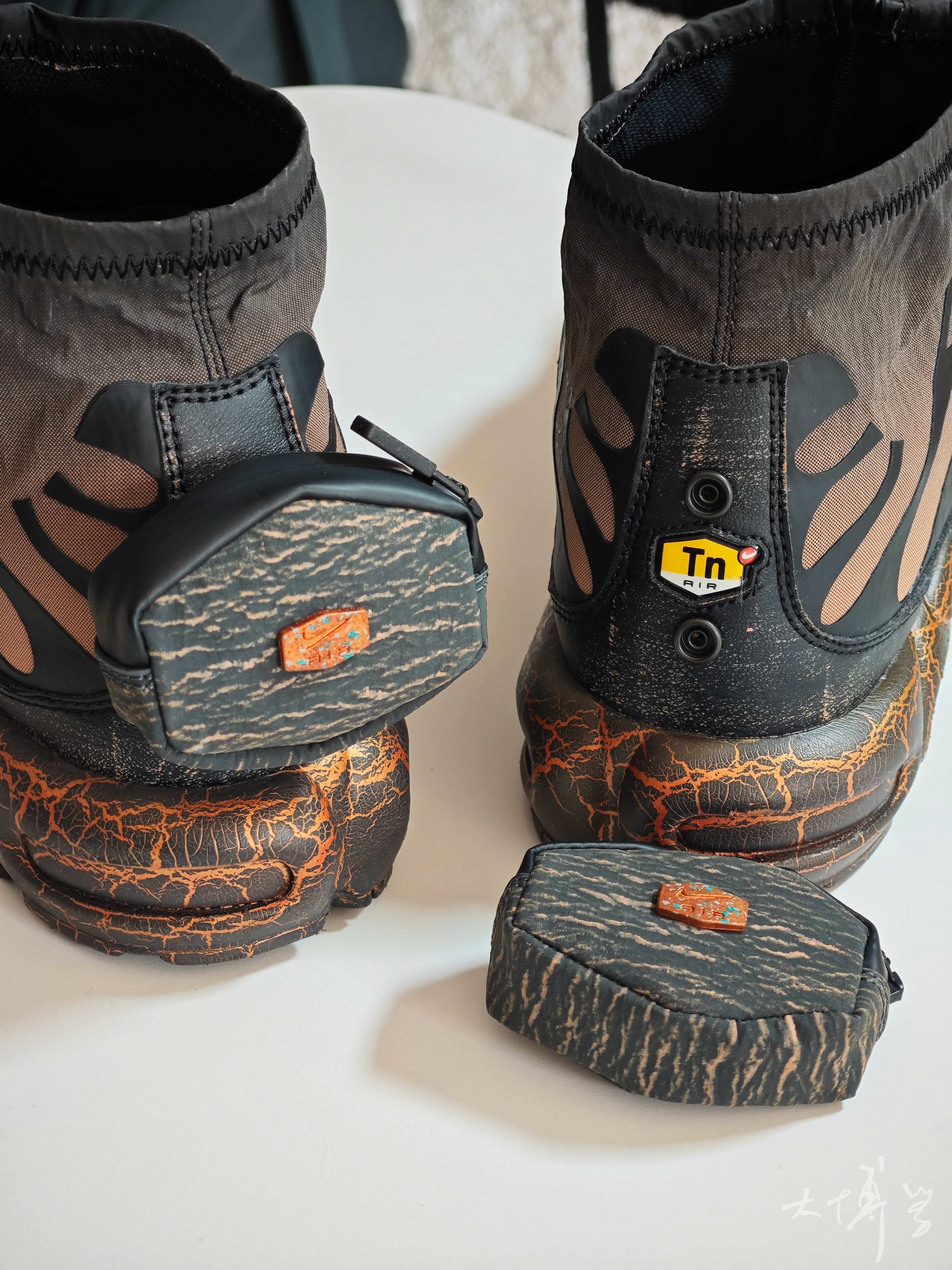 一双从鞋盒到鞋子本身都富有设计感的休闲鞋 蓝本是经典的maxplus鞋型 增加了弹性的鞋盖设计 就像“风一”那种 配色是橙黑色过渡 加上max气垫的裂纹涂装 整体就像在岩浆中浸泡过一样 鞋盒我很喜欢,就像一块被腐蚀的铜块 摸起来也是立体有纹理 鞋跟的小背包可以拆卸 我平常更喜欢拆下来
