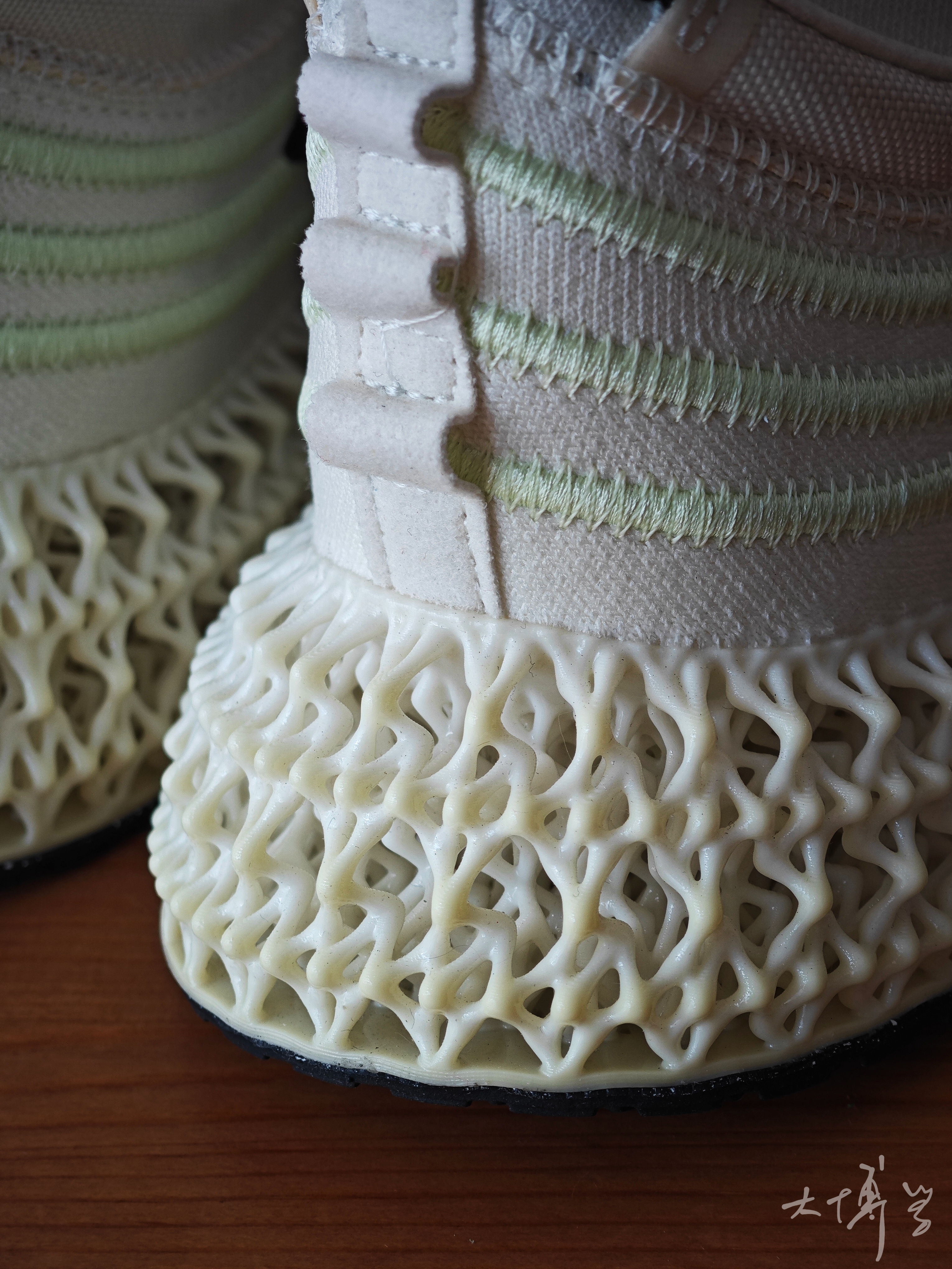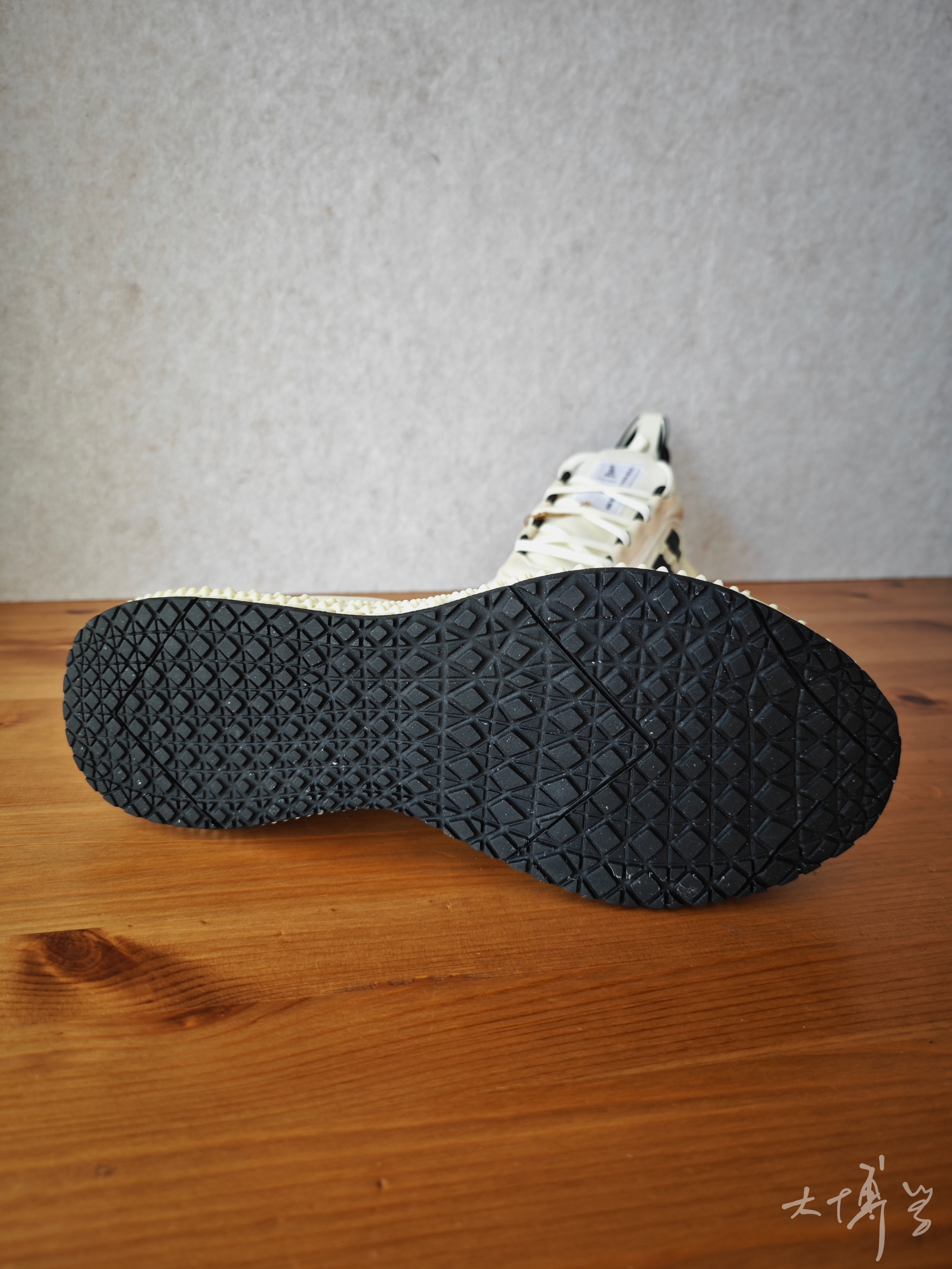 一双阿迪达斯的跑鞋 鞋面类似耐克的flynit那种织物袜套 中底是大面积的3D打印 我猜这是光固化吧?我是外行哈 外底是一层薄薄的橡胶 整体重量很轻,脚感并不是特别软 但是鞋底与众不同的造型 走在上街,依旧会很吸睛
