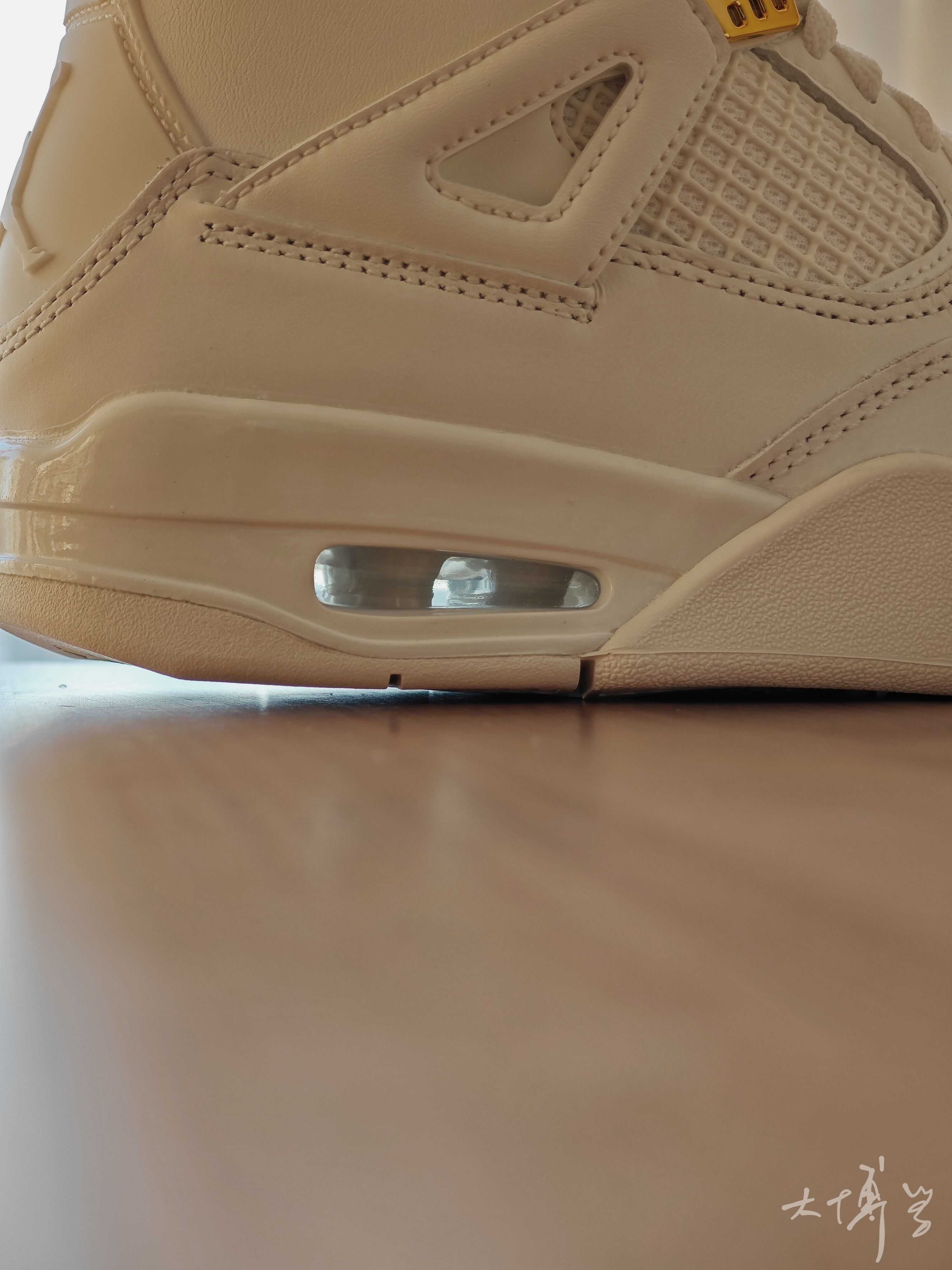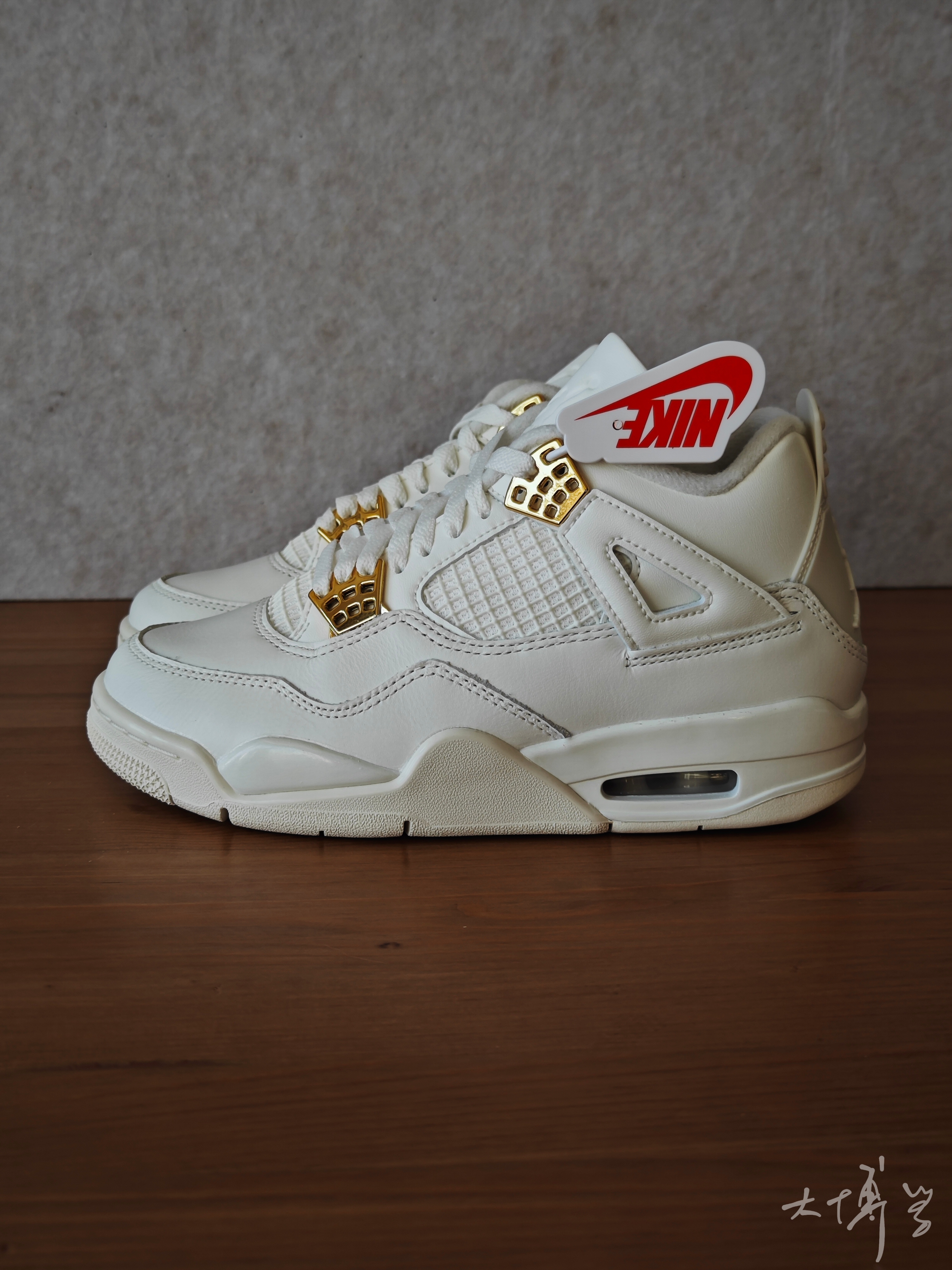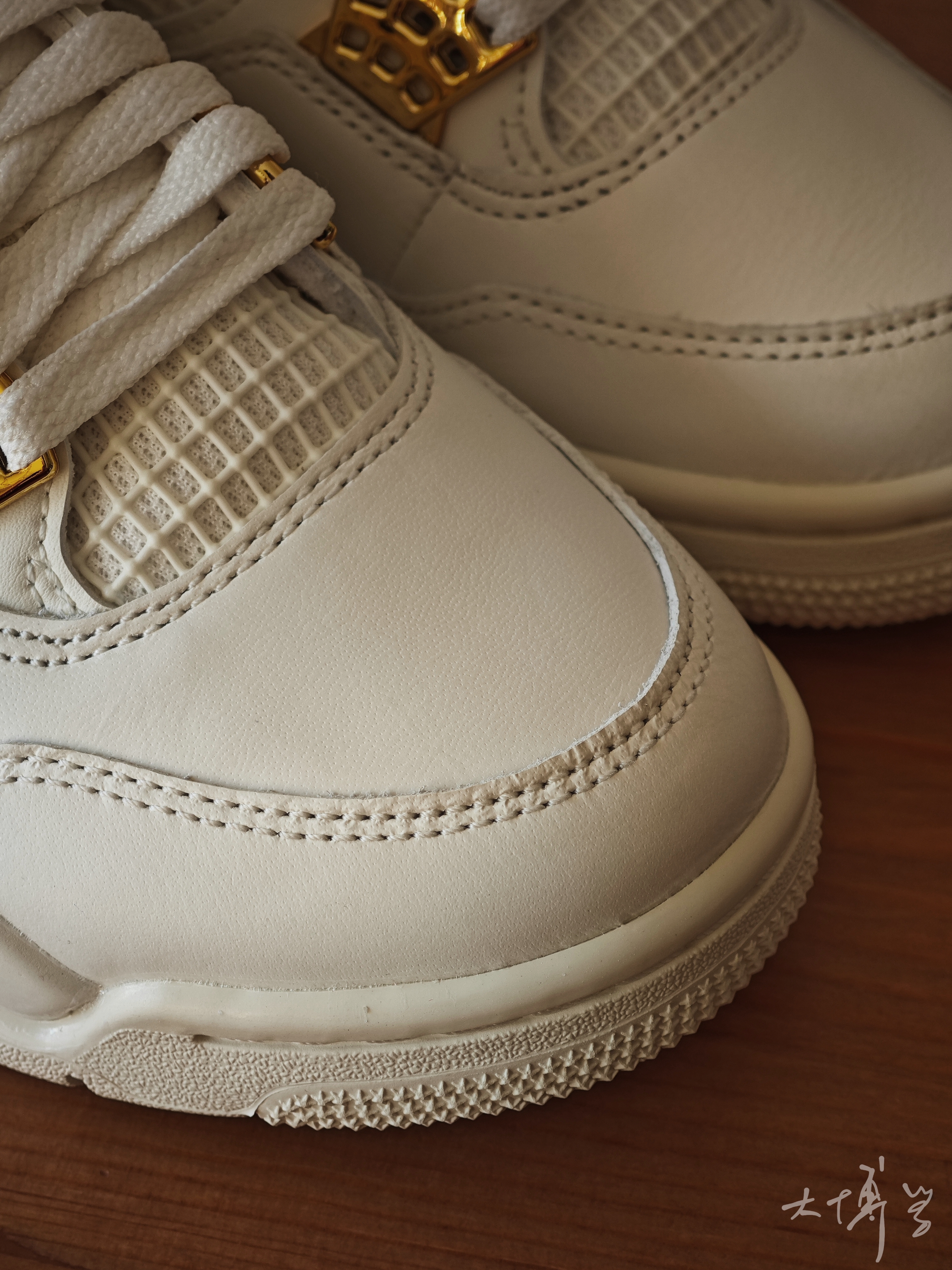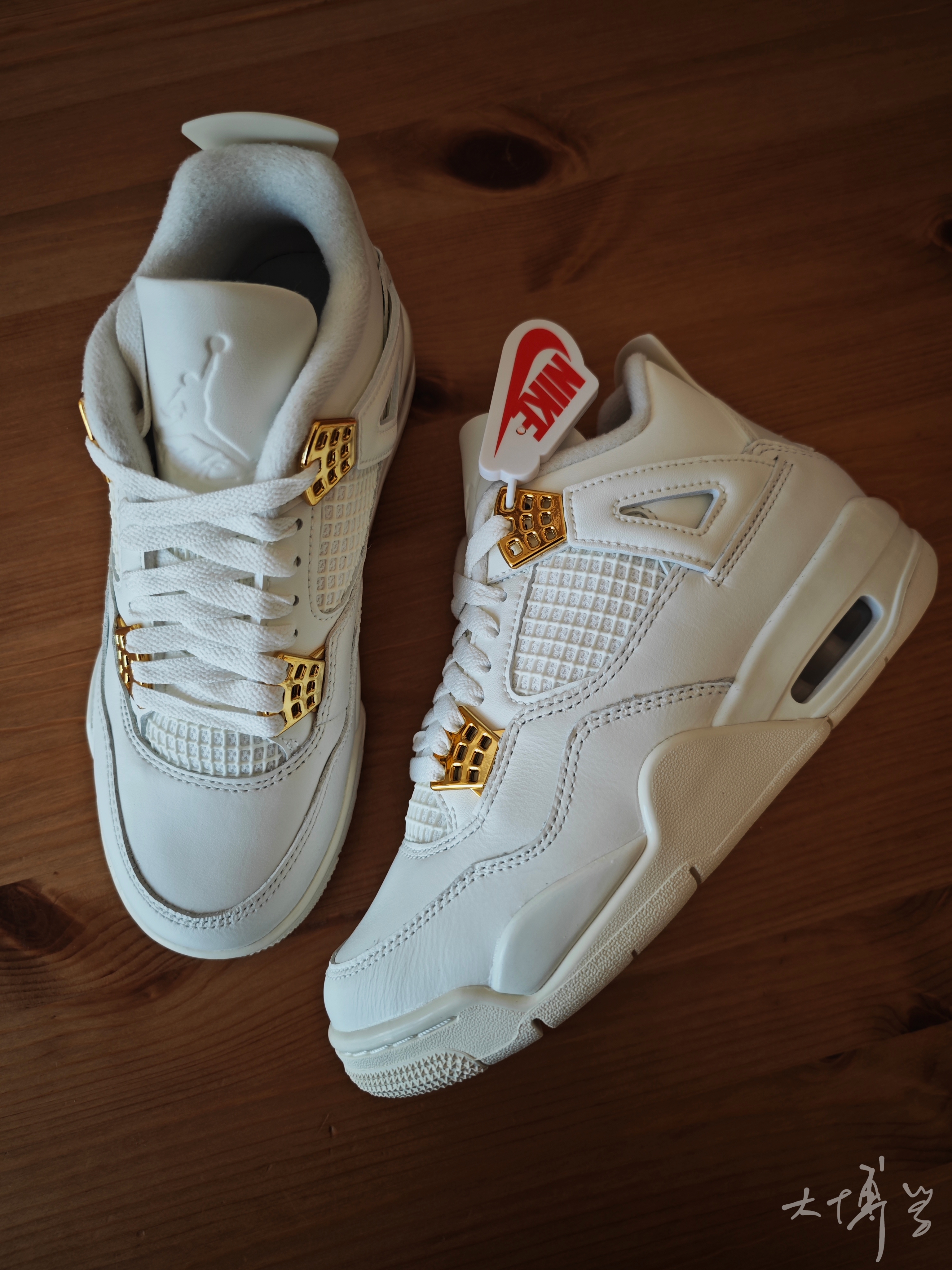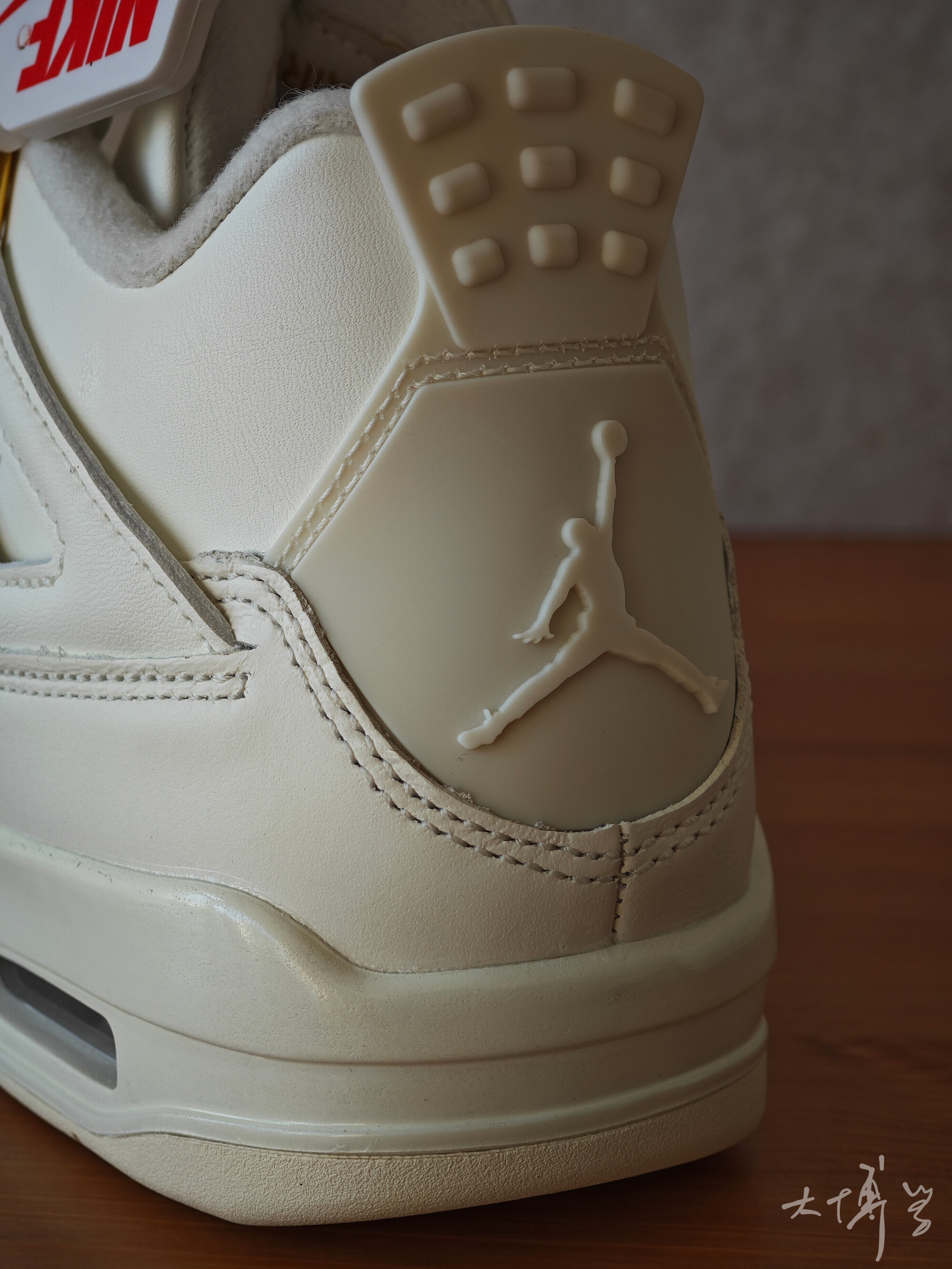 一双女款AJ 4 鞋带扣是金色的 鞋舌上的jumpman不是刺绣也不是涂装 是模具压的 后跟jumpman就是塑料原色,没有上色 鞋面皮革质感很好 整双鞋并没有因为女款的原因进行减配 这点值得称赞